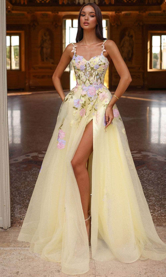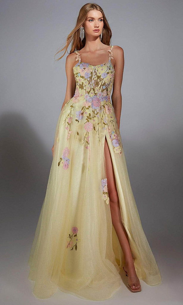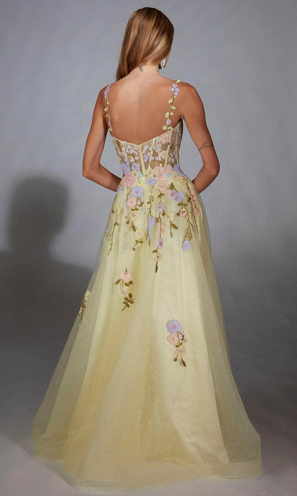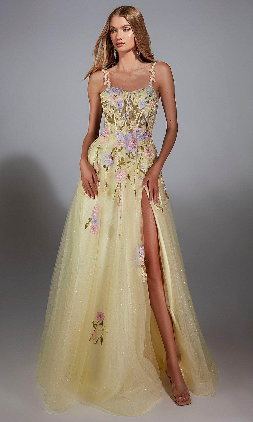 Indulge in the enchanting design of the Alyce Paris 61909, a gown that exudes fairy-tale charm. The sleeveless gown is adorned with floral embroidery, while the illusion corset bodice, embellished straps and sweetheart neckline adds elegance and refinement. A flowing tulle A-line skirt, complete with a daring slit offers a perfect blend of femininity and sophistication. Whether for a prom night or a grand event, the Alyce Paris 61909 is a breathtaking option that ensures a graceful presence. Model is wearing Light Yellow/Multi color.
