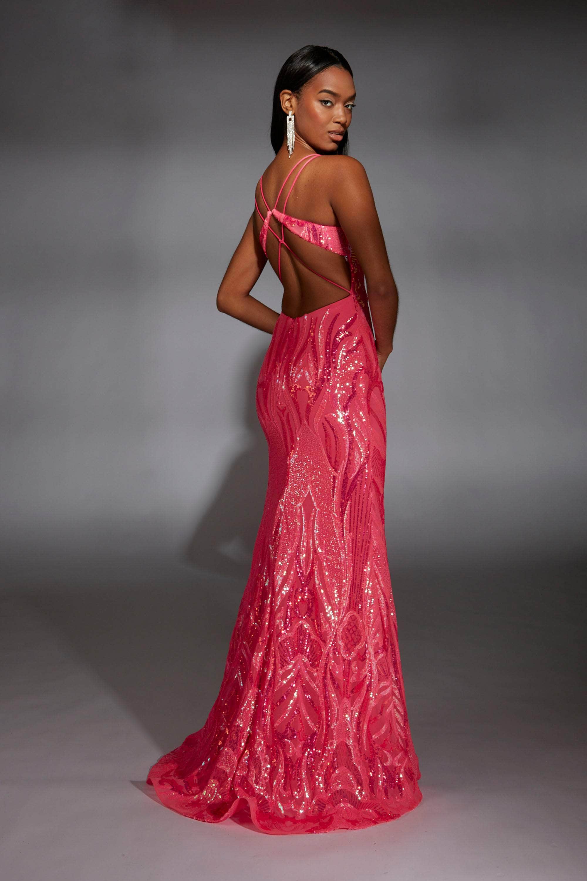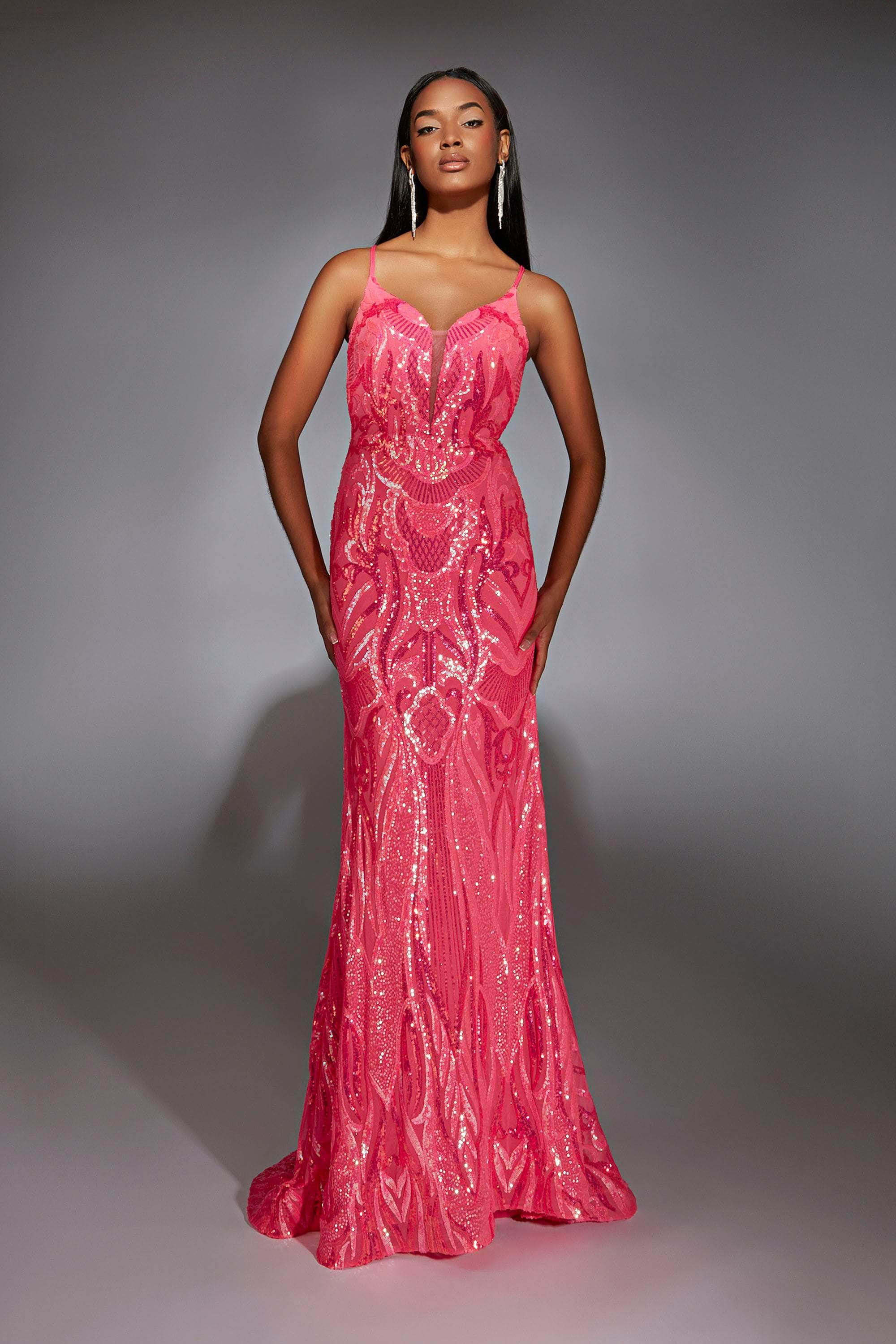 Embrace the dazzling allure of the Alyce Paris 61930, designed for those who love to shine. Crafted with shimmering sequins over mesh fabric, this fitted sleeveless gown contours beautifully to highlight your silhouette. The sheer bodice and plunging V-neckline bring a hint of sultry elegance, while the spaghetti straps add a delicate finishing touch. Elevate your evening with the Alyce Paris 61930, the ultimate choice for a show-stopping appearance. Model is wearing Hot Pink color.