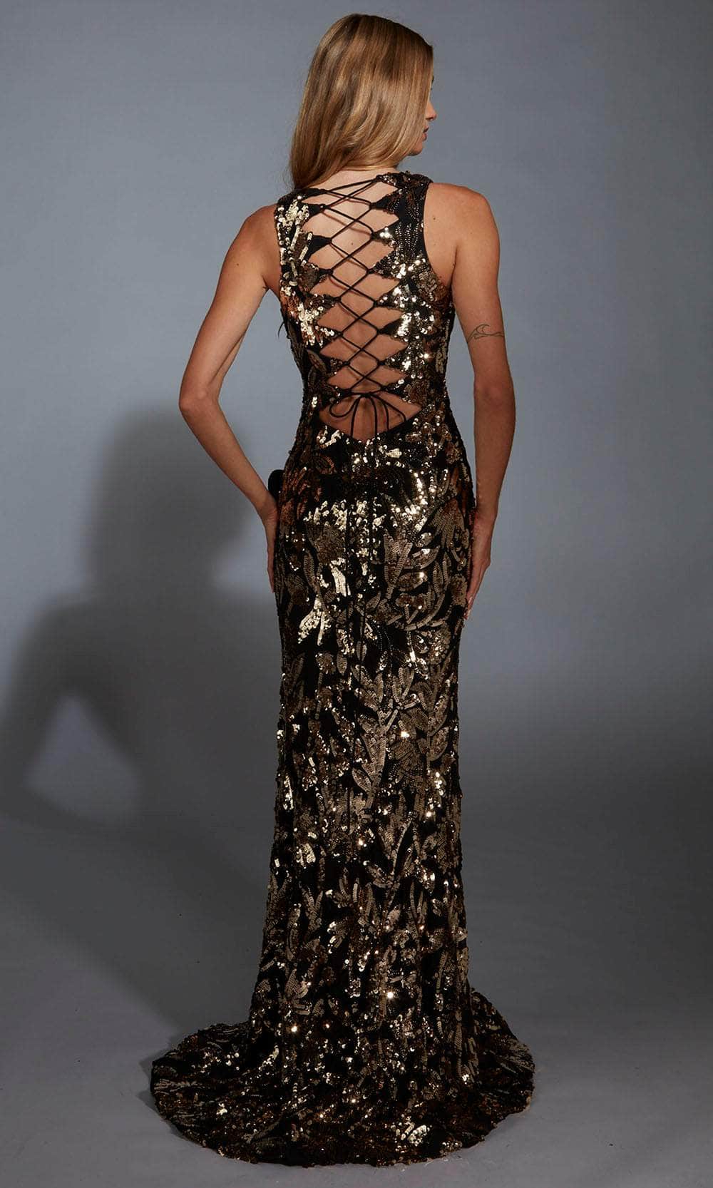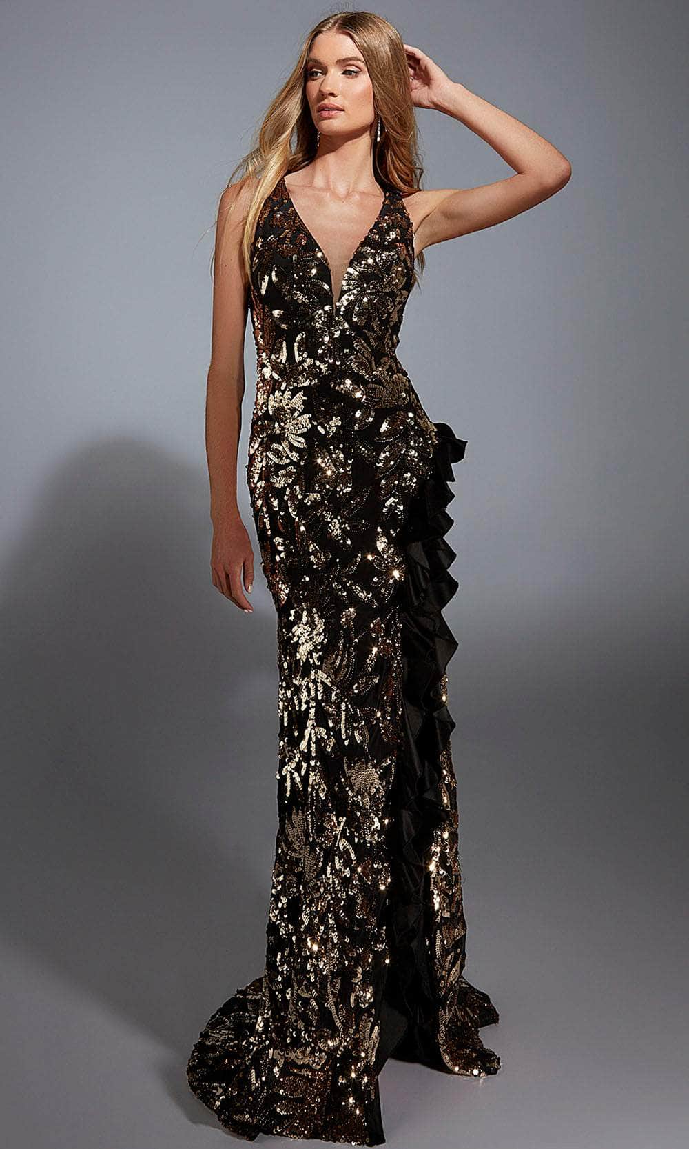 Unleash your inner goddess in the Alyce Paris 61975, a breathtaking sheath gown adorned with metallic floral sequins. The plunging v-neckline exudes confidence, while the ruffled high slit adds drama and movement. Designed with a strappy open back, this gown offers both elegance and an alluring touch. The sheath silhouette hugs the figure beautifully before cascading into a stunning train. Whether attending a gala or making a grand entrance, the Alyce Paris 61975 guarantees a show-stopping presence. Models are wearing Black/Gold, and Ice Blue colors.