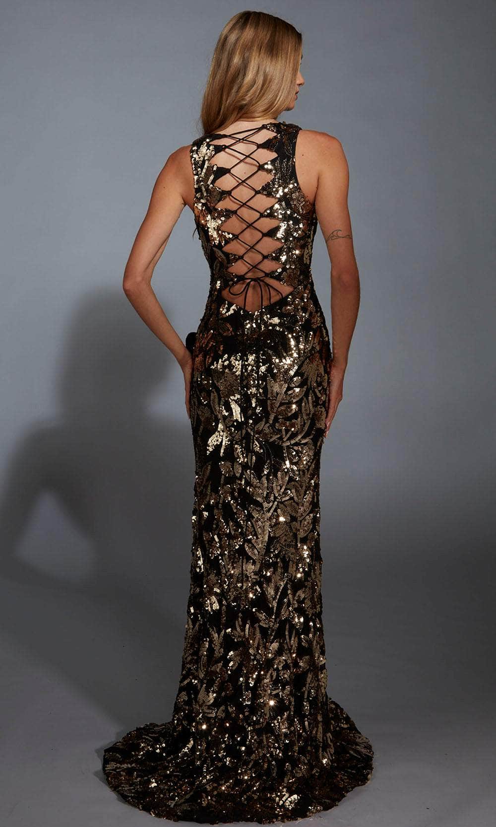 | Details: | Sleeveless Ruffled Slit, Floral Sequin, Strappy Lace-Up Back, Fitted |