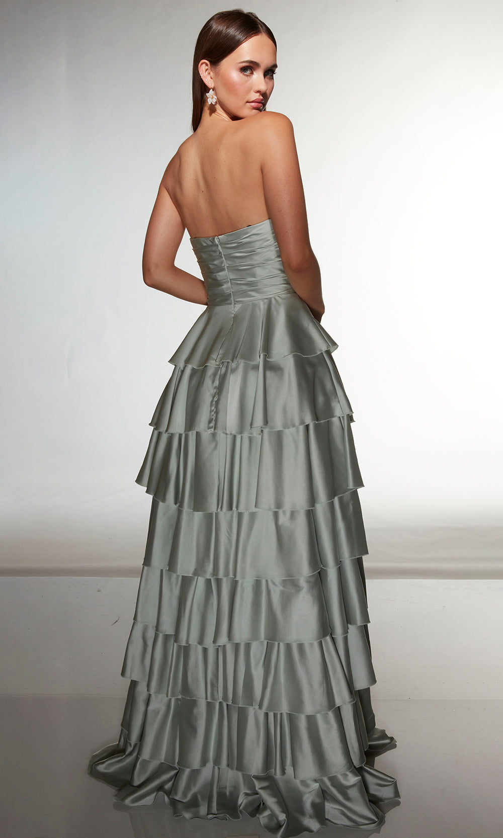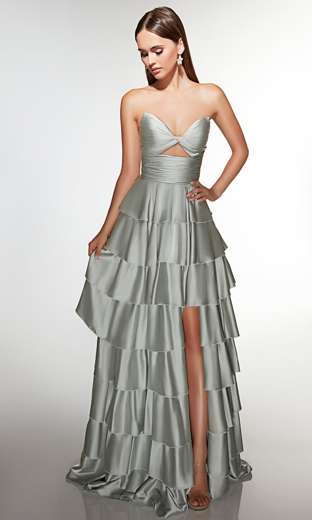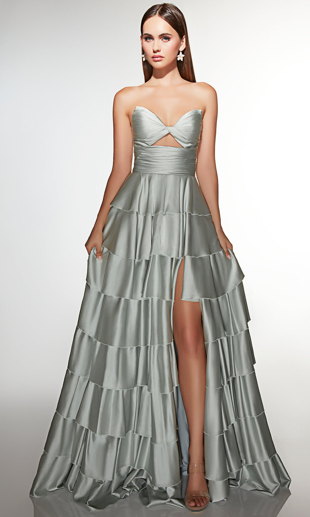 Alyce Paris style 61987 blends modern detailing with a soft, flowing A-line silhouette for a look that is both romantic and fashion forward. The strapless twisted sweetheart neckline highlights the bodice with a unique focal point, complemented by a subtle cutout for added interest. A ruched waist shapes the figure beautifully before transitioning into a tiered ruffle skirt that moves with effortless grace, while the high slit adds a bold finishing touch. Completed with a refined zipper back, this gown offers polished elegance from every angle. Elevate your special occasion moment with Alyce Paris style 61987. Model is wearing celadon color.