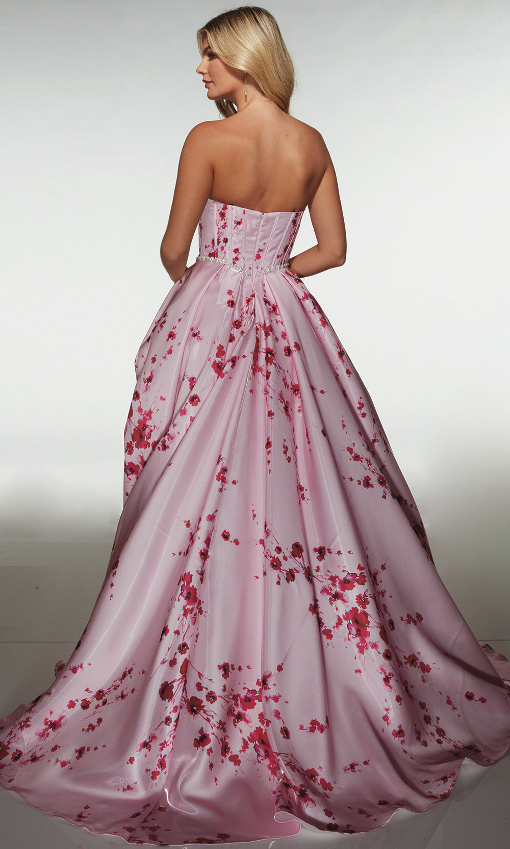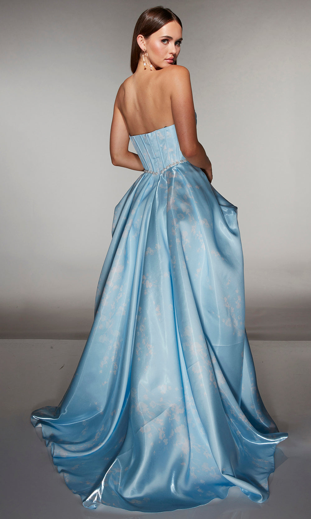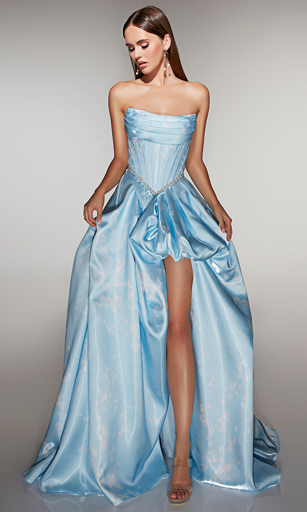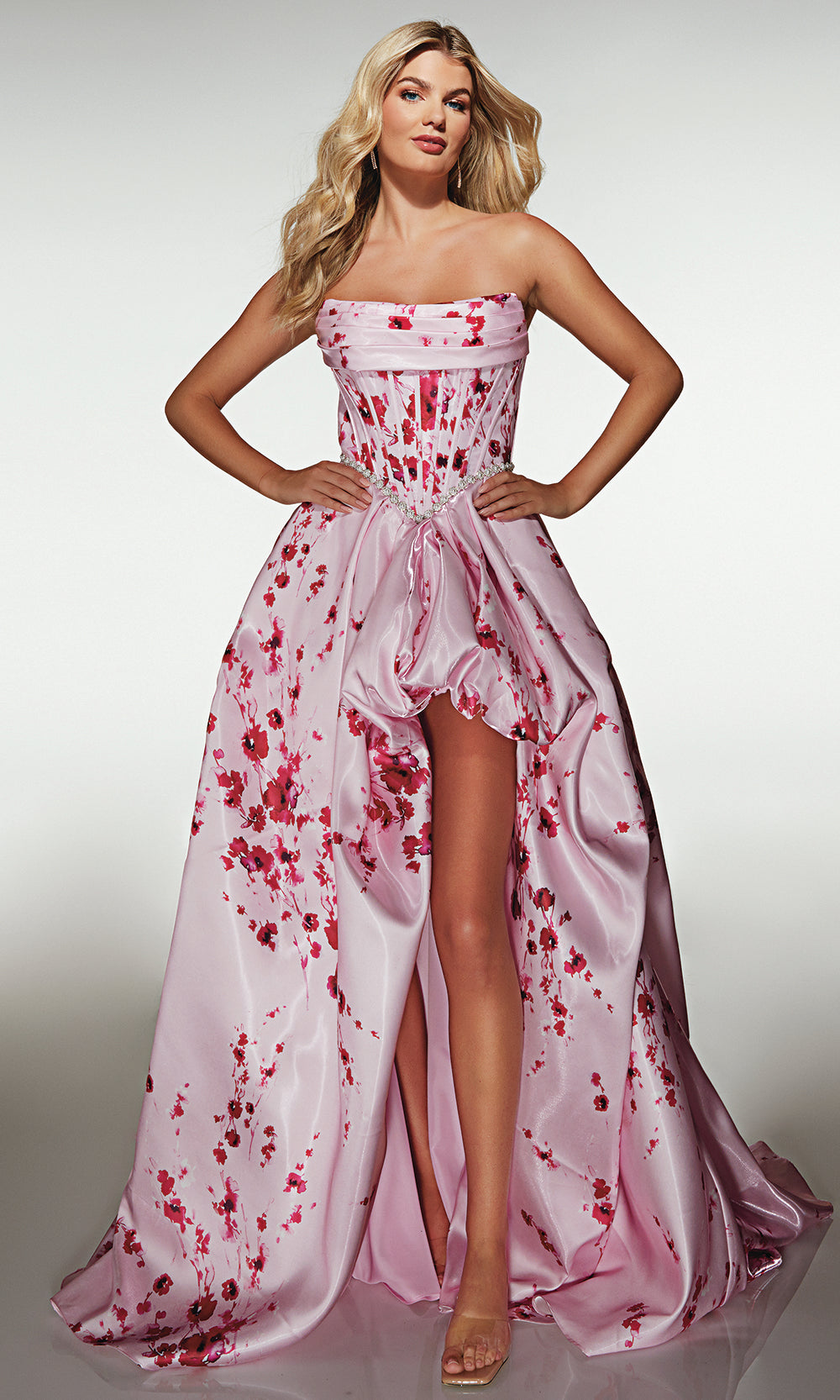 Alyce Paris Style 61989 makes an unforgettable entrance with its dramatic couture aesthetic. The strapless structured bodice features sculpted corsetry that enhances the waist, while shimmering gemstone accents highlight the natural curves for a refined finish. A sculpted overskirt cascades into a voluminous sweep, opening in front to reveal a bold slit for modern movement and allure. Designed for those who love timeless glamour with a contemporary twist, this gown transforms formal moments into red-carpet experiences. Step into Alyce Paris Style 61989 to make your occasion one of luxury, confidence, and breathtaking beauty. Model is wearing Cherry Blossom and Light Blue colors.
