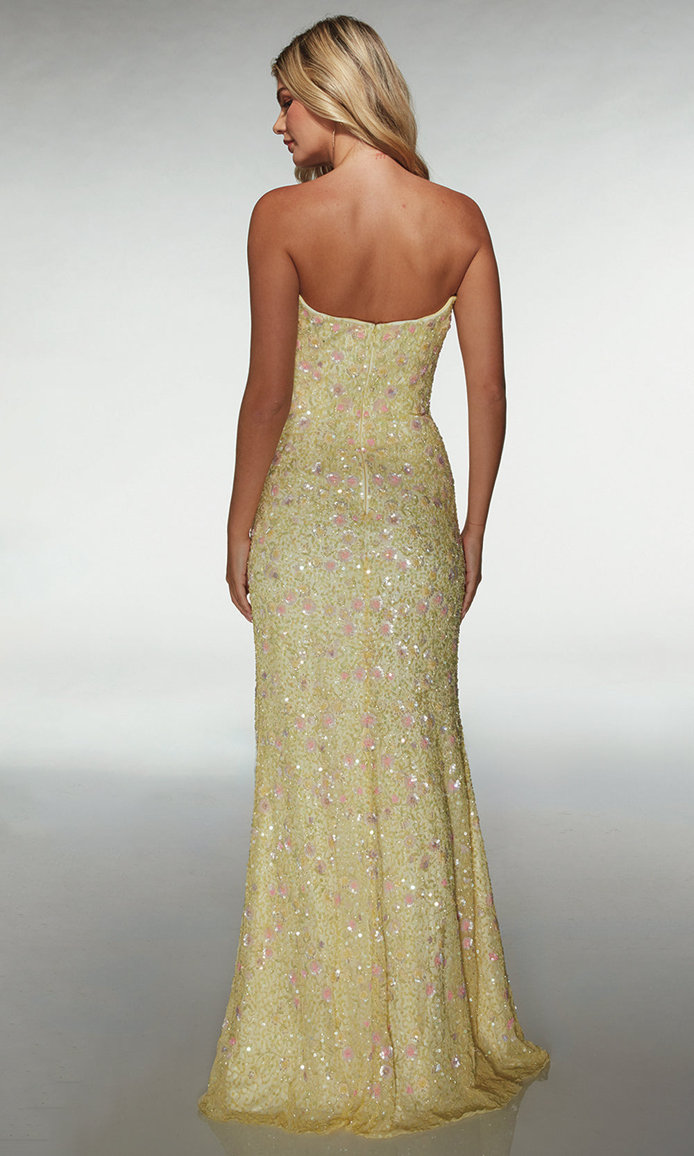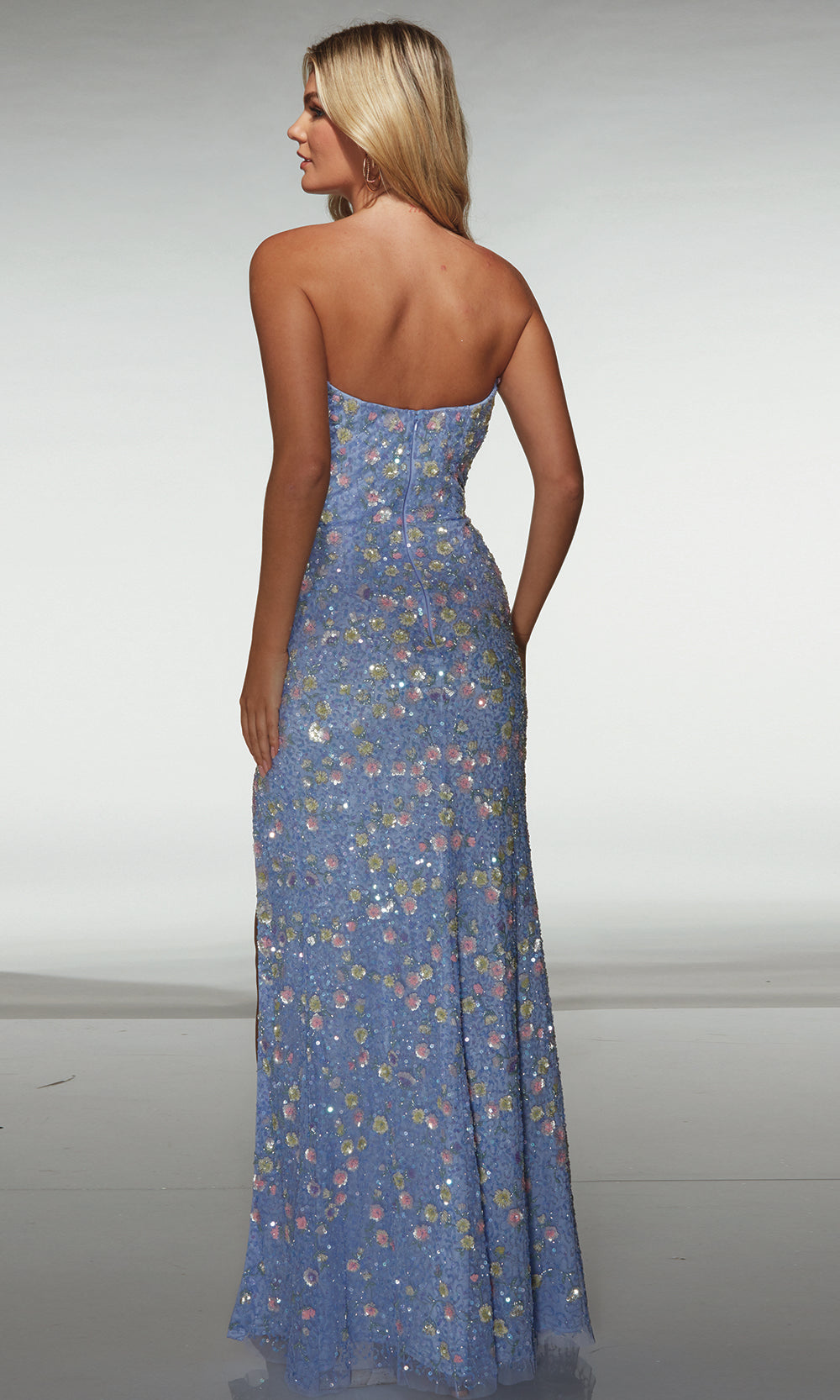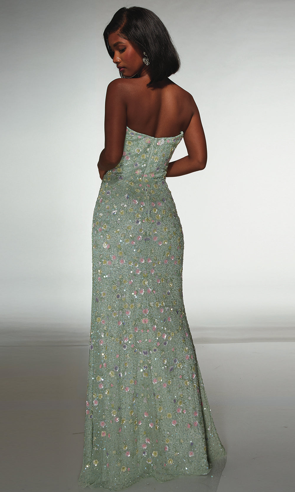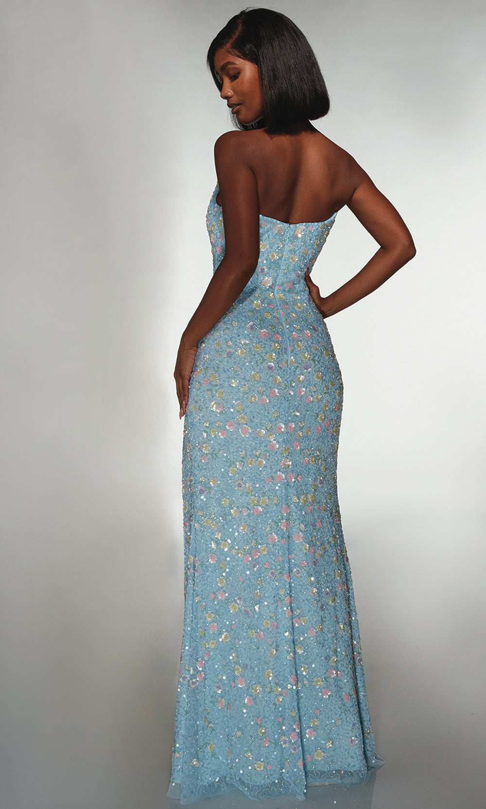 Alyce Paris Style 61998 brings a glamorous and modern twist to classic evening elegance. This gown features a striking strapless deep sweetheart neckline that enhances the fitted bodice beautifully. Its fully embellished floral beading creates a shimmering surface from top to hem, while the high leg slit accented with a heart detail adds a bold, playful touch. A sleek back zipper closure ensures a smooth and flattering fit. Step into your next special event in unforgettable style with Alyce Paris Style 61998. Model is wearing Blue Iris, Cameo Green, Light Yellow, and Powder Blue colors.
