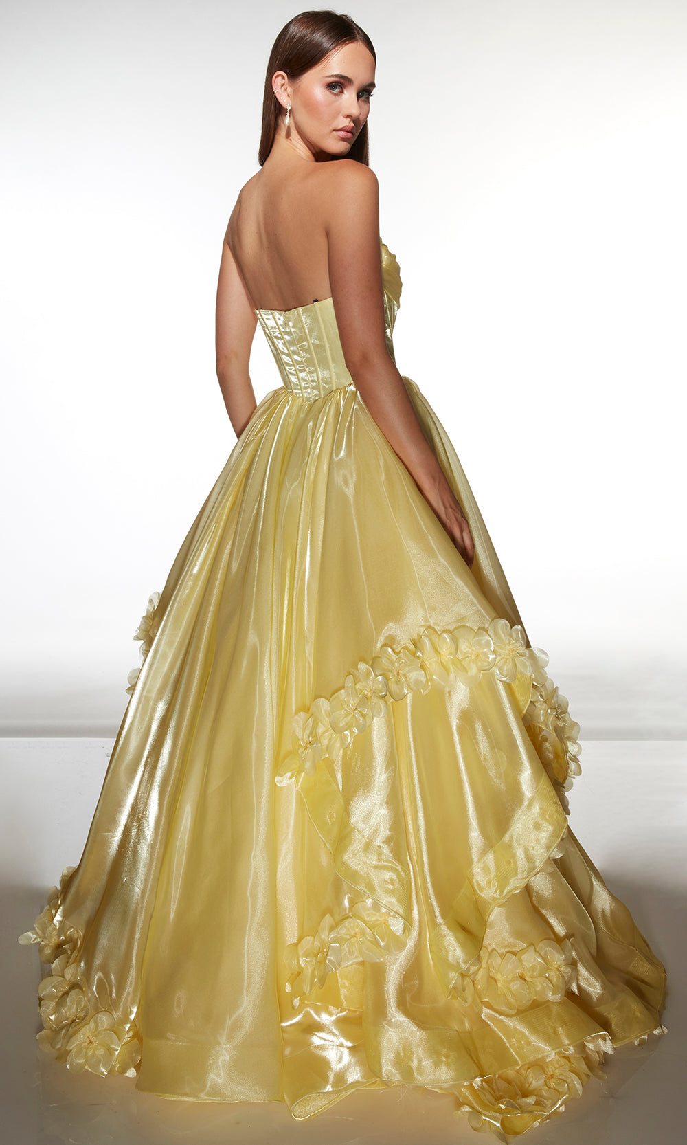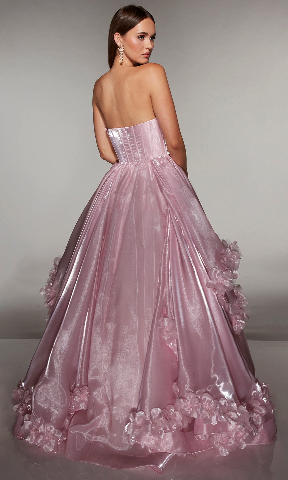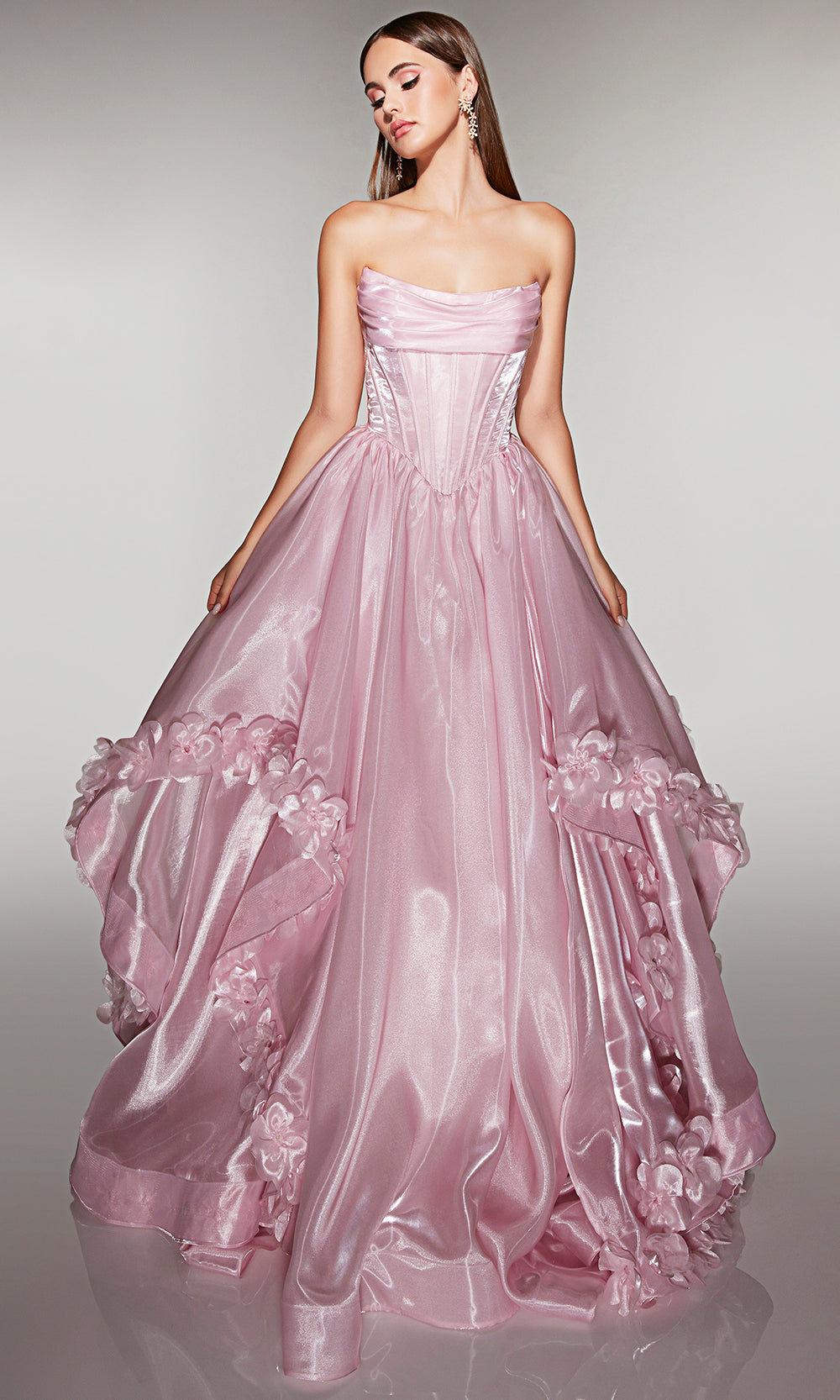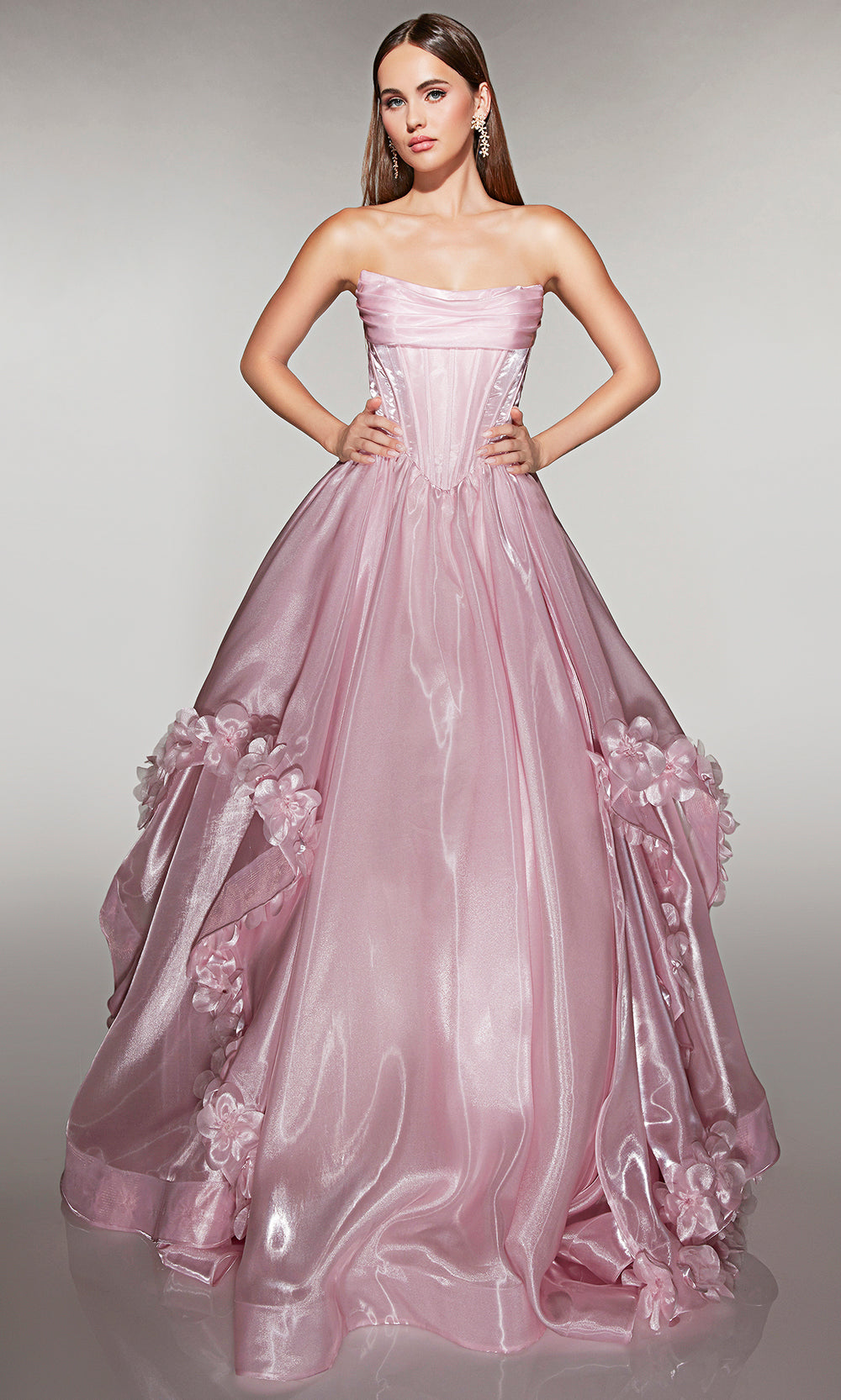 | Details: | Strapless pleated neckline, structured corset bodice, 3D floral applique accents, voluminous ball gown skirt, shimmering overlay fabric, lace up back |