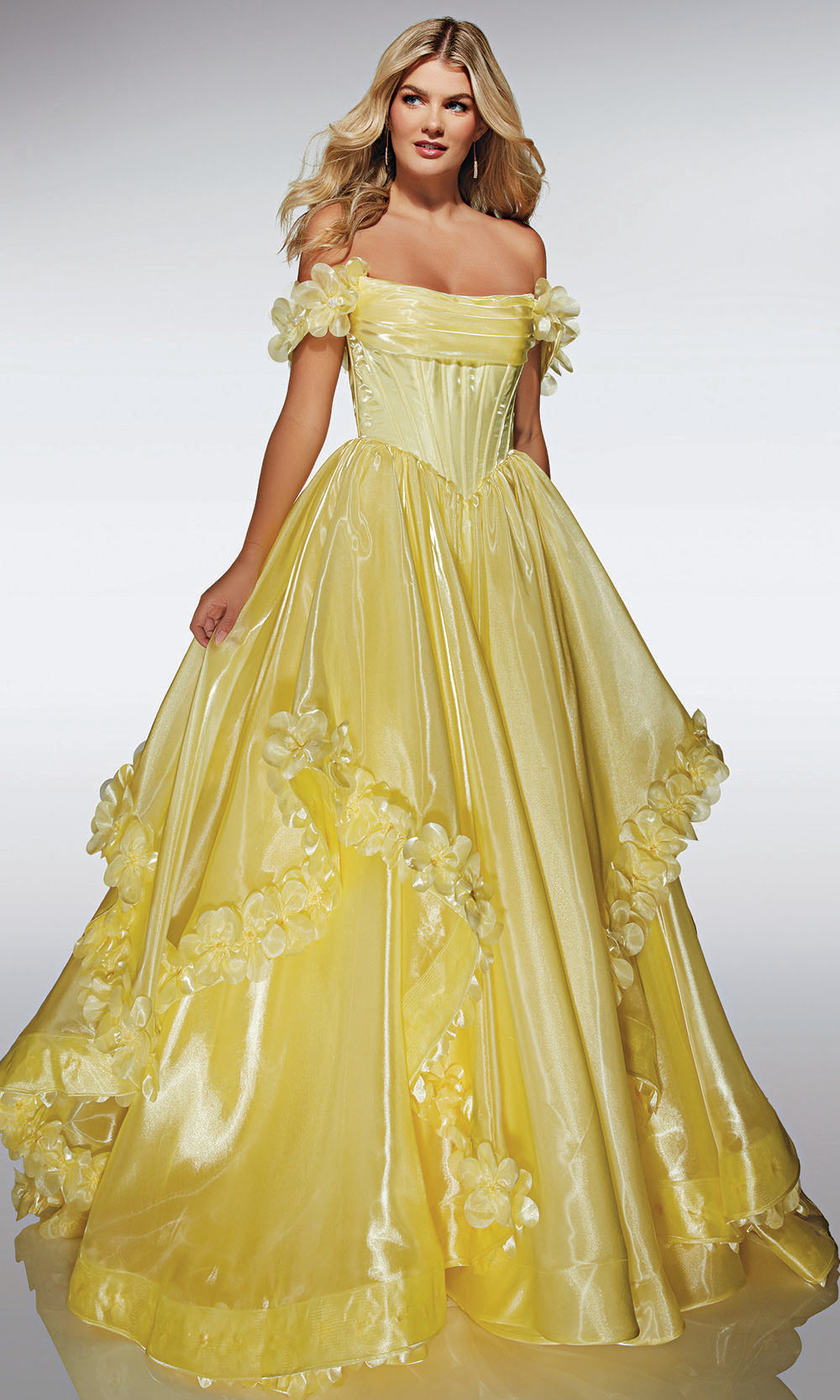 The Alyce Paris Style 62014 gown brings a striking blend of elegance and couture detail to any formal event. This design features a structured corset bodice with a beautifully pleated neckline that enhances its sophisticated silhouette. A voluminous ball gown skirt cascades gracefully, enriched with shimmering layers that elevate its dramatic presence. Delicate 3D floral applique accents highlight the gown’s luxurious craftsmanship. Make a memorable entrance at your next special occasion by choosing the stunning Alyce Paris Style 62014. Model is wearing Light Yellow and Pink colors.