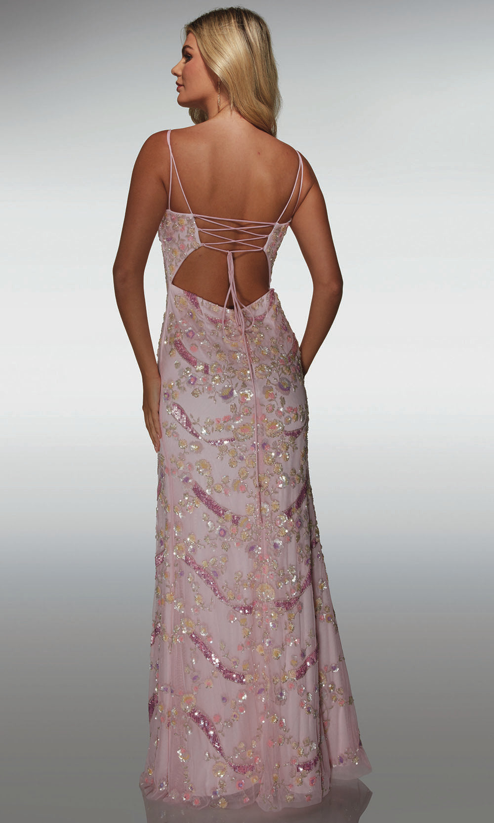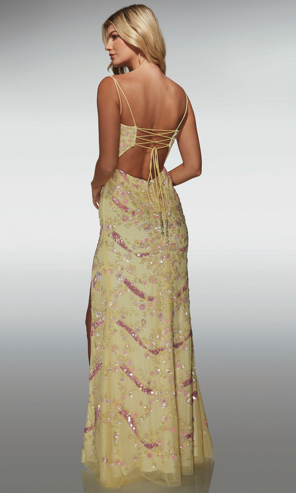 Alyce Paris style 62016 is crafted for those who want a statement look with radiant texture and movement. The dress showcases intricate hand beaded florals and sequins that trace the fitted shape with eye catching detail. A high slit adds a striking, confident touch, while the lace up back and delicate double straps provide a customizable fit. Finished with a sheer overlay that enhances dimension, this design blends glamour and elegance effortlessly. Step into your next special event with Alyce Paris style 62016 and experience a look that feels unforgettable. Model is wearing Blue Iris, Light Pink, and Light Yellow colors.