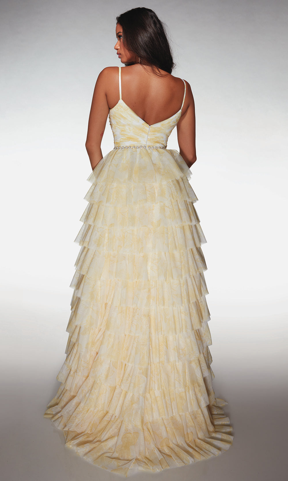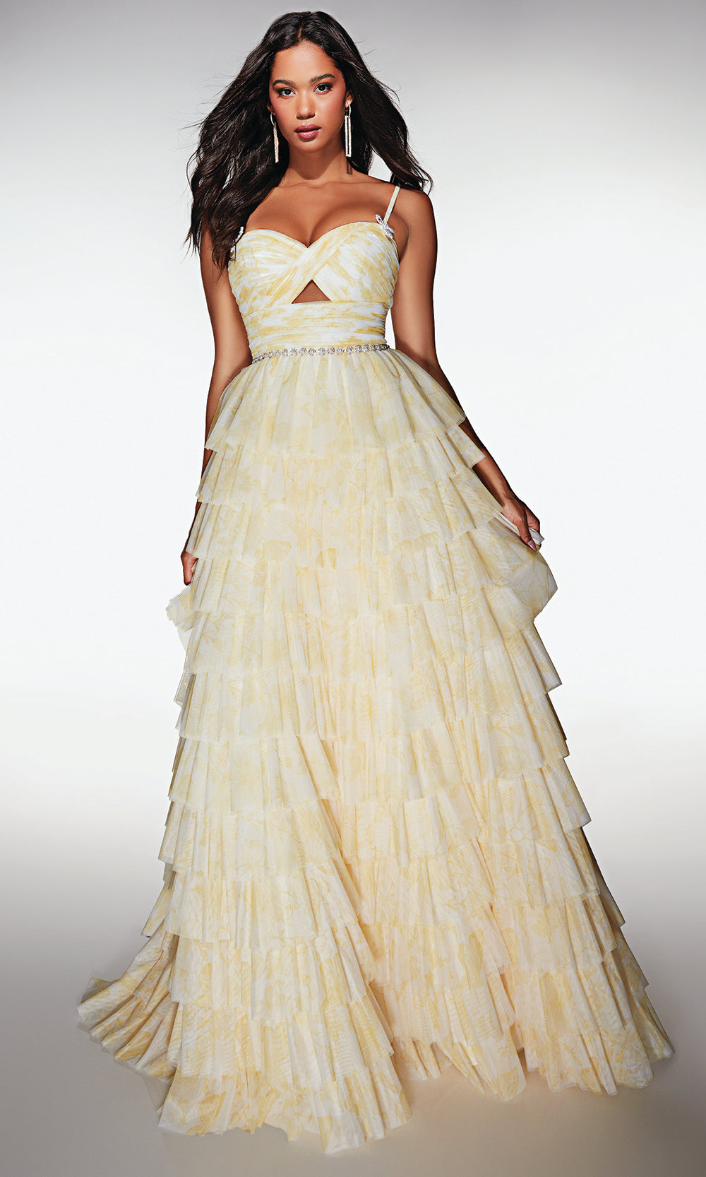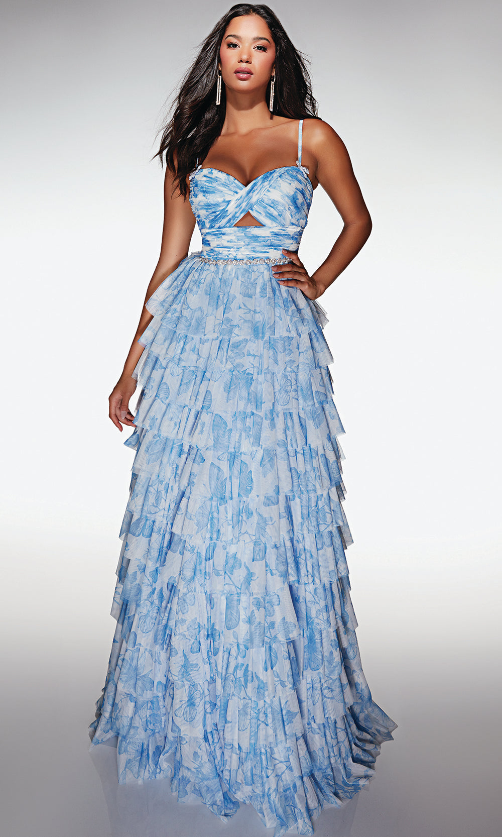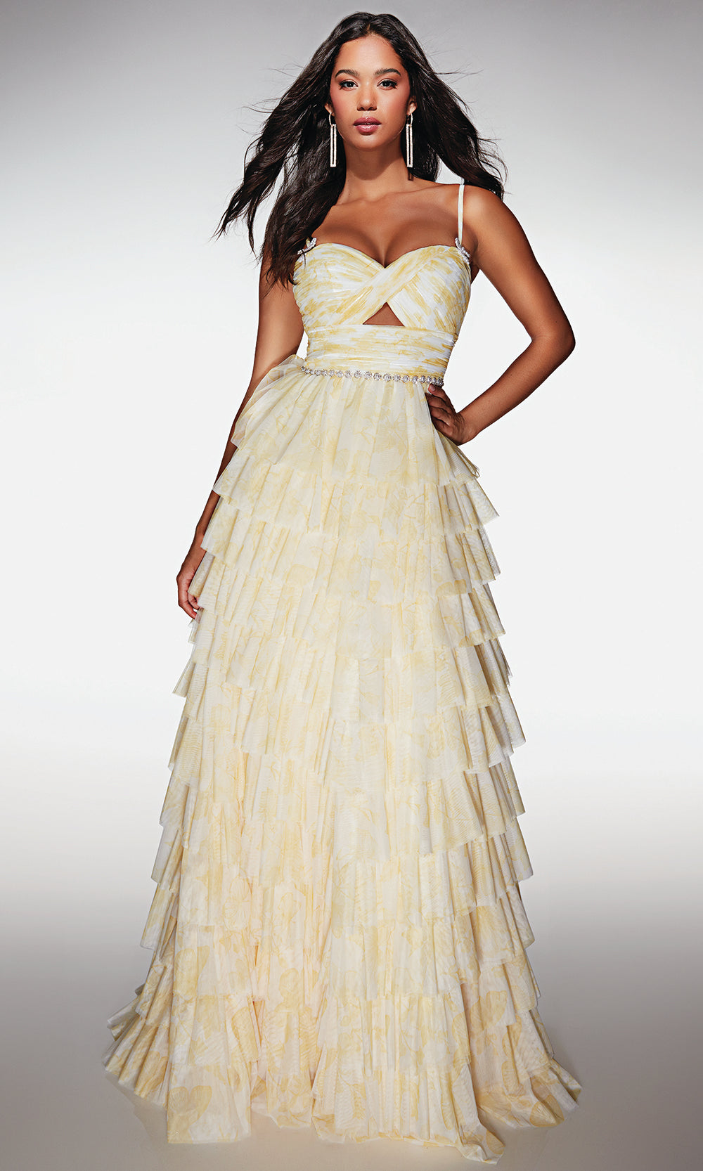 The captivating charm of the Alyce Paris Style 62018 gown is designed for those who love elegance with a modern twist. Its beautifully cross-pleated bodice highlights the figure, while a delicate cutout adds a touch of contemporary flair. The tiered ruffle skirt cascades gracefully, creating movement and volume with every step. A sparkling beaded waistline enhances the gown’s refined finish, pairing perfectly with the adjustable straps for a comfortable fit. Step into any special occasion with confidence and grace in the Alyce Paris Style 62018, a look crafted to make your night unforgettable. Model is wearing Buttercup and Light Periwinkle colors.