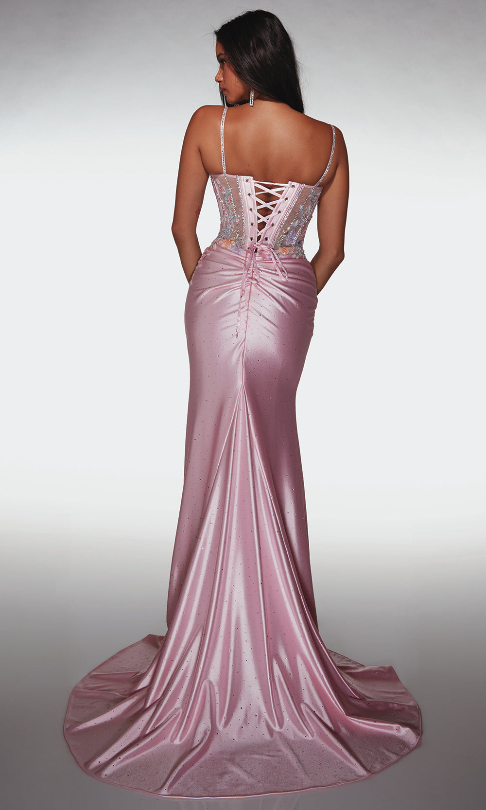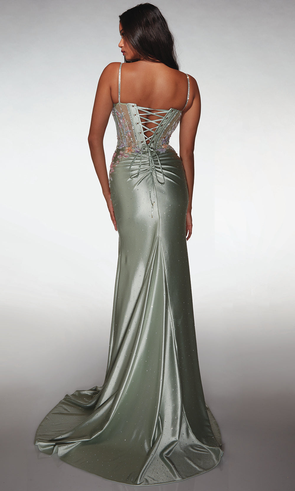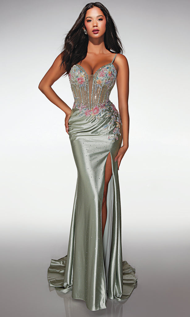 Step into elegance with the Alyce Paris style 62022, designed to make every entrance unforgettable. This gown features a sculpted bodice with floral applique beadwork and structured boning that highlights the waist, while the illusion plunge detail adds soft allure. A flattering ruched hip accent meets a daring leg slit for graceful movement, and a lace up back ensures the perfect adjustable fit. Completed by a flowing train, this gown offers a romantic yet modern finish. Choose Alyce Paris style 62022 for your next special occasion and shine with confidence and poise. Model is wearing Celadon and Rosewater colors.