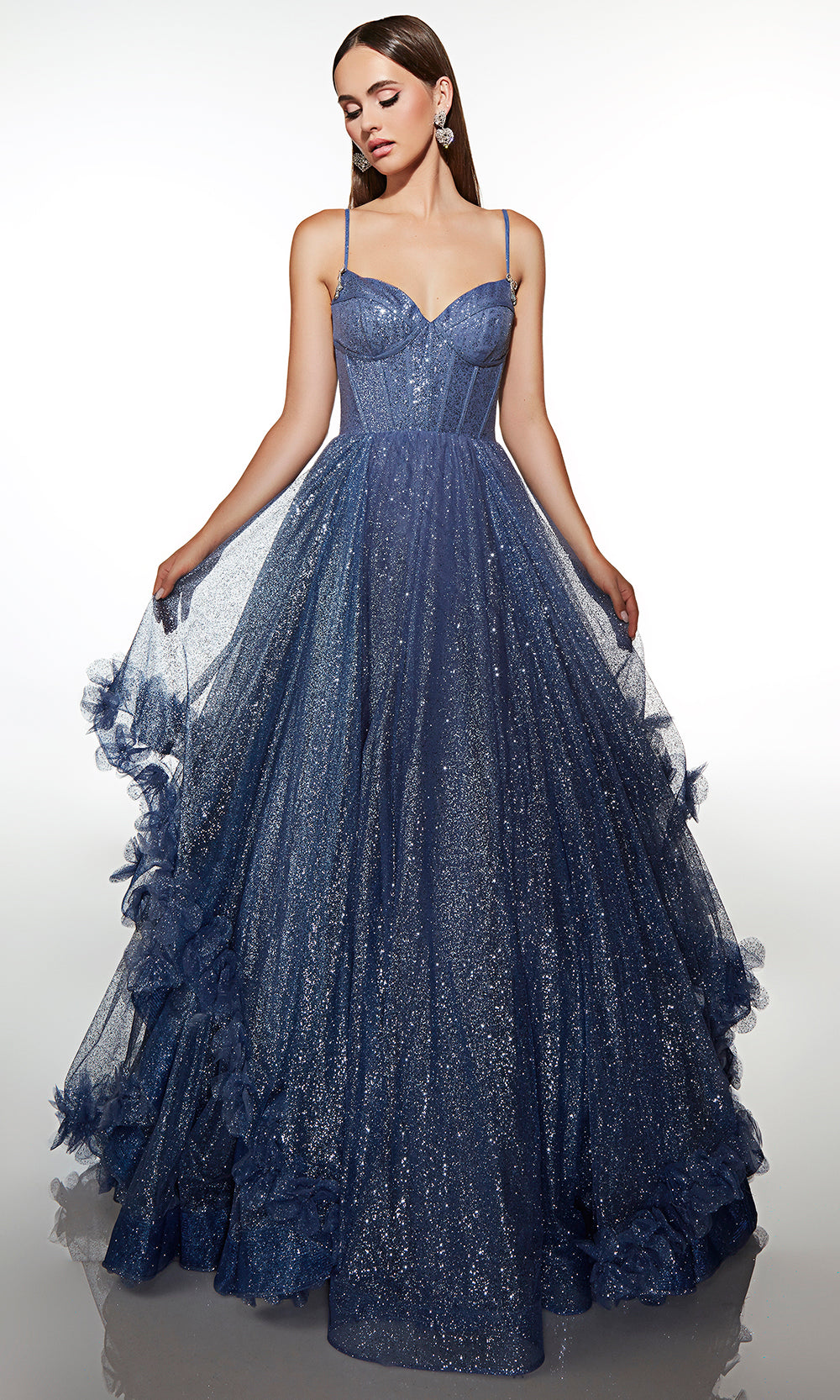 Step into the spotlight with the enchanting Alyce Paris 62032, a gown designed to captivate from every angle. Its structured corset bodice defines the waist beautifully, while the layered glitter tulle skirt floats with radiant movement. Floral applique accents trail along the full ball gown silhouette, adding soft dimension and couture detail. A lace up back ensures an adjustable, elegant fit, paired with delicate straps and a classic sweetheart neckline. Make your grand entrance unforgettable in the Alyce Paris 62032, the perfect gown for your most magical special occasion. Model is wearing Storm Cloud color.