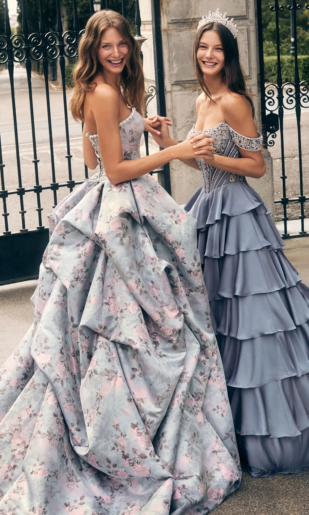 | Details: | Off-the-shoulder beaded bodice, visible corset construction, lace-up back, tiered ball gown skirt, sweeping hem |