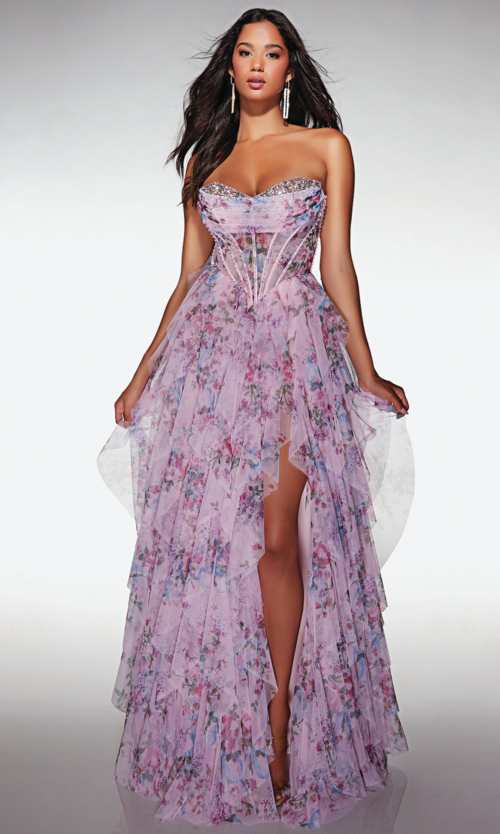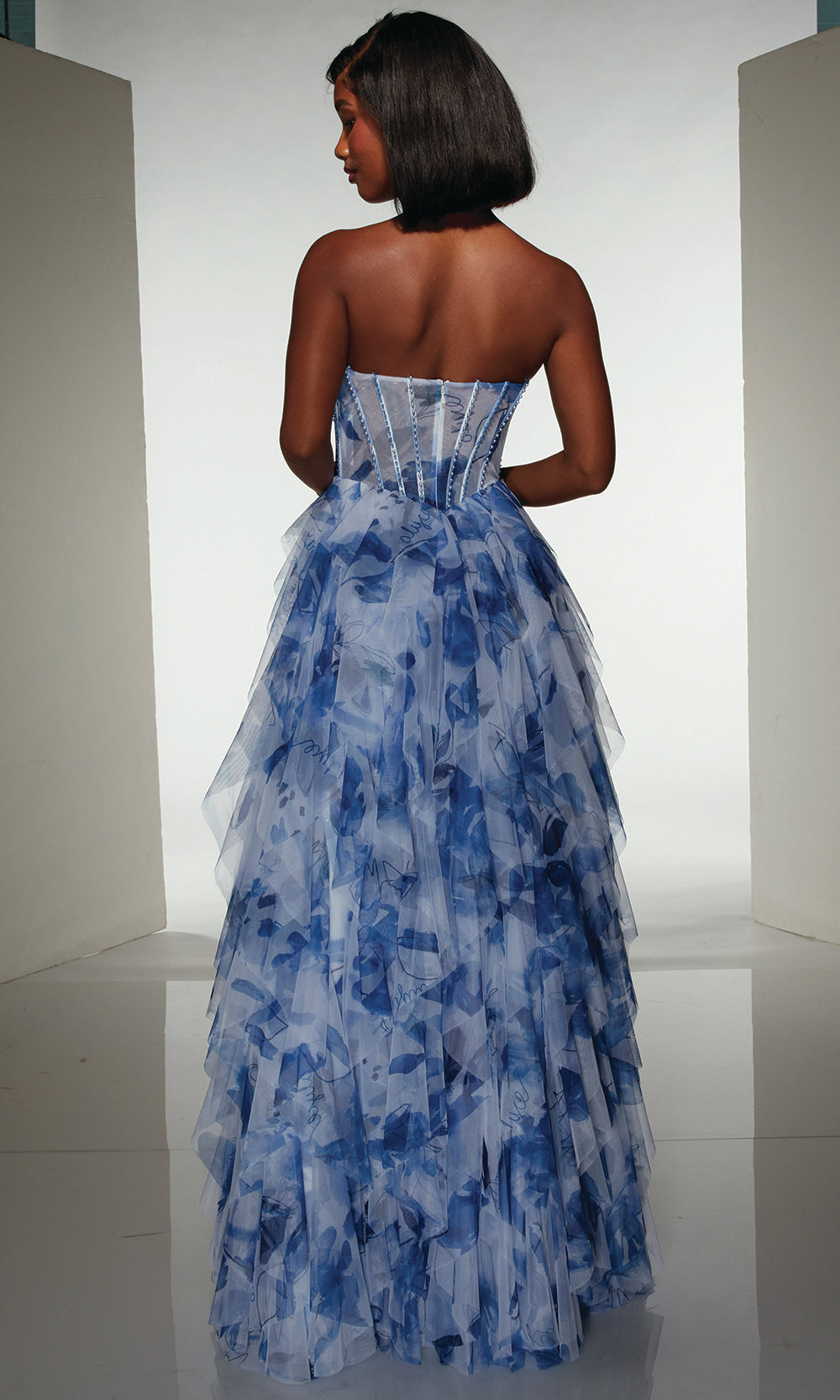 Alyce Paris style 62041 brings whimsical elegance to life with its beautifully structured silhouette and romantic detailing. Its strapless bodice sparkles with bead accents, while the sheer corset design defines the waist for a flattering fit. A cascading floral print layered ruffle skirt adds volume and movement, and a thigh high slit gives the gown a hint of allure. Finished with a lace up back for an adjustable fit, this gown radiates feminine sophistication. Elevate your wardrobe for prom, gala, or formal celebrations with the unforgettable charm of Alyce Paris style 62041. Model is wearing Blue-Print and Pink-Multi colors.