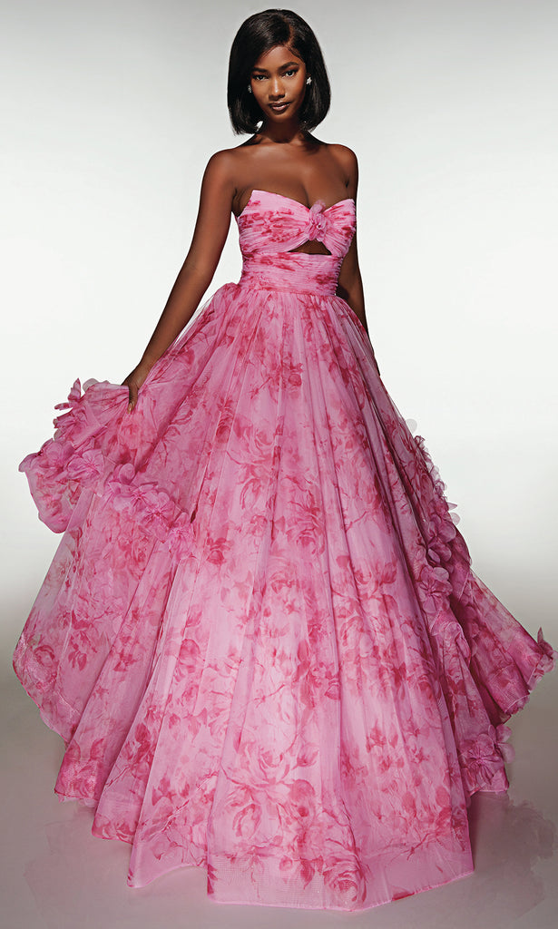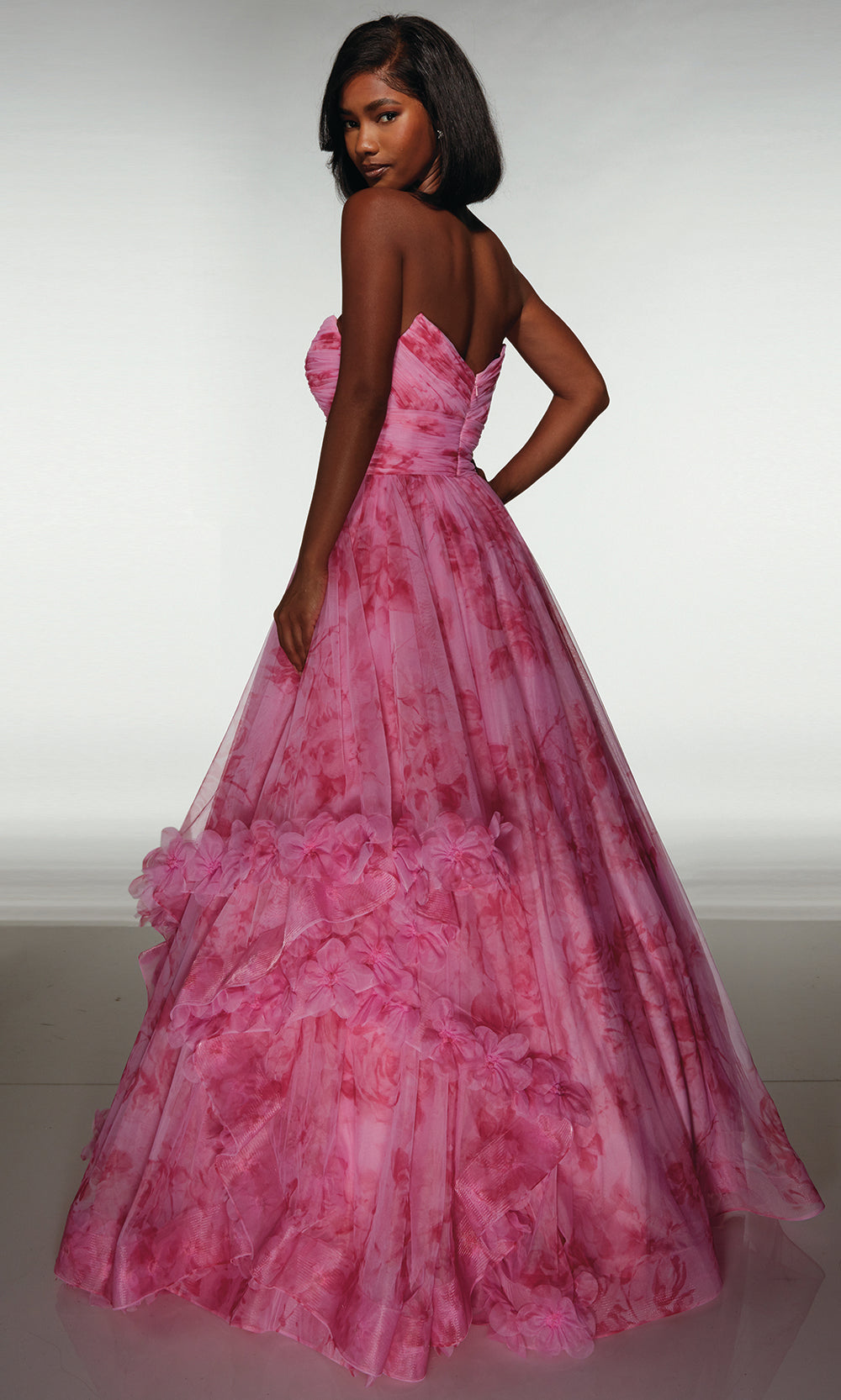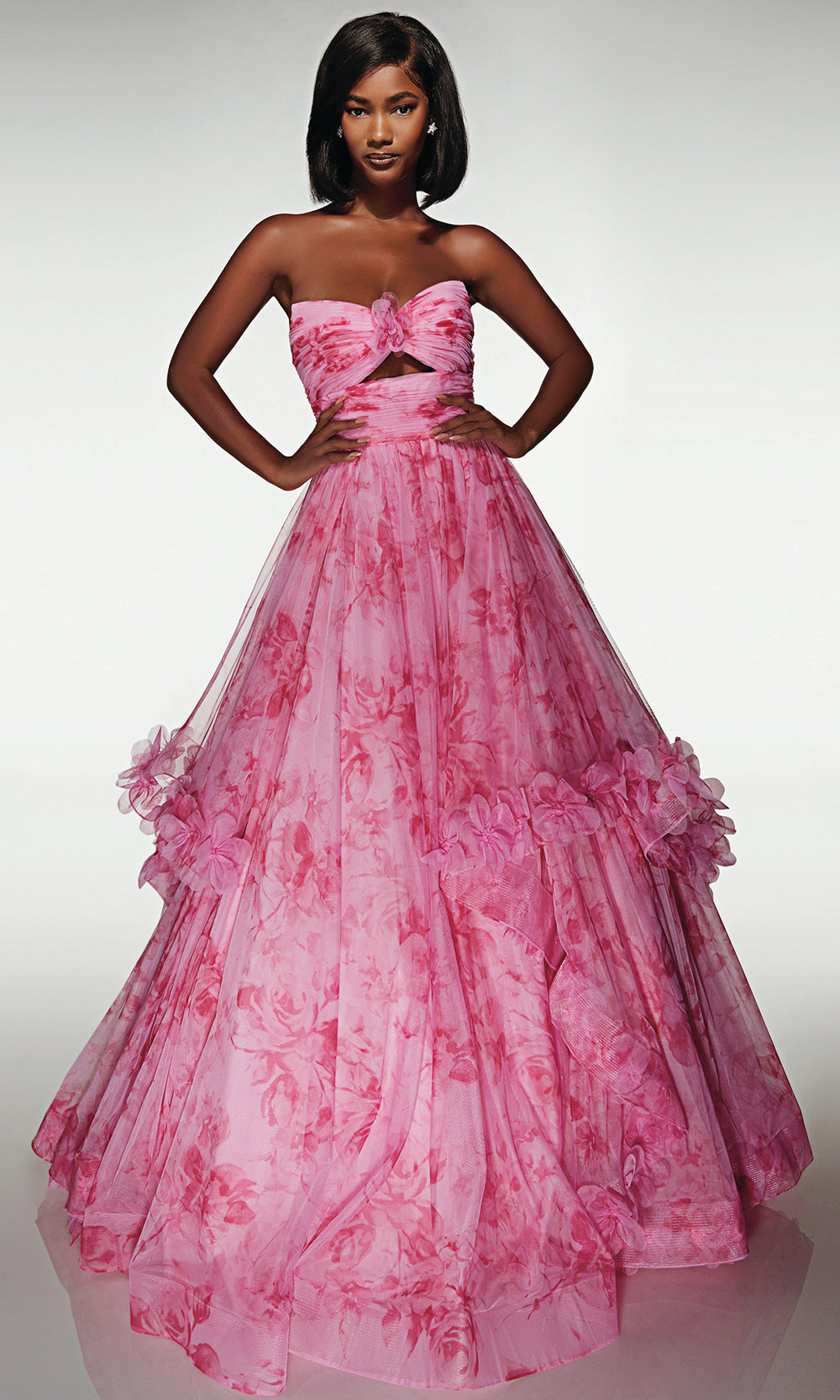 Alyce Paris Style 62042 brings a romantic, fairytale-inspired presence to your formal wardrobe. This gown features a ruched strapless bodice with a subtle front cutout, offering a modern twist on classic elegance. Layers of floral print tulle cascade into a full ball gown silhouette, while 3D floral accents add depth and whimsy to the sweeping skirt. Designed to turn heads, this dress effortlessly blends softness and statement glamour. Step into your next event with confidence and grace—Alyce Paris Style 62042 is the perfect choice for prom, pageants, and unforgettable evenings. Model is wearing Bubblegum color.