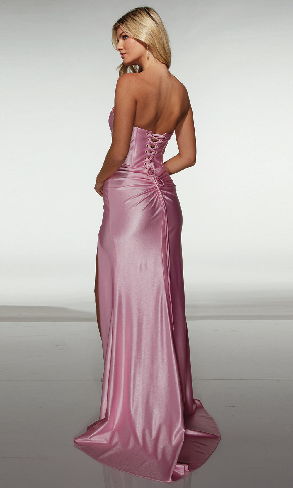 The Alyce Paris 62046 gown delivers a refined, feminine charm that instantly captivates. Its structured strapless bodice features three delicate bow accents along a sheer plunge that adds a playful yet polished touch. The sleek satin finish creates a smooth, sculpted silhouette, complemented by a flattering high leg slit that elongates the figure. A lace up back completes the look with customizable support and a hint of romantic detailing. Perfect for any special event, the Alyce Paris 62046 promises elegance and confidence with every step. Model is wearing Hot Pink and Rosewater colors.