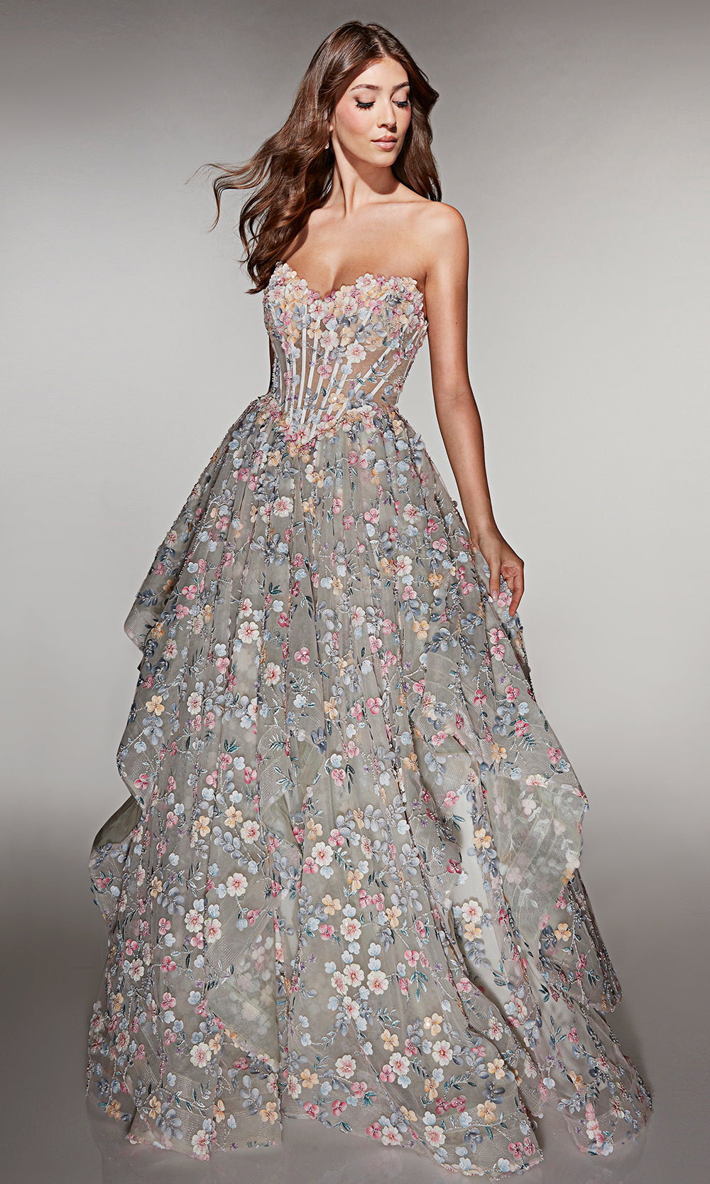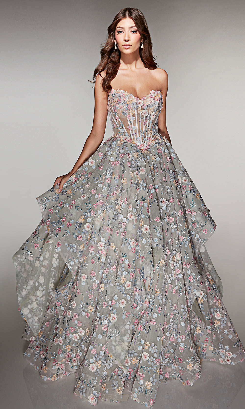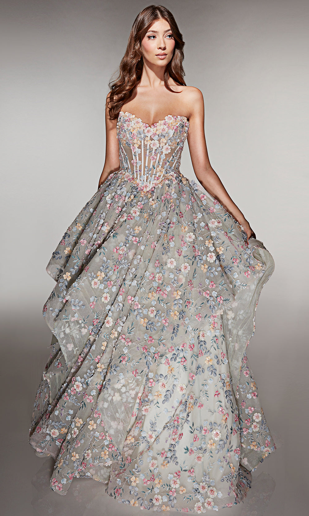 | Details: | Strapless corset bodice, lace up back, layered floral applique skirt, ball gown silhouette |