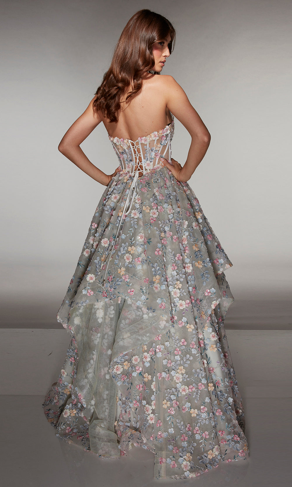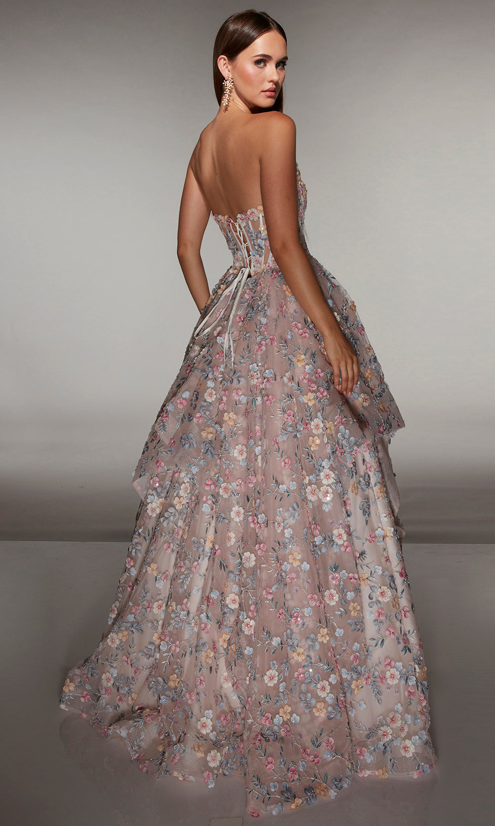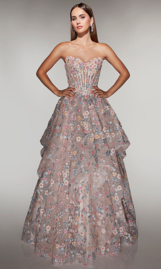 Step into enchanting elegance with the Alyce Paris Style 62048, a breathtaking ball gown crafted for those who love romantic fairytale glamour. The strapless corset bodice highlights the figure with delicate structure and lace up detail, while the layered floral applique skirt brings depth and movement for a dreamy finish. The cascading full silhouette makes every entrance unforgettable, creating a statement of refined beauty and charm. Perfect for proms, pageants or formal galas, Alyce Paris Style 62048 promises to make your night magical and memorable. Model is wearing Celadon and French Pink colors.