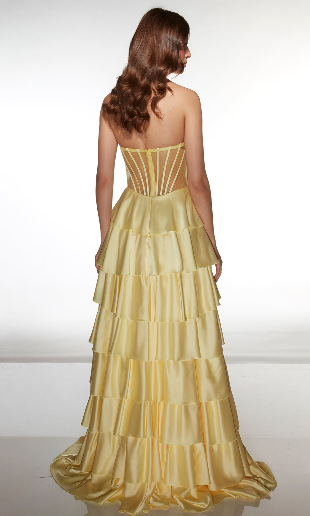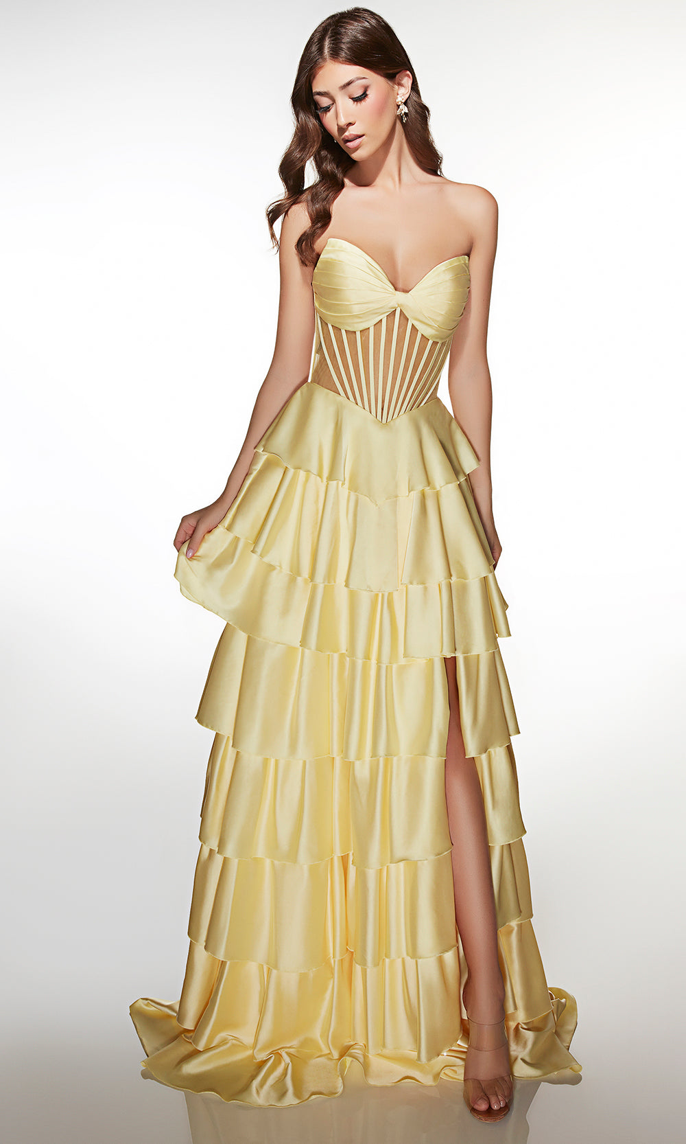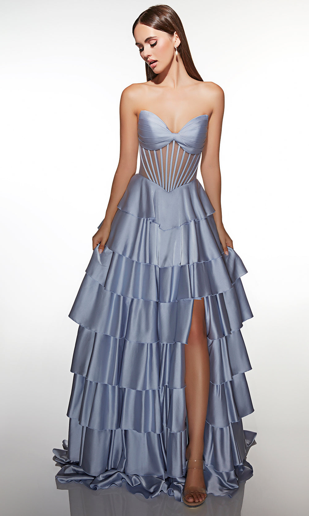 | Details: | Tiered ruffle skirt, sheer structured bodice, sweetheart neckline, high leg slit, strapless design, satin finish, lace-up style back illusion |