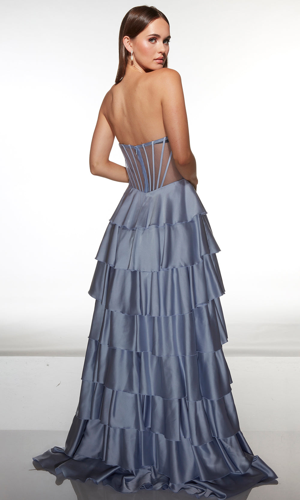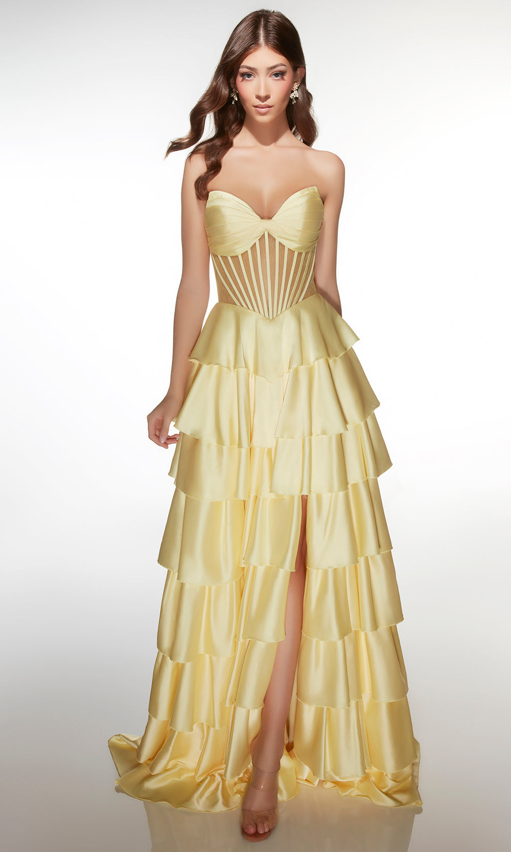 Alyce Paris Style 62056 unveils a captivating fusion of romance and modern glamour, perfect for anyone wanting a dramatic entrance. The sheer structured bodice highlights delicate lines that sculpt the waist beautifully, while the sweetheart neckline adds a soft, feminine touch. A cascading tiered skirt creates luxurious movement, and the high leg slit brings a bold, contemporary edge to the design. Finished in a sleek satin-like fabric, this gown radiates polished elegance from every angle. Elevate your special occasion look with the unforgettable allure of Alyce Paris Style 62056. Model is wearing French Blue and Light Yellow colors.