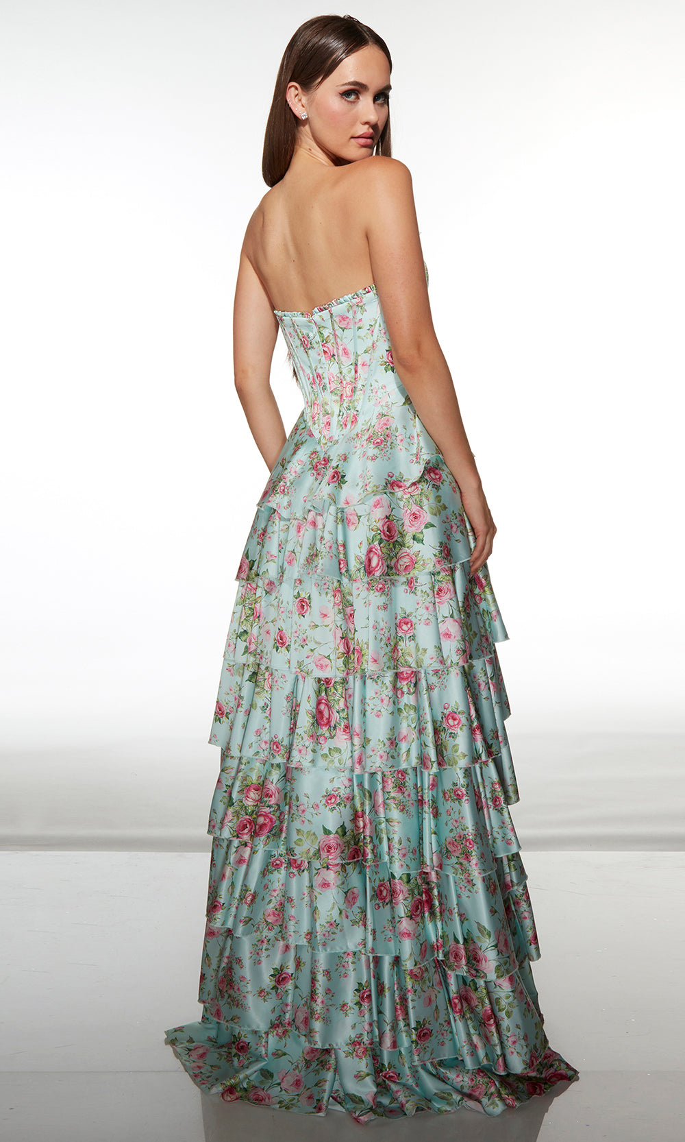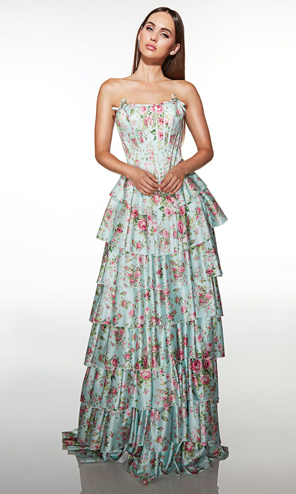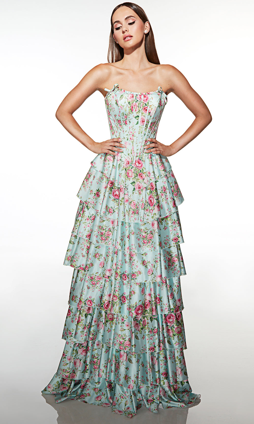 Alyce Paris style 62066 brings whimsical elegance to life with a beautifully structured strapless corset bodice that highlights the waist while offering a romantic, feminine finish. Its tiered ruffle skirt creates graceful movement with every step, perfectly complementing the soft floral print that elevates the gown’s dreamy charm. The lace up back offers an adjustable fit, ensuring both comfort and a sculpted silhouette. Whether attending a gala, prom, or any special celebration, Alyce Paris style 62066 is your ideal statement piece for a memorable entrance. Model is wearing Tiffany color.