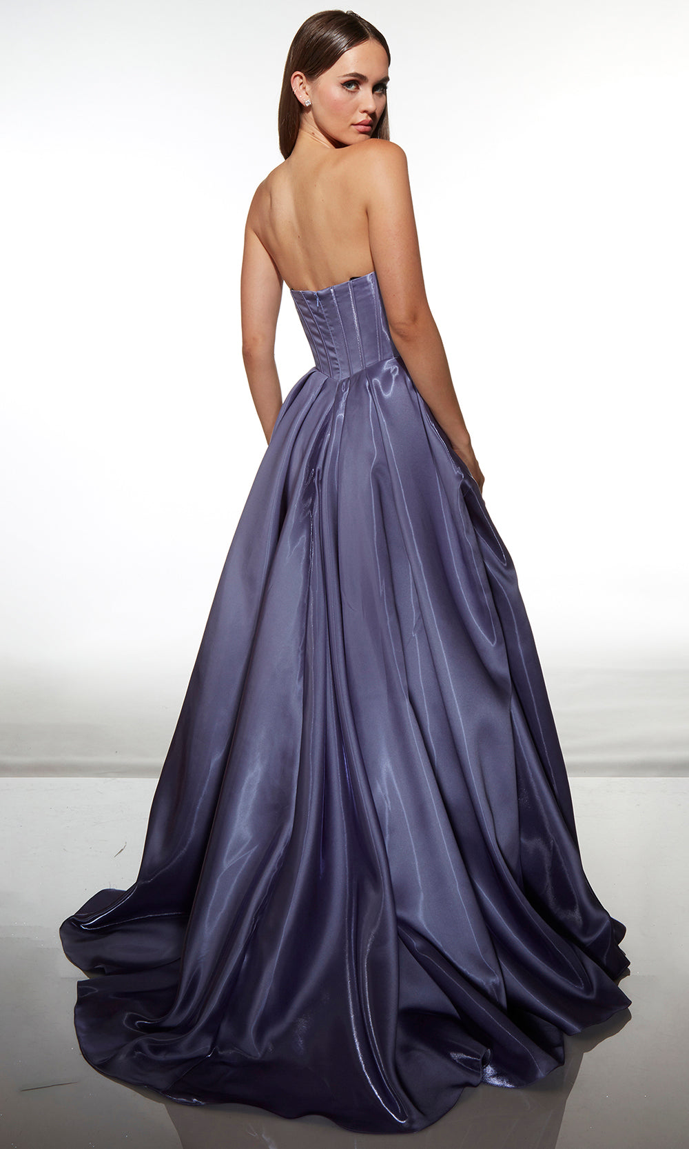 Alyce Paris style 62076 delivers a dramatic blend of structure and movement, perfect for making a grand entrance. The sculpted bodice features a structured corset that enhances the waist while offering modern support, paired with a smooth satin skirt that flows effortlessly with every step. Its unique high-low draped overskirt adds dimension and couture appeal, giving you two silhouettes in one. Finished with a lace-up back for customizable comfort, this gown is designed for those who want standout elegance. Step into your next special occasion with confidence and unforgettable style in Alyce Paris 62076. Model is wearing Black and Purple Haze colors.