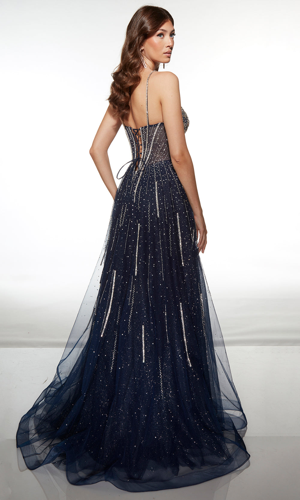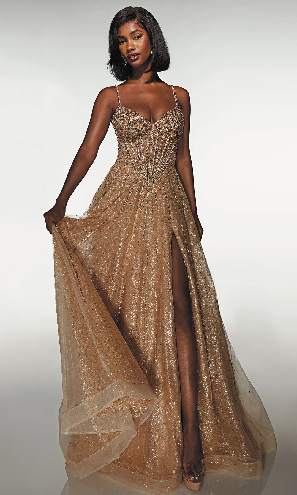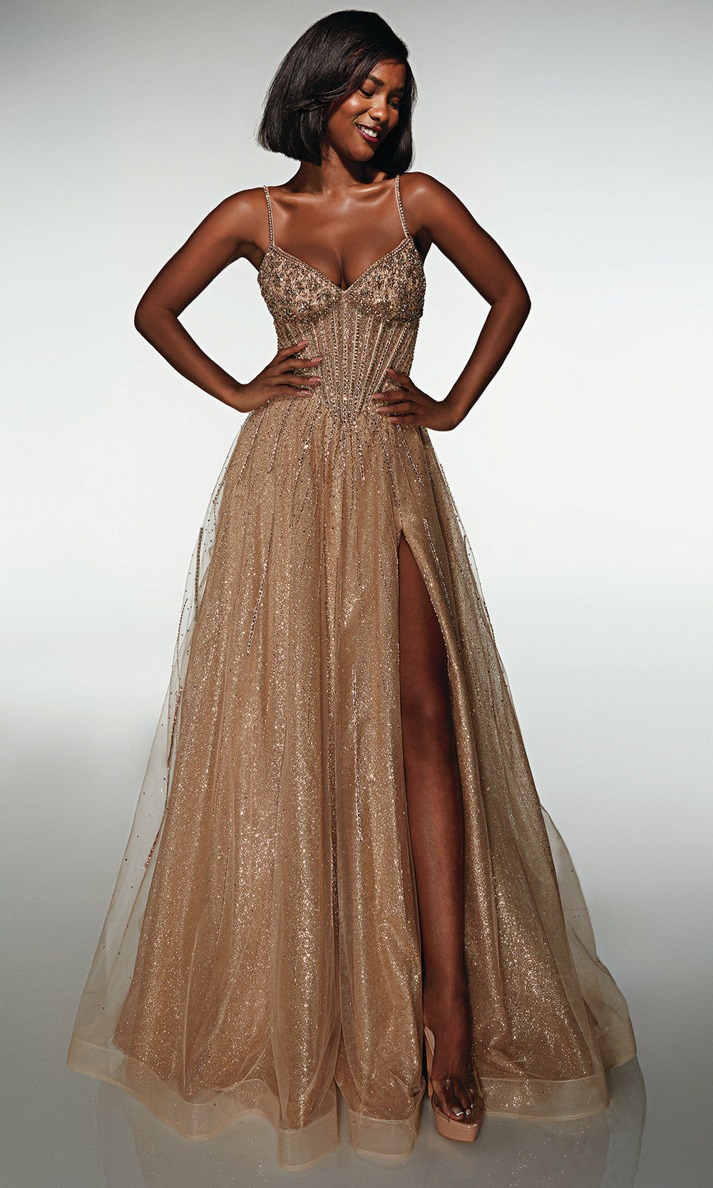 Alyce Paris Style 62093 is designed for the woman who wants to shine effortlessly. The fitted bodice features delicate corset elements and dazzling beadwork that catch light with every movement, while thin straps create a graceful neckline. A layered flowing skirt drapes softly to the floor, opening to a striking high slit for confident glamour. The lace up back provides custom shaping, ensuring the dress complements every silhouette. With Alyce Paris Style 62093, you are invited to step into any formal event with refined sparkle and unforgettable elegance. Model is wearing Gold and Midnight colors.