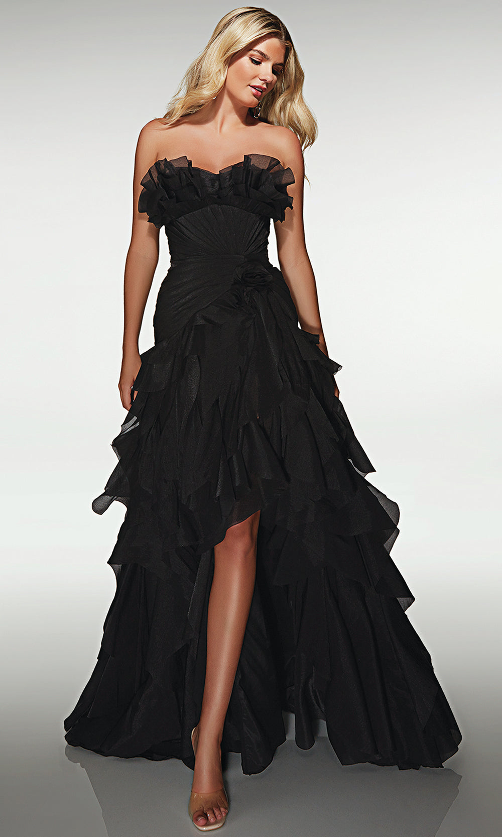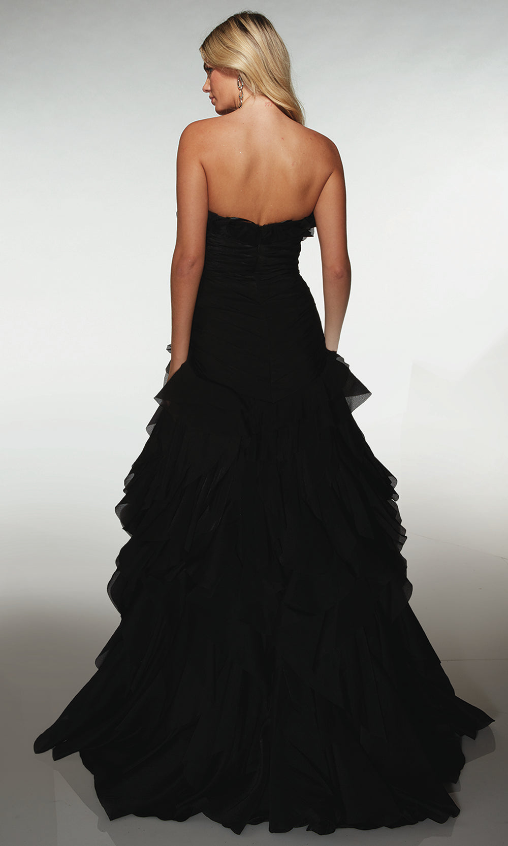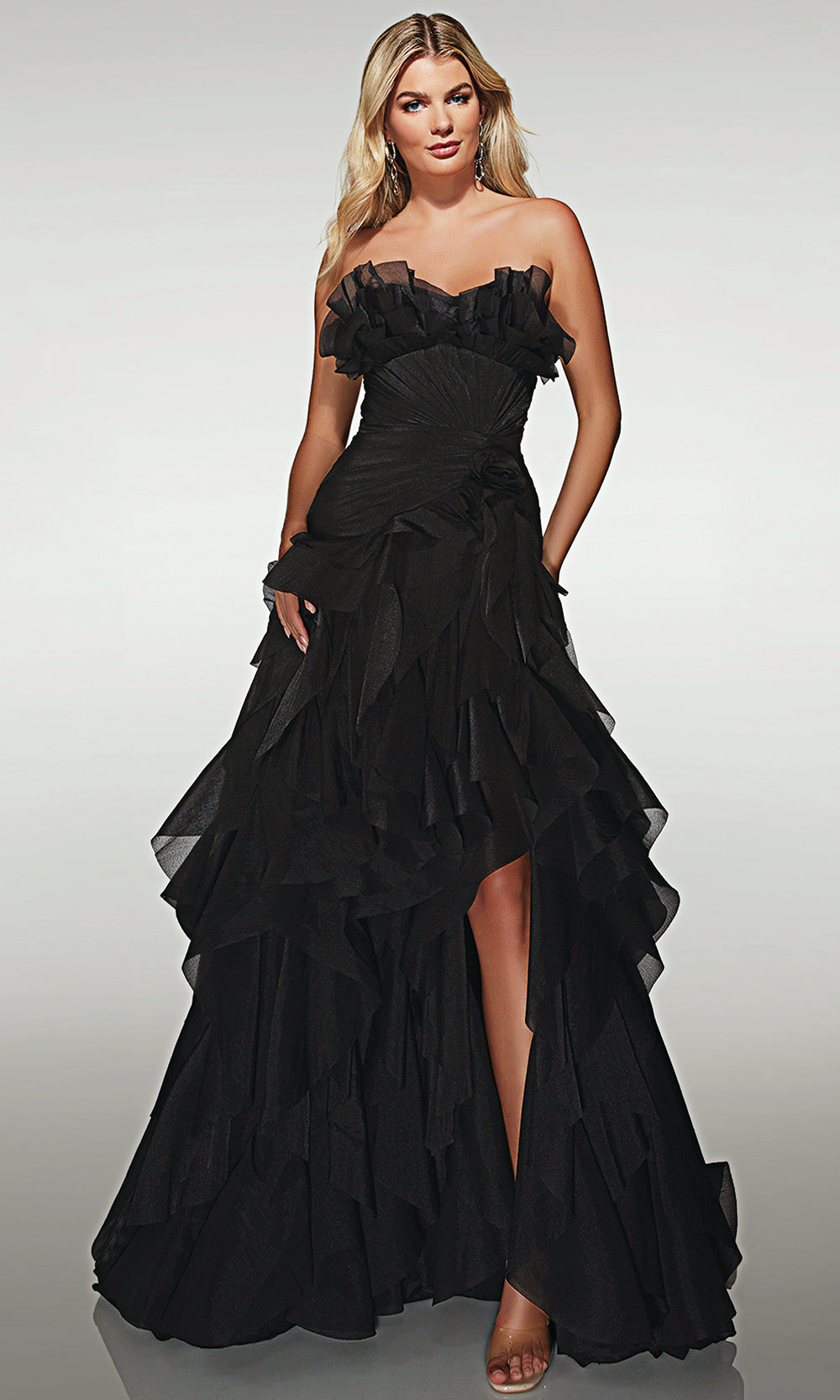 Alyce Paris style 62124 brings timeless elegance into focus for every memorable moment. Designed with a romantic sweetheart neckline and layered ruffle accents, this dress highlights feminine sophistication in a classic A line silhouette. The structured bodice defines the waist while flowing fabric glides effortlessly, offering graceful movement with every step. Finished with an elegant sweep train, it creates a refined yet captivating presence ideal for formal events. Step into your next celebration in Alyce Paris 62124 and enjoy a look made to flatter, enchant, and be remembered. Model is wearing Black color.