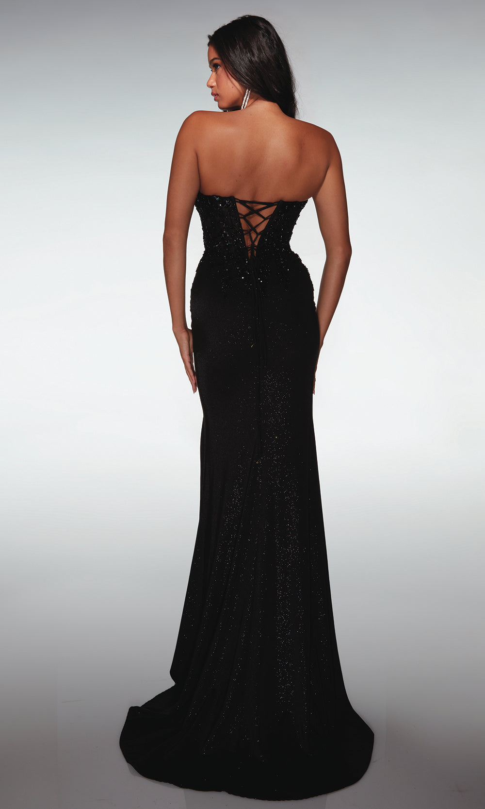 Step into the limelight wearing the enchanting Alyce Paris style 62135 — a glamorous gown that radiates sophistication with every step. The strapless corset bodice, enhanced by sequin and bead embellishments, sculpts the figure while the plunging illusion V-neckline offers a seductive yet elegant look. A lace-up back ensures a seamless, customized fit, while the long, straight skirt flows gracefully down with a front slit that adds motion and allure. Finished with a sweep train for a dramatic entrance, this design is ideal for prom nights, galas, or any black-tie event. Choose Alyce Paris 62135 and let your presence be unforgettable on your special night. Model is wearing Black color.