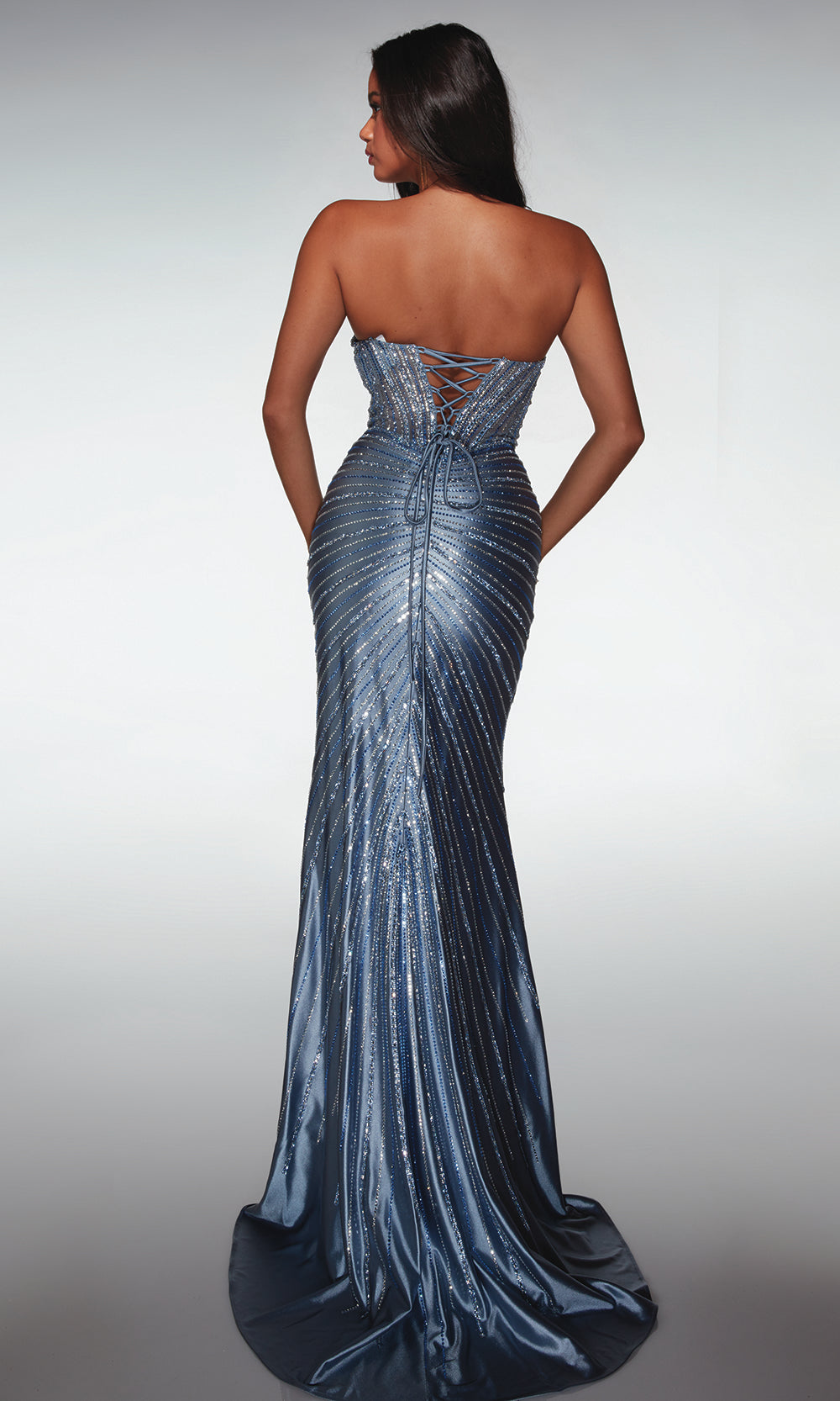 Alyce Paris style 62142 delivers a striking blend of glamour and modern elegance, perfect for any formal event that calls for a showstopper. The strapless sweetheart neckline enhances the sculpted bodice, which is covered in intricate embellishments that catch the light beautifully. A ruched waist draws the eye inward before transitioning into a sleek sheath silhouette, highlighted by a dramatic high slit that adds bold energy. The lace up back completes the design with a customizable fit and elevated finish. Make an unforgettable entrance with Alyce Paris style 62142. Model is wearing Dark French Blue and light Gold colors.