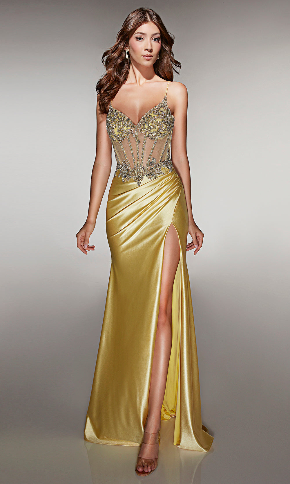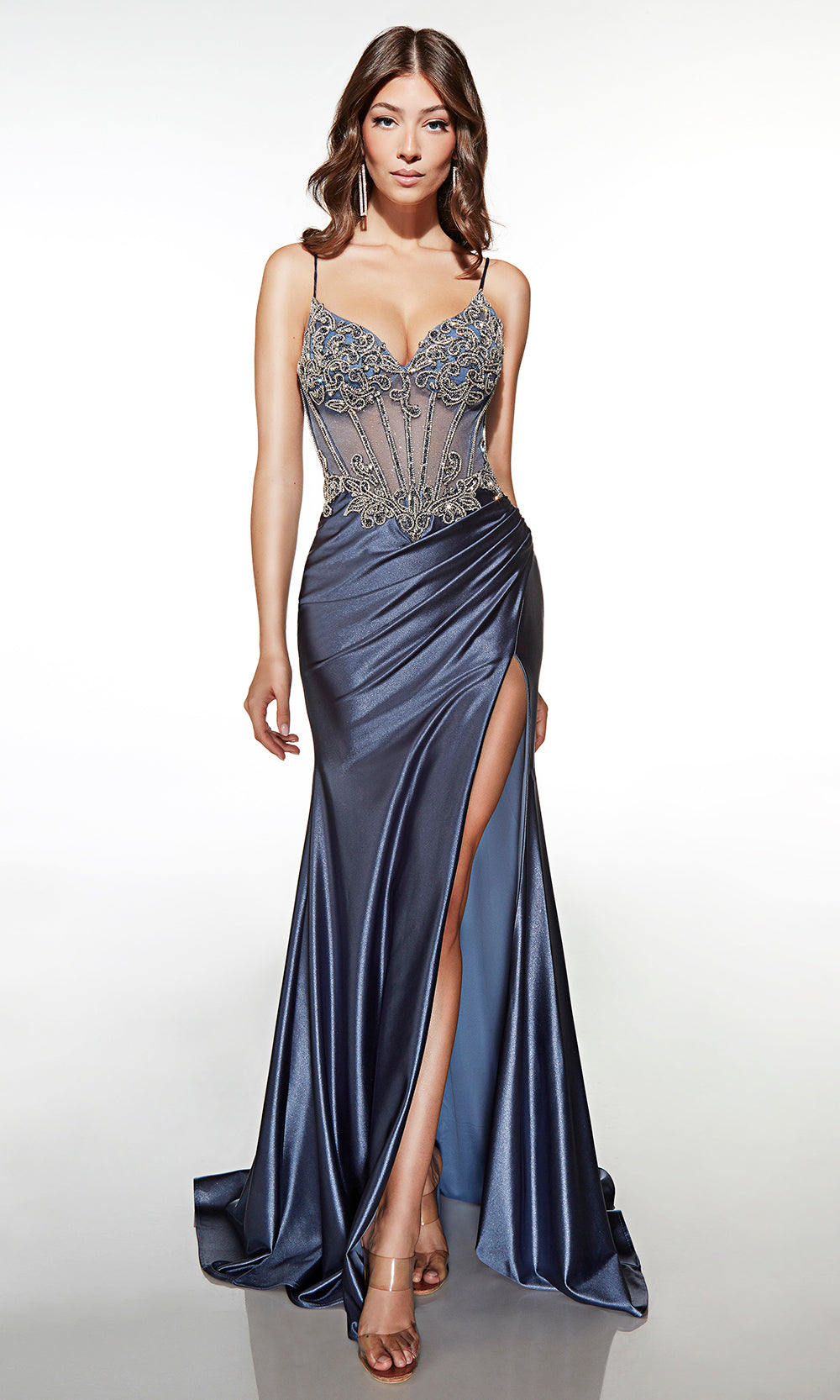 Alyce Paris style 62154 brings couture craftsmanship to the forefront with its unforgettable blend of elegance and precision. The sheer bodice is adorned with intricate beading and embroidered applique, creating a sculpted, figure-enhancing look that feels refined and luxurious. Smooth ruched draping along the hip transitions beautifully into a fitted skirt, while the high slit adds a striking, modern edge. A lace up back ensures an adjustable fit and a dramatic finish. For any formal event where sophistication and allure matter, Alyce Paris 62154 is a captivating choice that promises to leave a lasting impression. Model is wearing Buttercup, Mocha, and Storm cloud colors.