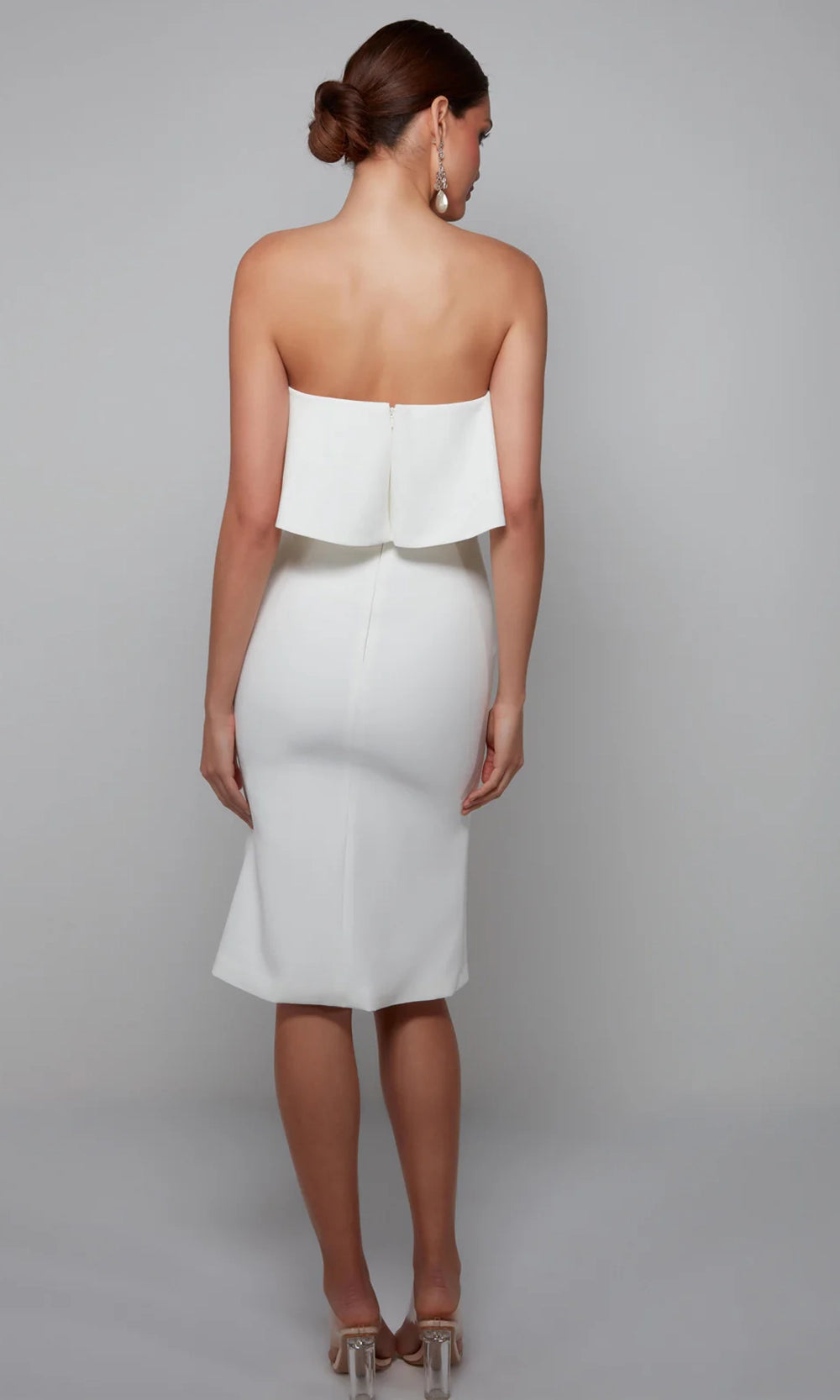 With sleek lines and modern poise, the Alyce Paris 70002 dress captures minimalist elegance. Featuring a strapless cut and semi-sweetheart neckline, this knee-length sheath dress is designed with a flounce overlay at the bodice that adds charm without overwhelming the silhouette. Its smooth italian knit fabric molds to the body, creating a clean and timeless profile perfect for formal or semi-formal occasions. Alyce Paris 70002 offers an effortlessly chic solution to elevated dressing with a soft yet tailored finish, ideal for refined celebrations. Models are wearing Ivory, and Rosewater colors.