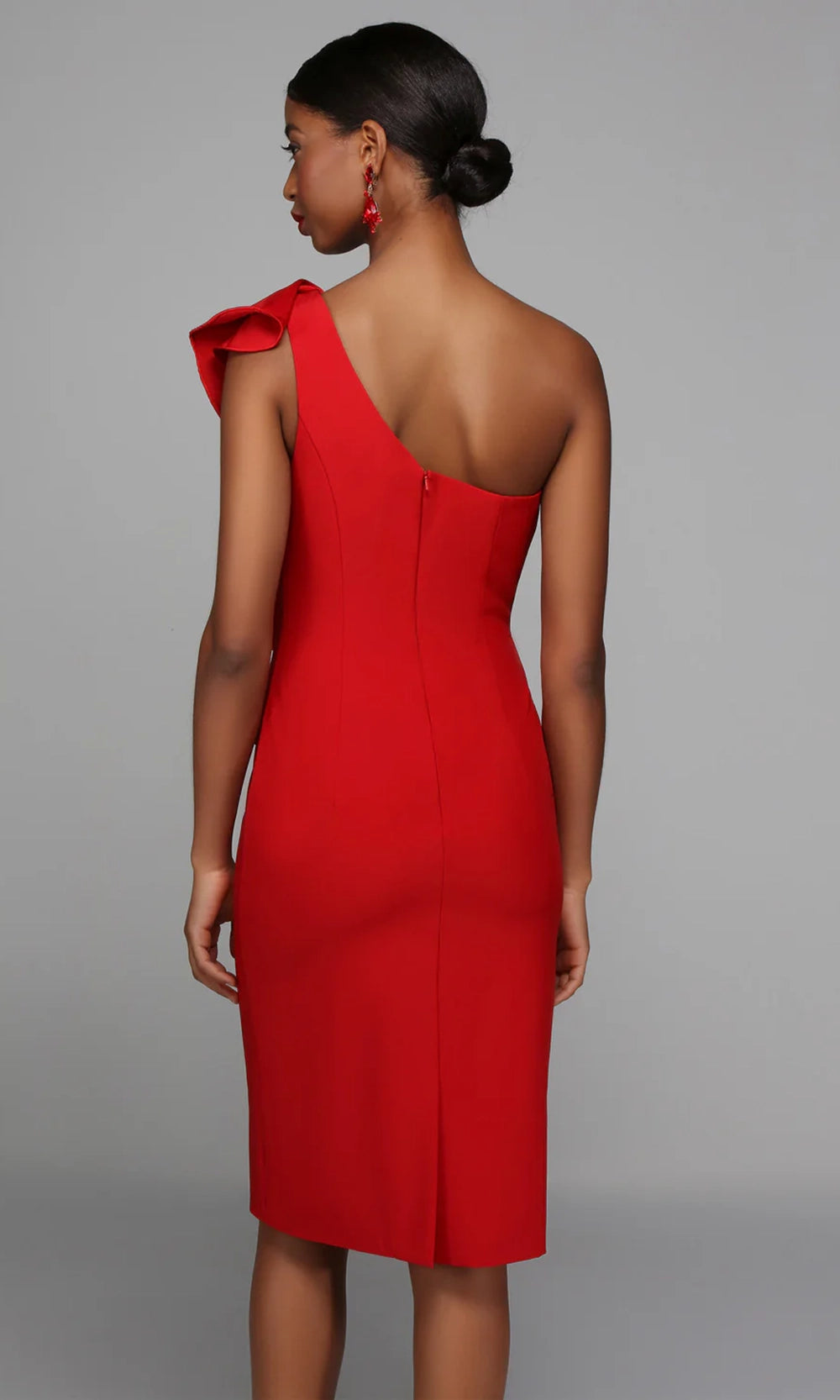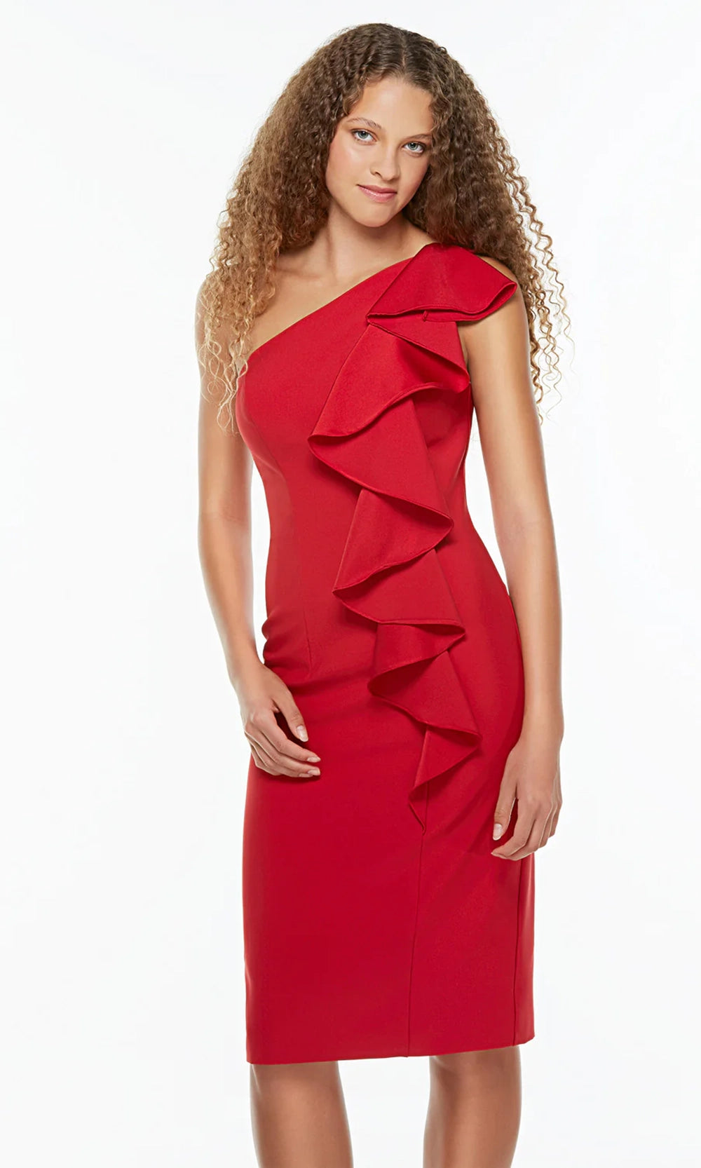 Take center stage in the Alyce Paris 70008 minimalist dress crafted to enhance your quiet elegance and unwavering confidence. The single shoulder wide strap and asymmetric neckline are complemented by a cascading ruffle that extends vertically across the bodice, delivering movement and structure in one sleek gesture. Crafted in stretch crepe for a smooth finish, the natural waist and knee-length sheath skirt shape a streamlined silhouette that is modern yet timeless. Whether for a formal brunch, cocktail party, or reception, Alyce Paris 70008 balances striking detail with refined fit for a versatile standout look. Model is wearing Red color.