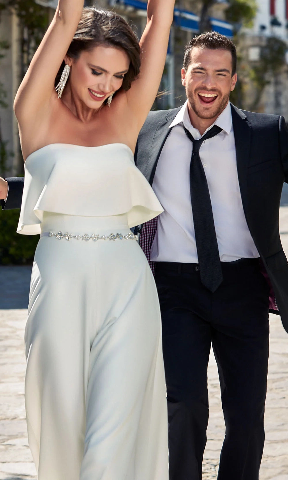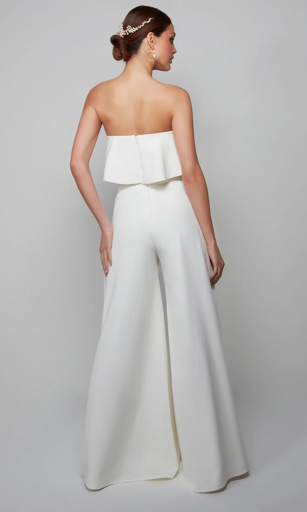 Modern minimalism is beautifully expressed in Alyce Paris 70015, a jumpsuit that merges timeless lines with a fashion-forward attitude. The strapless bodice features a soft flounce overlay and semi-sweetheart neckline, adding movement and dimension without disrupting the clean silhouette. The natural waist leads into structured wide-leg pants, providing balance and elegance. Crafted in italian knit, this look captures effortless sophistication perfect for celebrations that call for contemporary grace. Alyce Paris 70015 is the embodiment of subtle confidence in formalwear. Model is wearing Ivory color.