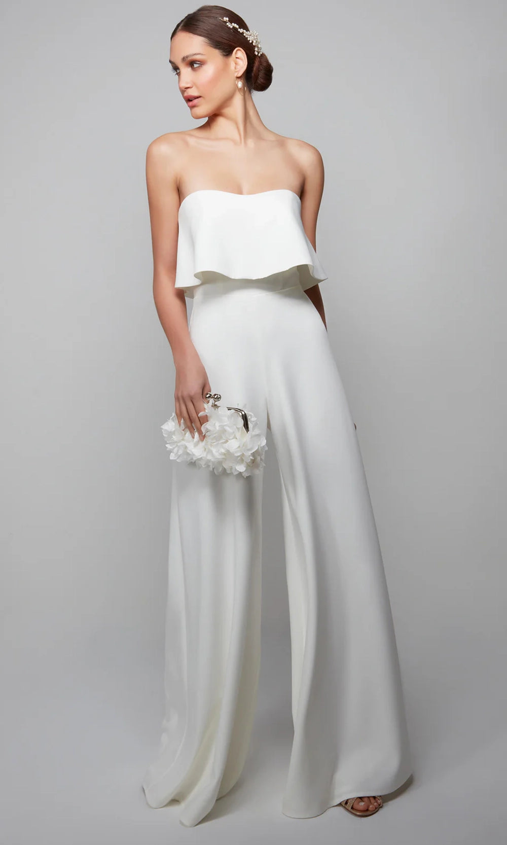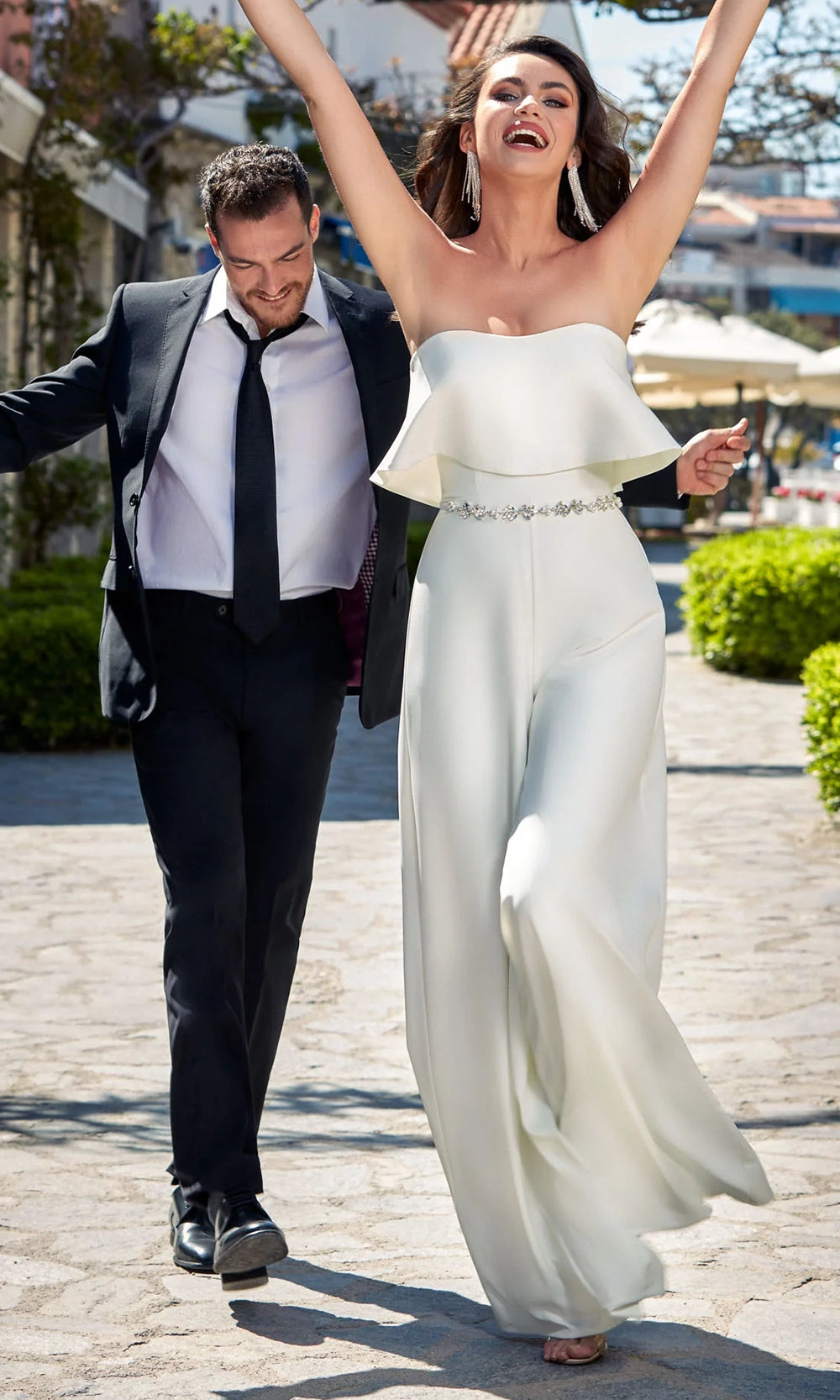 | Details: | Strapless, Flounce Overlay, Fitted Waist, Mid-Open Back, Wide-Leg Pants |