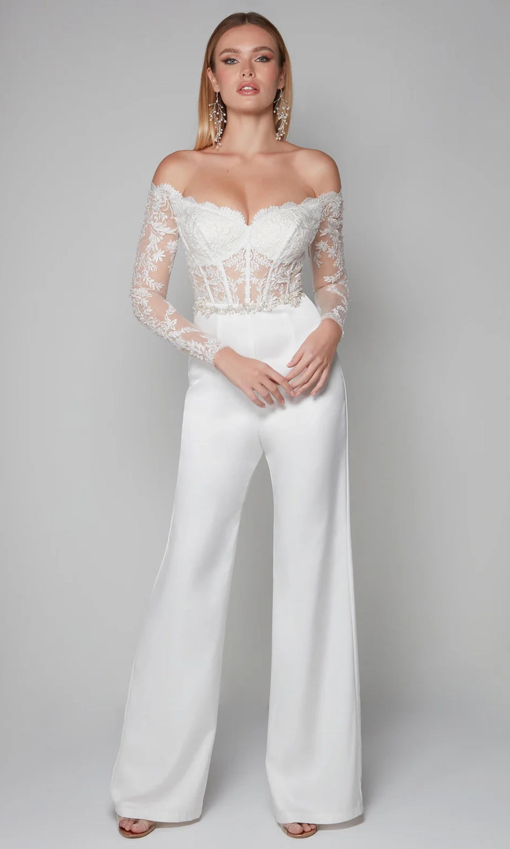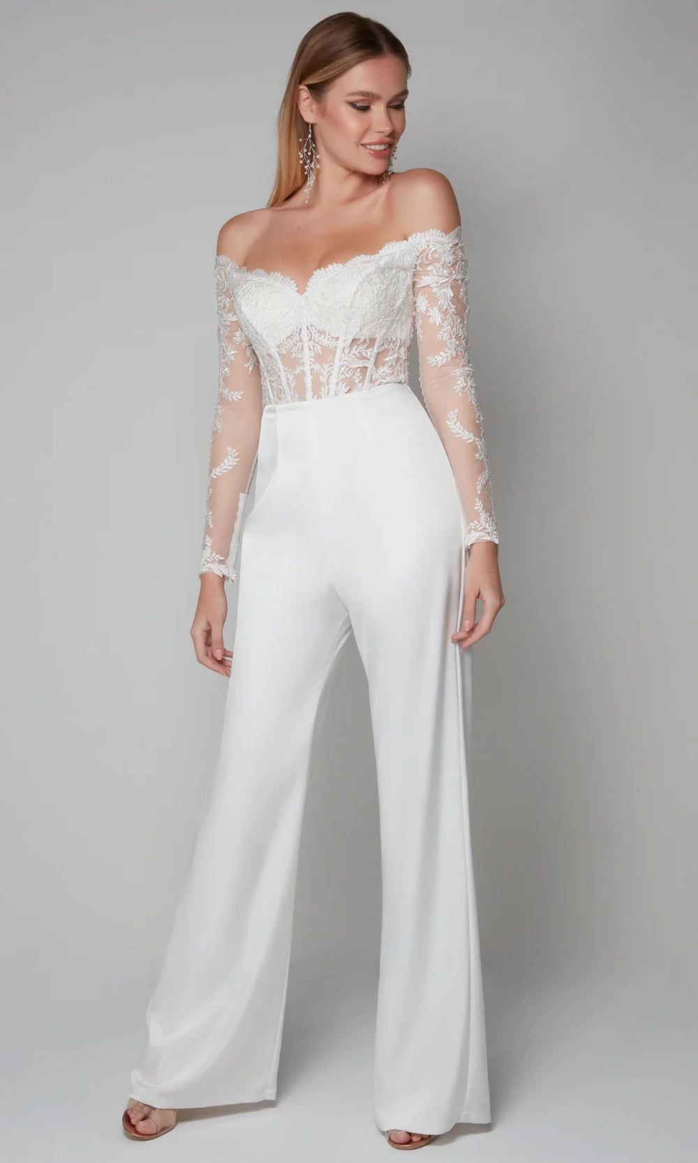 A refined balance of grace and structure defines the Alyce Paris 70018 jumpsuit, making it ideal for the modern woman with timeless taste. The scalloped trim off-shoulder neckline and sheer long sleeves are adorned with embroidery, showcasing the intricacy of the lace bodice. Flowing into smooth straight satin pants, the silhouette is sophisticated and flattering. Its sheer corset boning bodice enhances the shape without sacrificing comfort. Alyce Paris 70018 is perfect for elegant gatherings where detail and design are equally celebrated. Model is wearing Diamond White color.