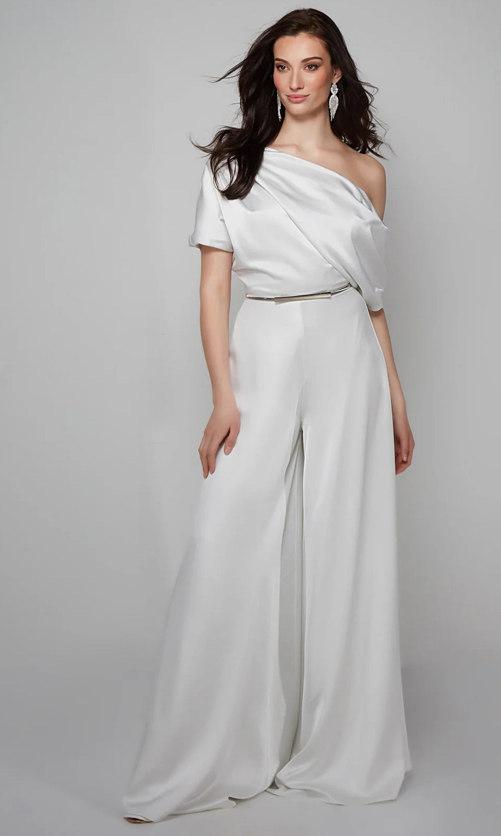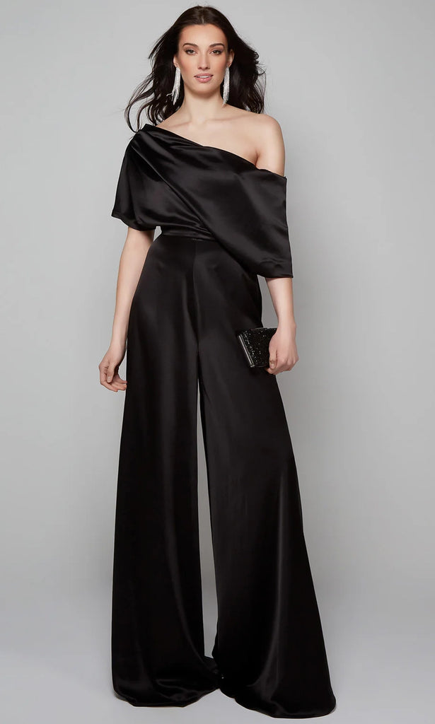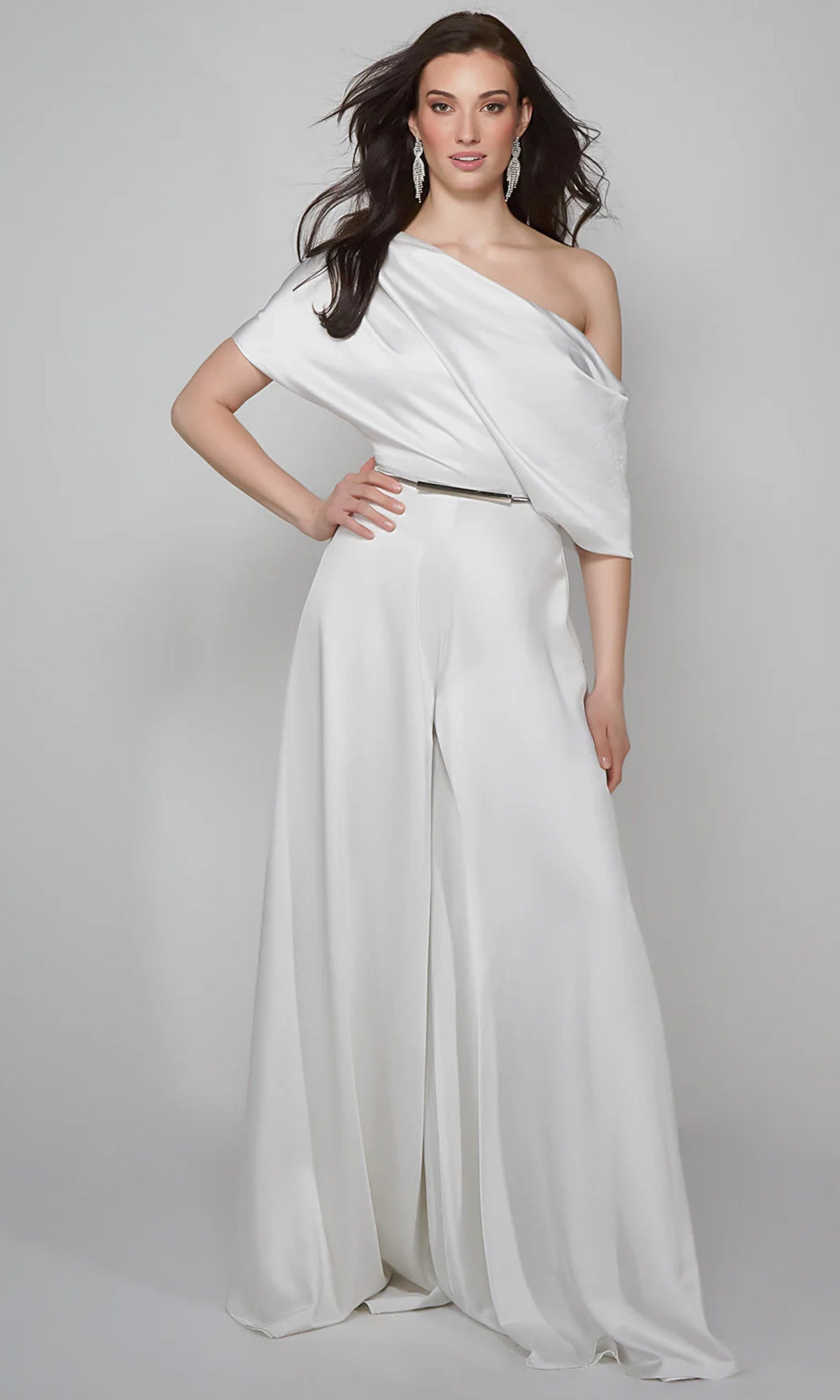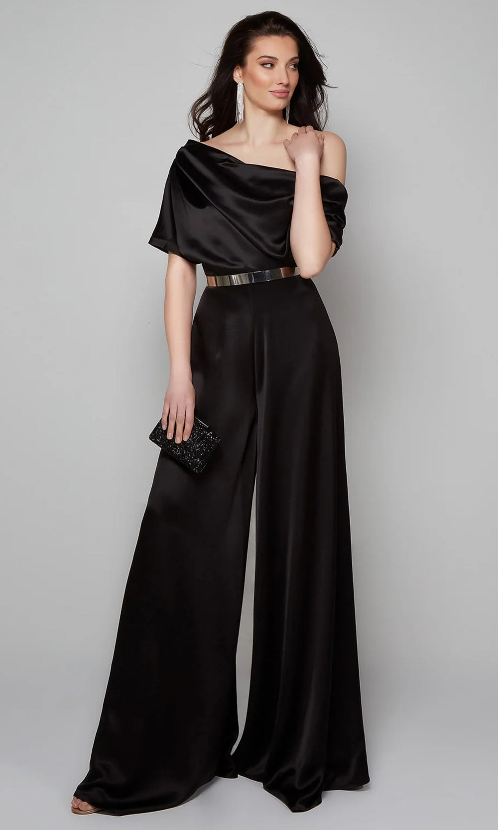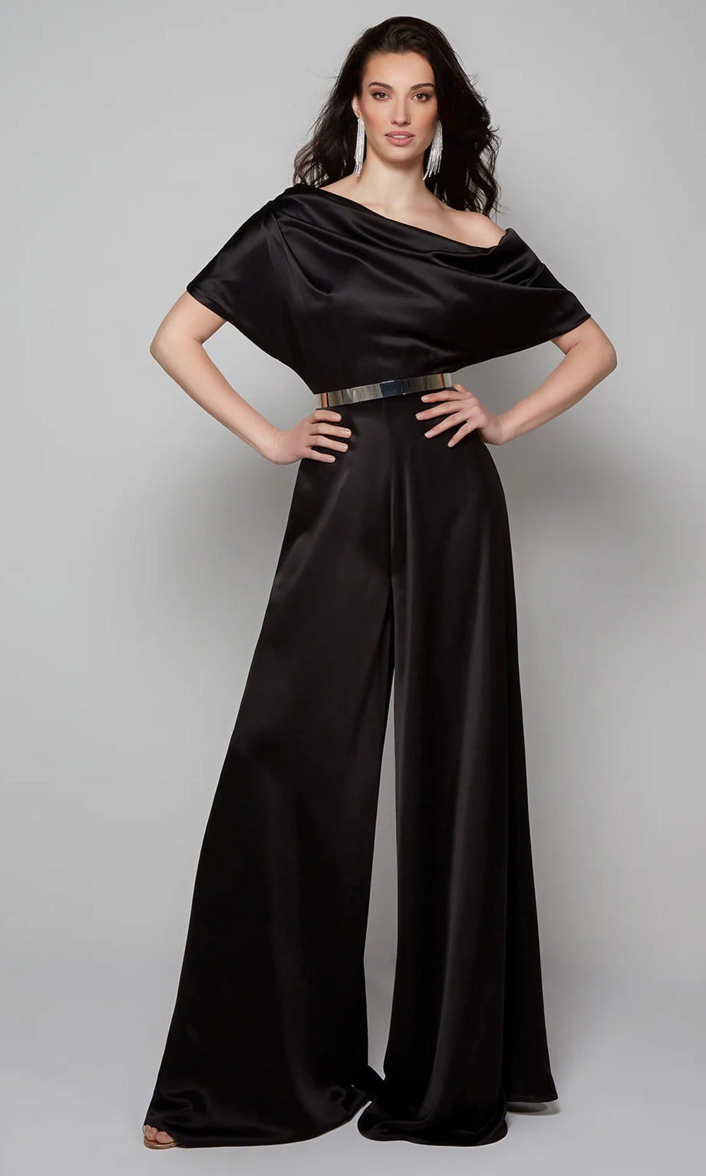 | Details: | Drape Bodice, Short Sleeves, Wide-Leg Pants, Concealed Back Zipper, Mid-Open Back |