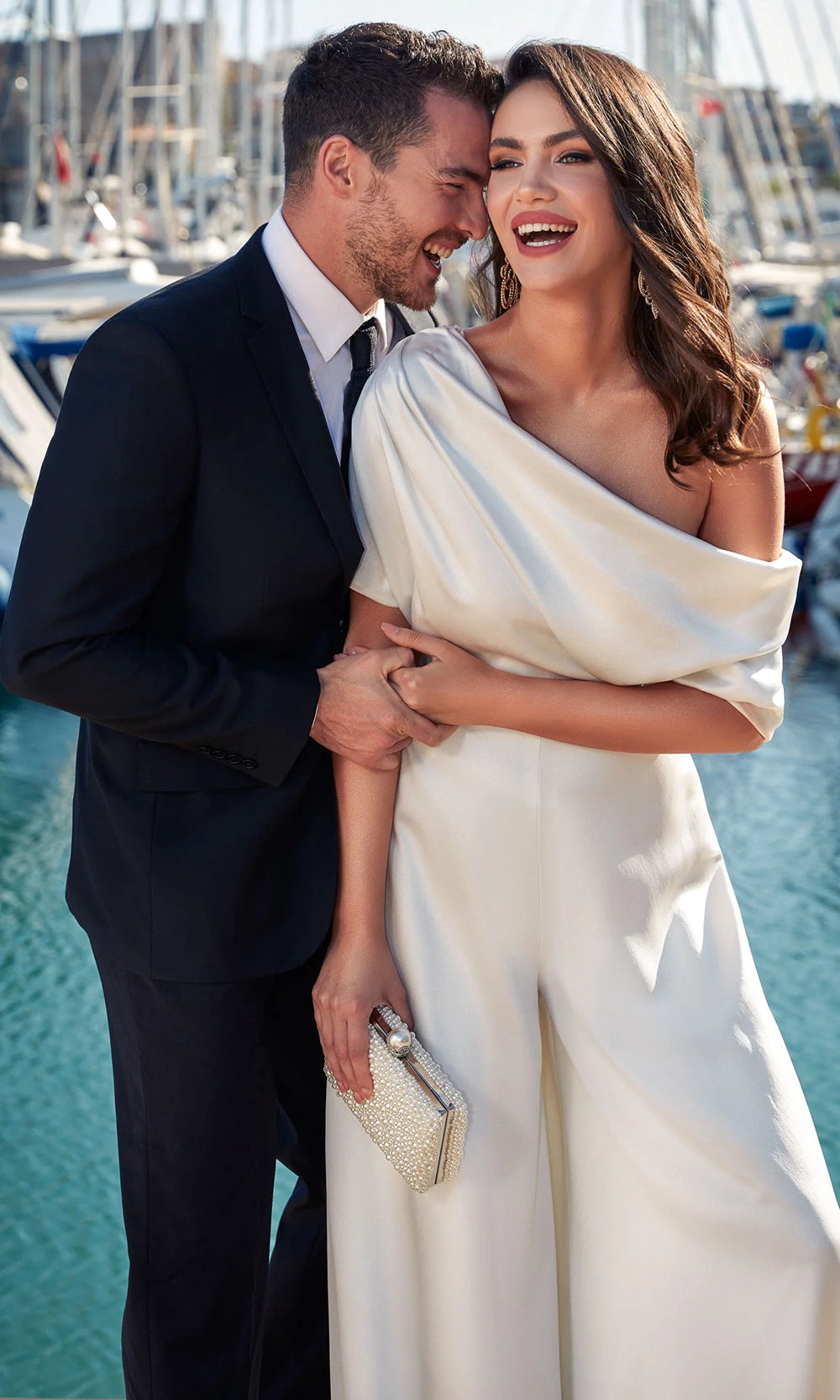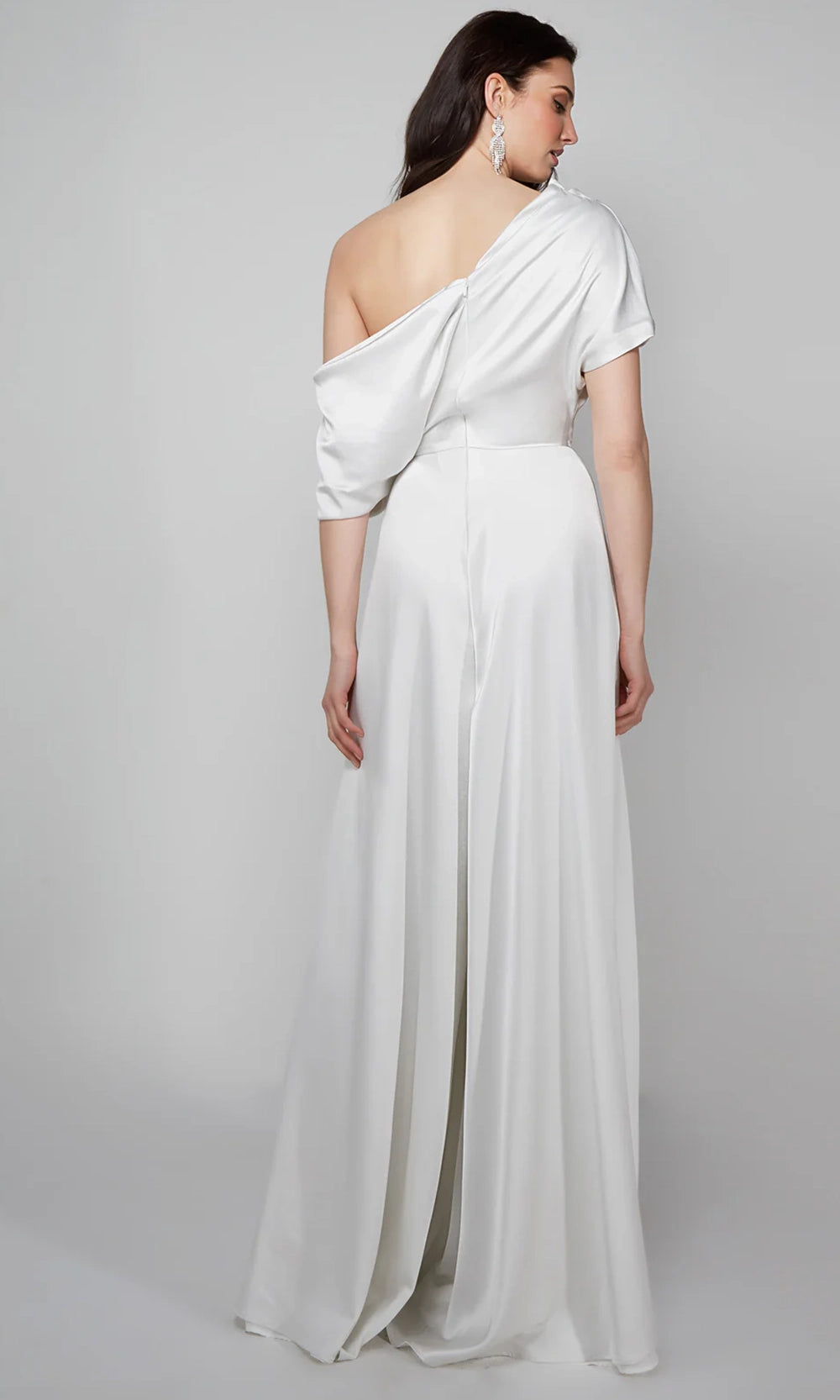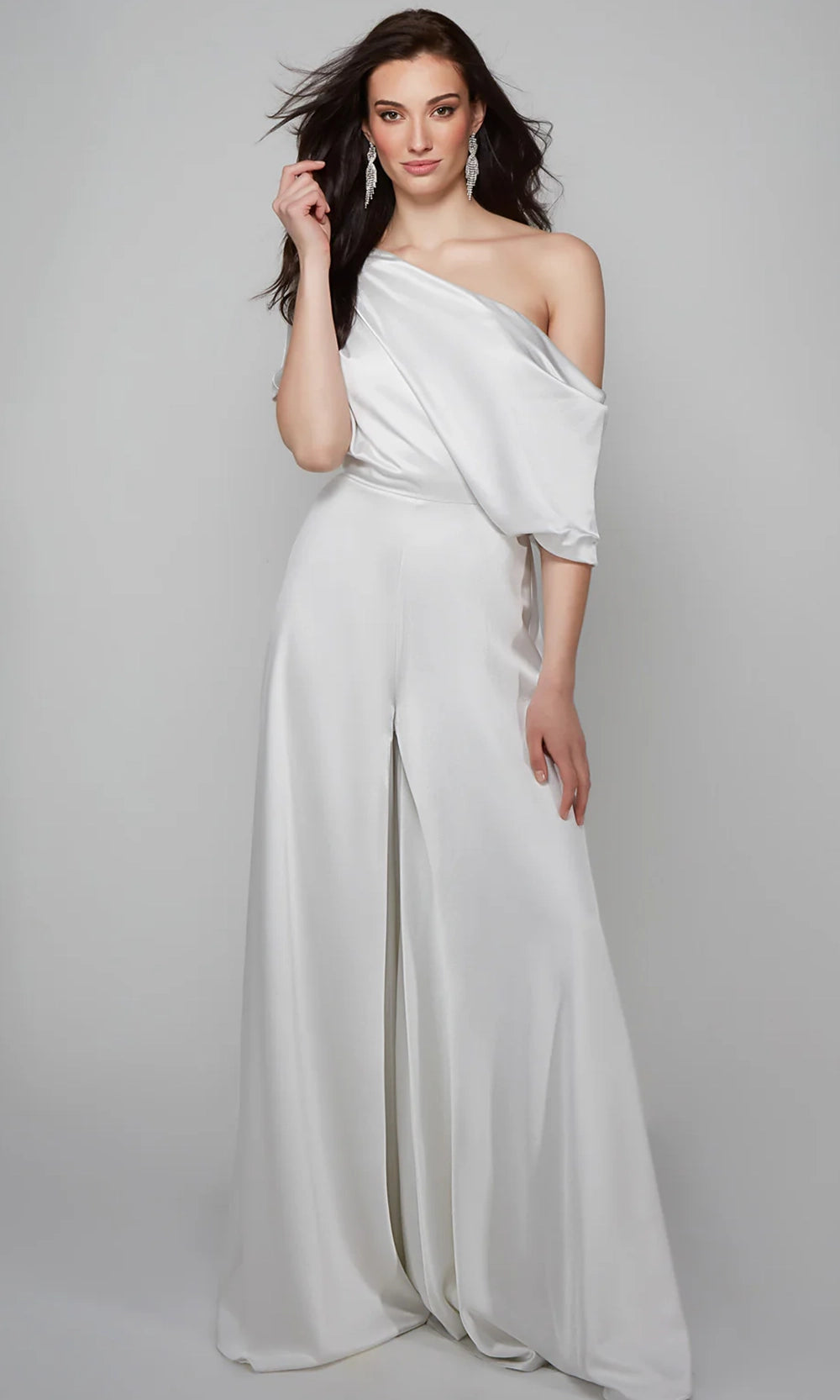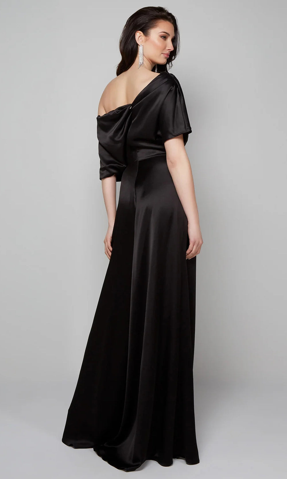 | Details: | Drape Bodice, Short Sleeves, Wide-Leg Pants, Concealed Back Zipper, Mid-Open Back |