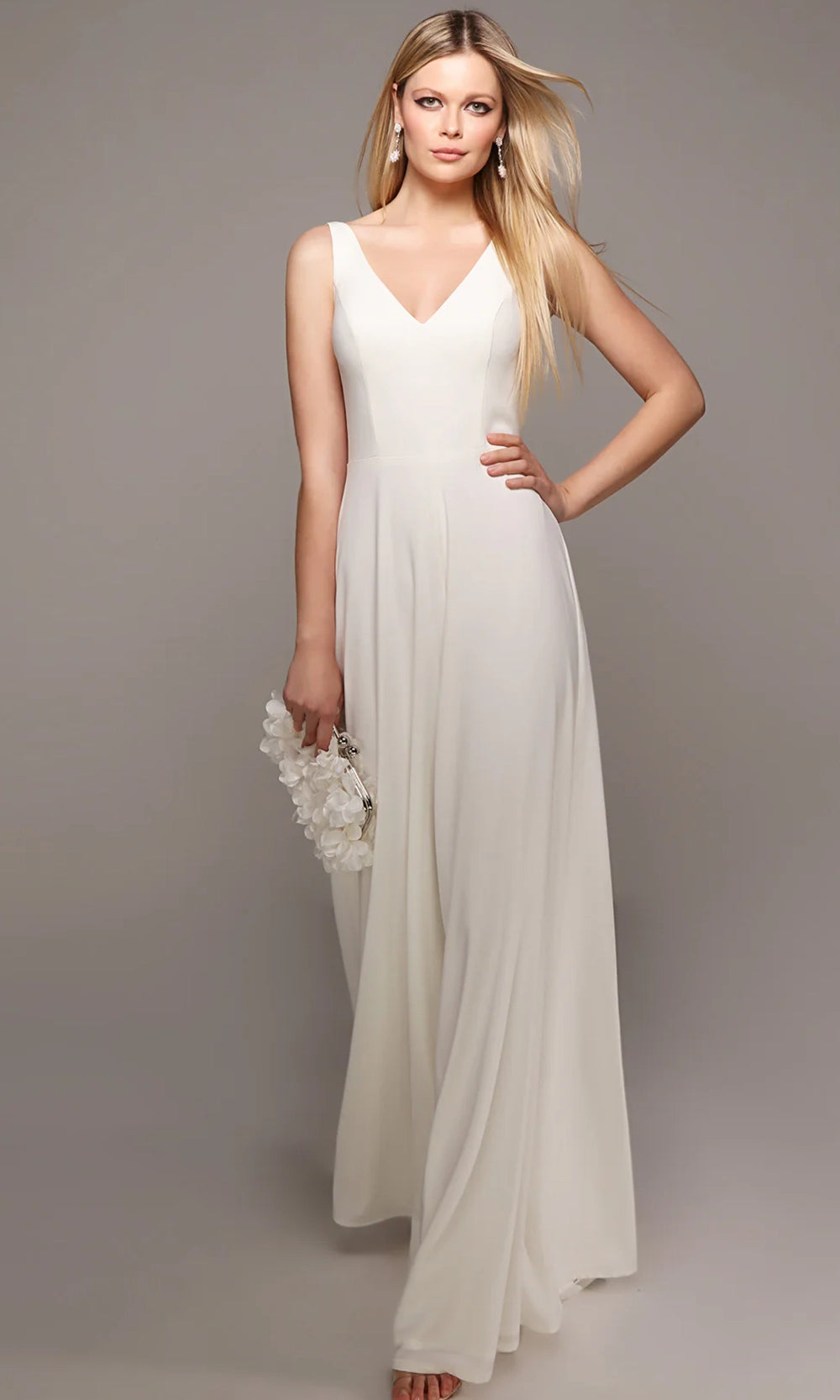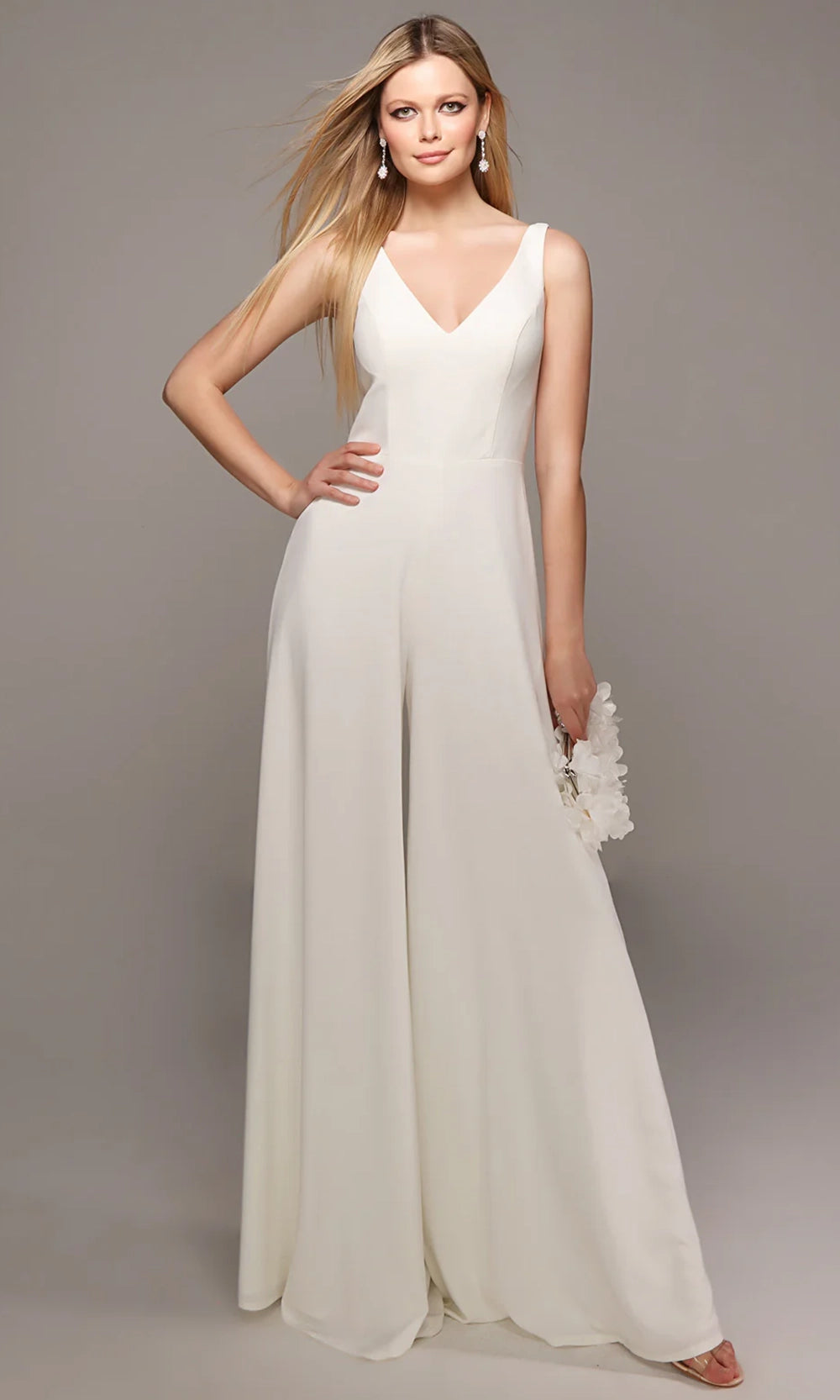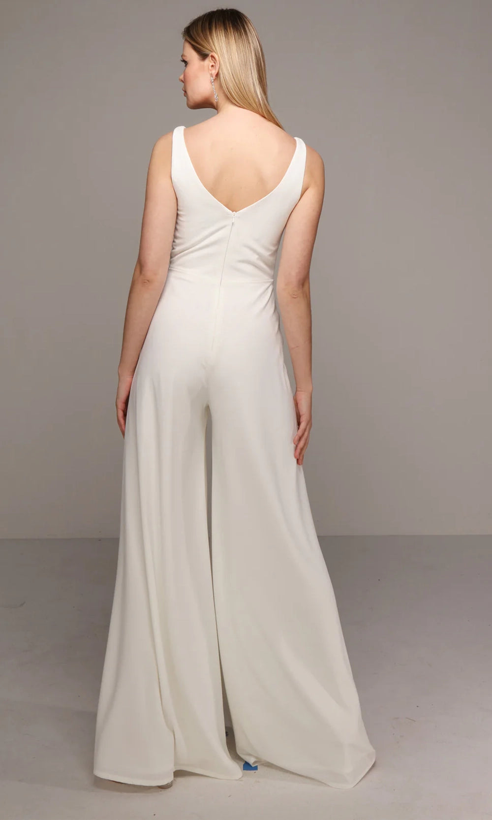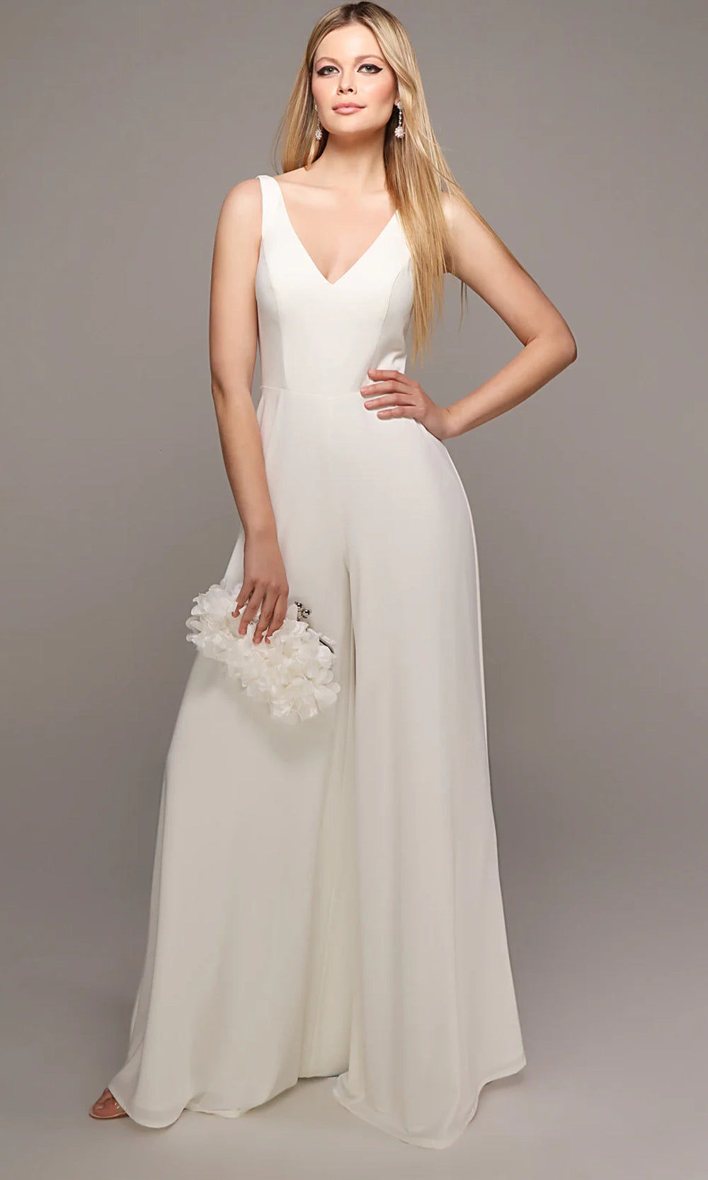 The Alyce Paris 70021 jumpsuit offers a minimalist profile with subtle sophistication in every detail. Elevated with a deep V-neck and tailored seams, this contemporary jumpsuit is ideal for those who favor understated charm. Its flowy wide-leg silhouette flows with grace, while the fitted bodice creates a striking balance. Whether paired with statement accessories or worn solo, this piece invites compliments with every step. Let Alyce Paris 70021 redefine your eveningwear with elegance that speaks volumes without saying a word. Model is wearing Ivory color.