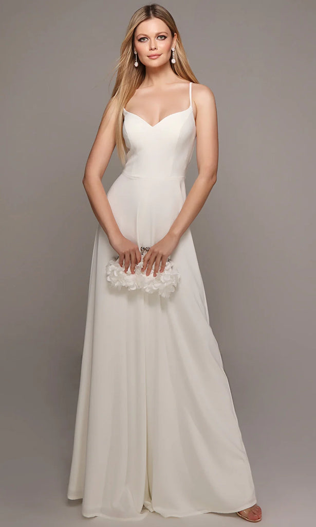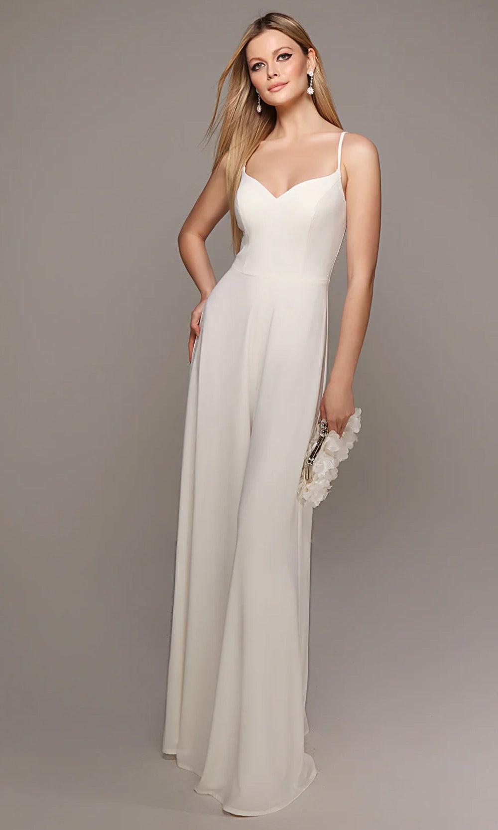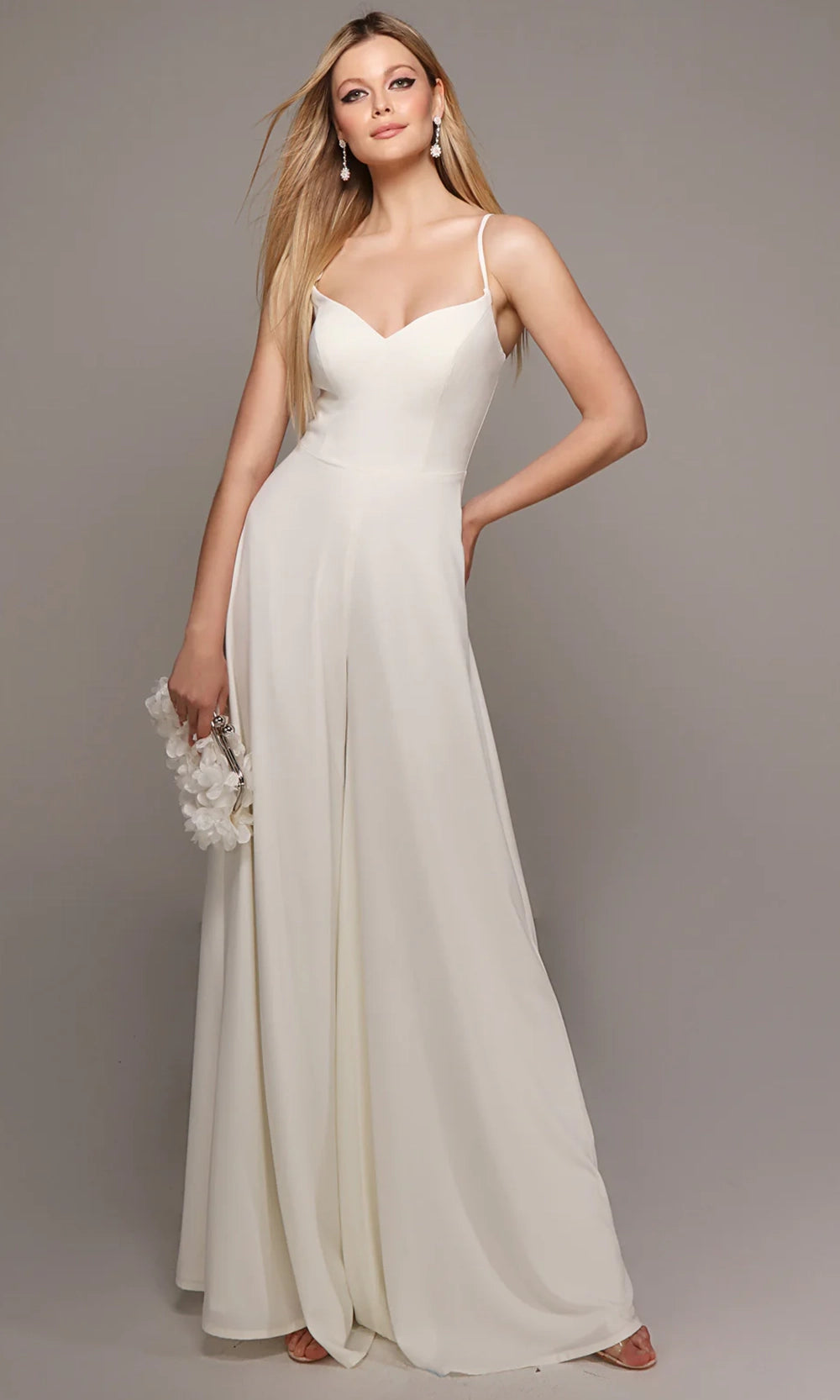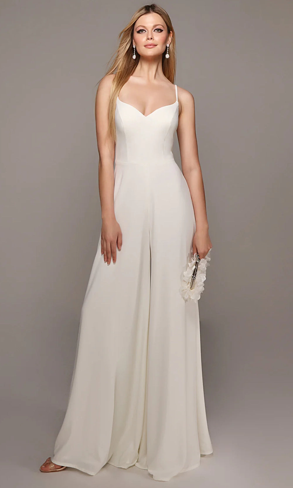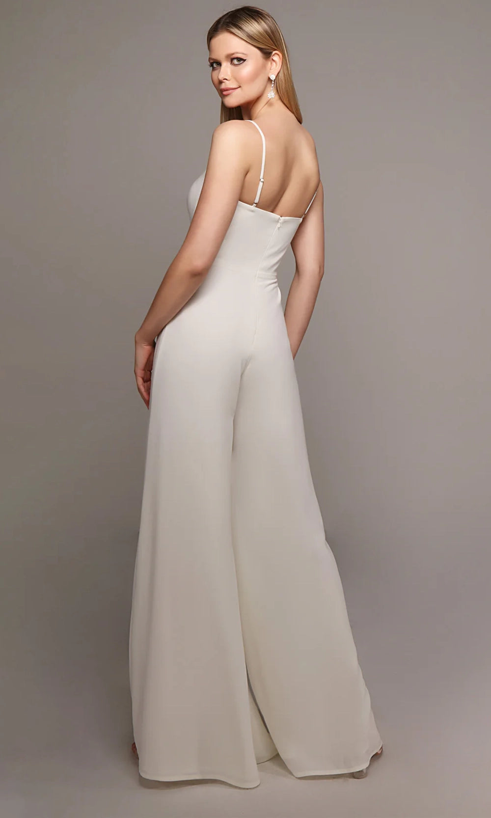 Refined in its simplicity, this Alyce Paris 70022 modern jumpsuit offers a figure-flattering silhouette with a romantic twist. The design pairs a structured bodice and sweetheart neckline with flowing wide-leg trousers. Adjustable spaghetti straps add to the delicate balance of detail and ease. Whether you are attending an elegant event or planning your own unforgettable moment, this piece rises to the occasion with effortless style. Let Alyce Paris 70022 bring your ensemble a polished and graceful finish that never feels overdone. Model is wearing Ivory color.