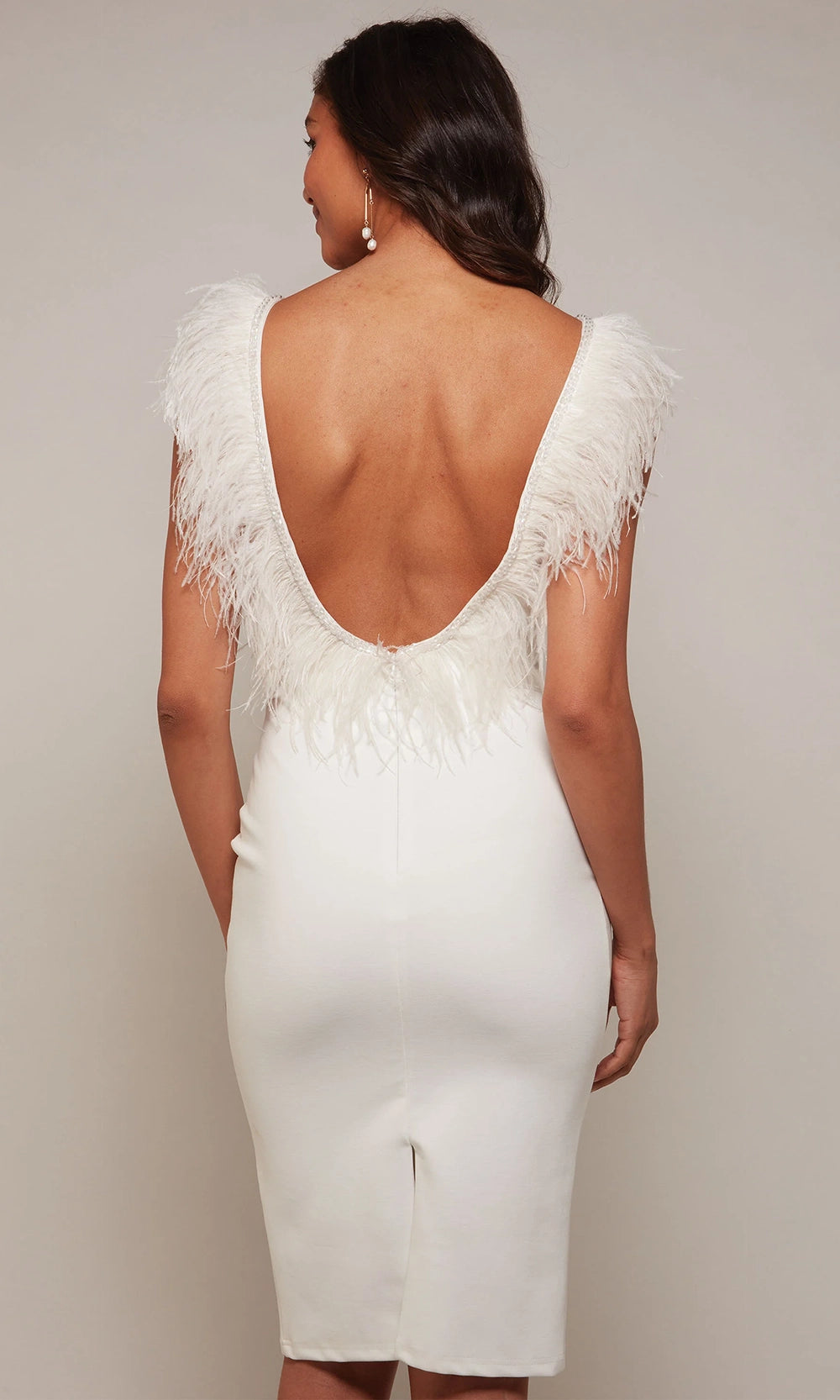 | Details: | Feather Trimmed, Sleeveless, Illusion Mesh Inset, Scoop Back, Center Back Slit |