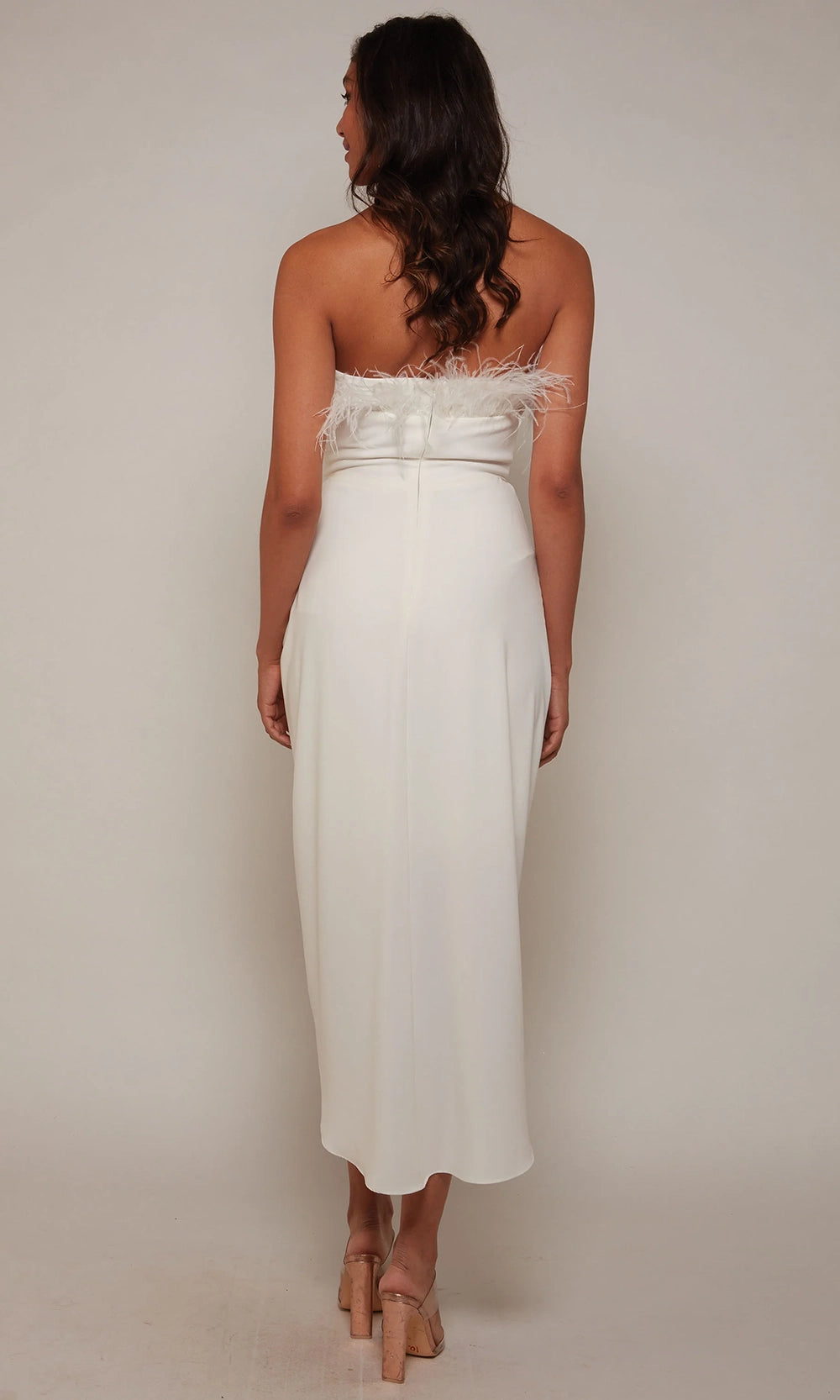 | Details: | Strapless, Feather Trim Bodice, Draped Front Skirt, Fitted, Mid-Open Back |