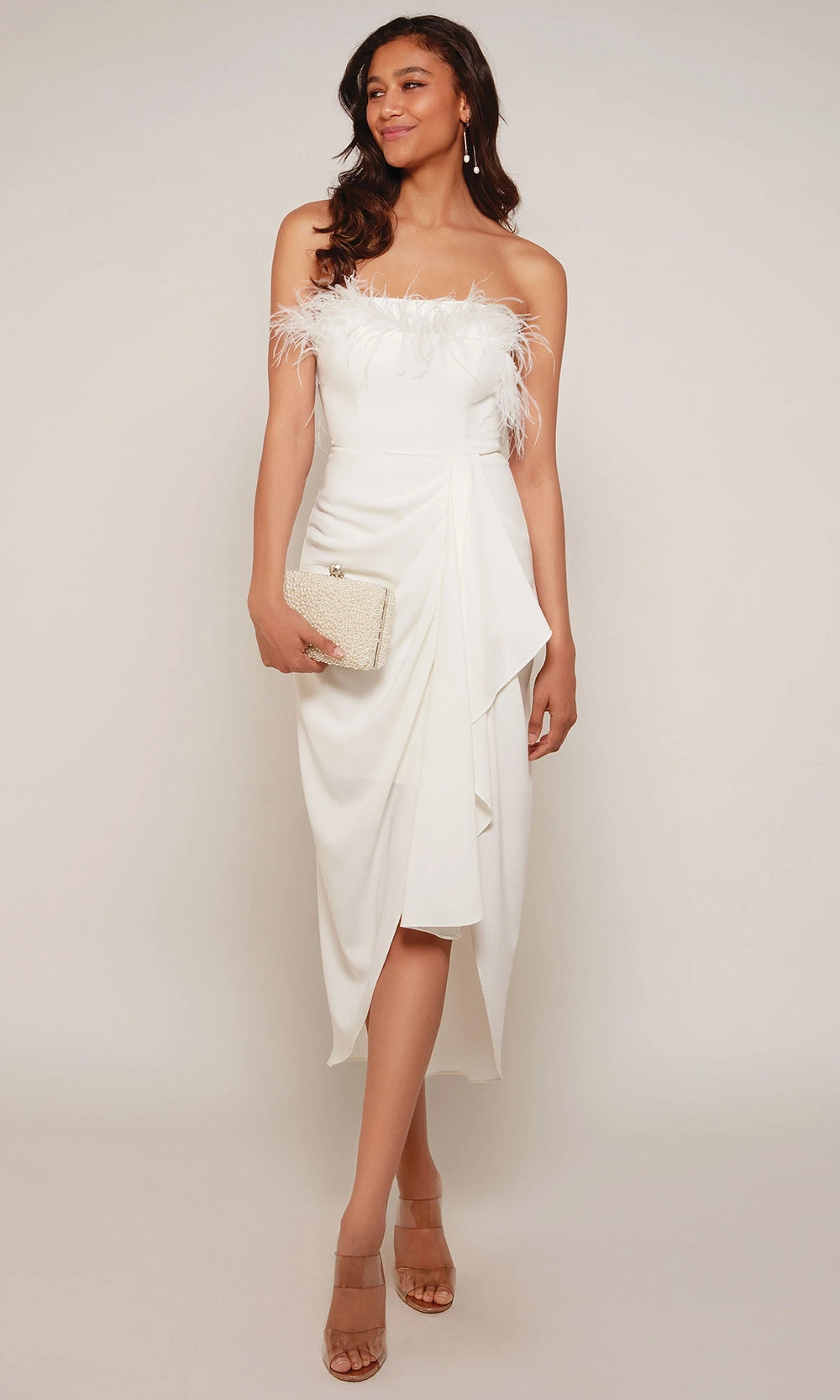Fresh and refined, Alyce Paris 70034 offers a playful take on formal dressing with its strapless feather-trimmed bodice and sculpted sheath base. A draped front overlay cascades from the waistline, introducing graceful texture and soft asymmetry to the clean silhouette. The tea-length hem offers a vintage-inspired cut that feels modern and versatile. Designed to elevate a contemporary wardrobe, Alyce Paris 70034 is ideal for events that call for creativity and classic refinement in one standout look. Model is wearing Ivory color.