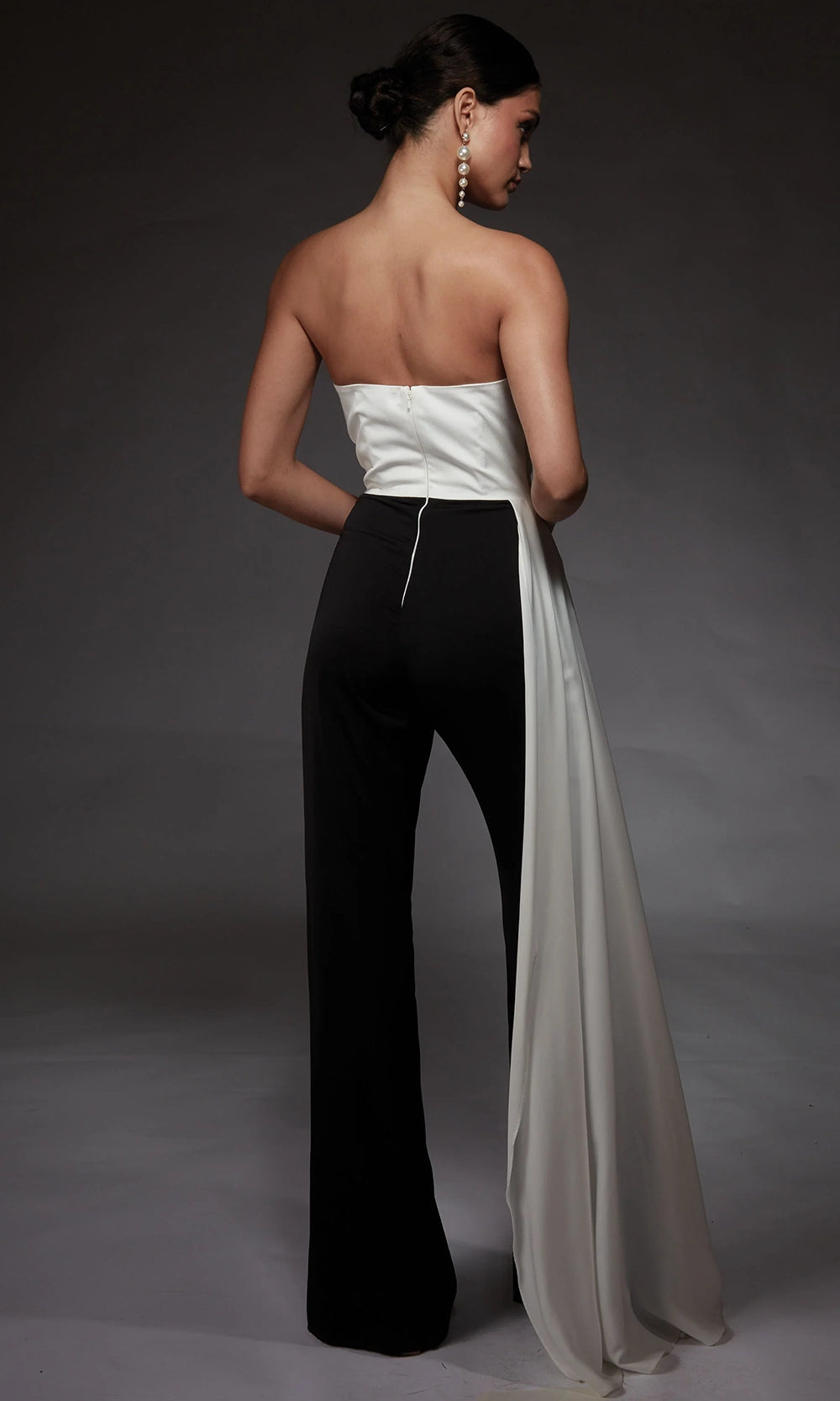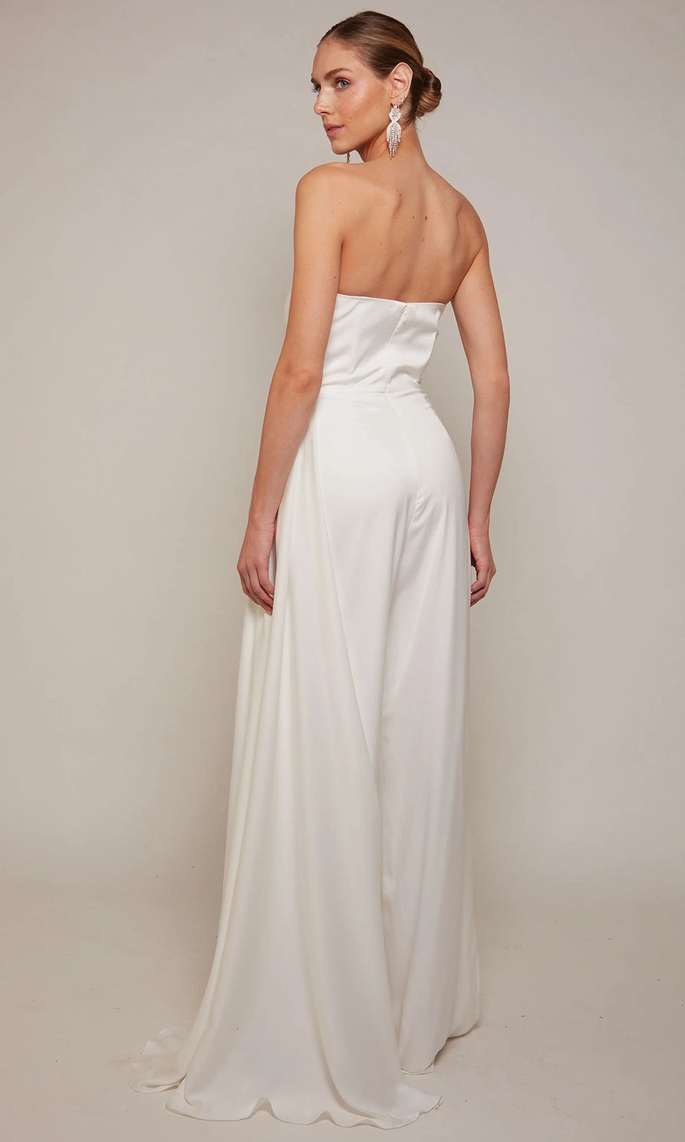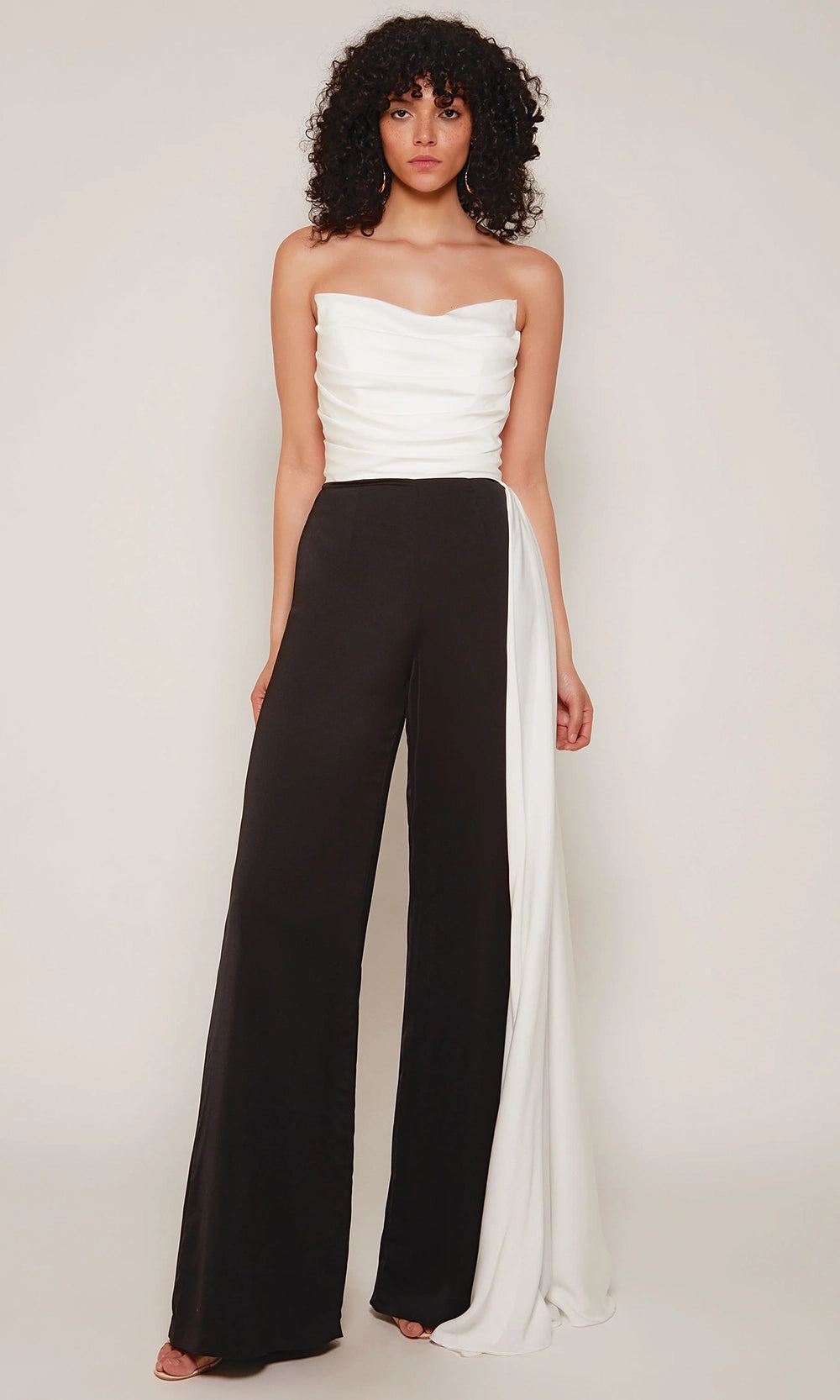 | Details: | Strapless, Ruched Bodice, Wide-Leg Pants, Mid-Open Back, Side Draped |