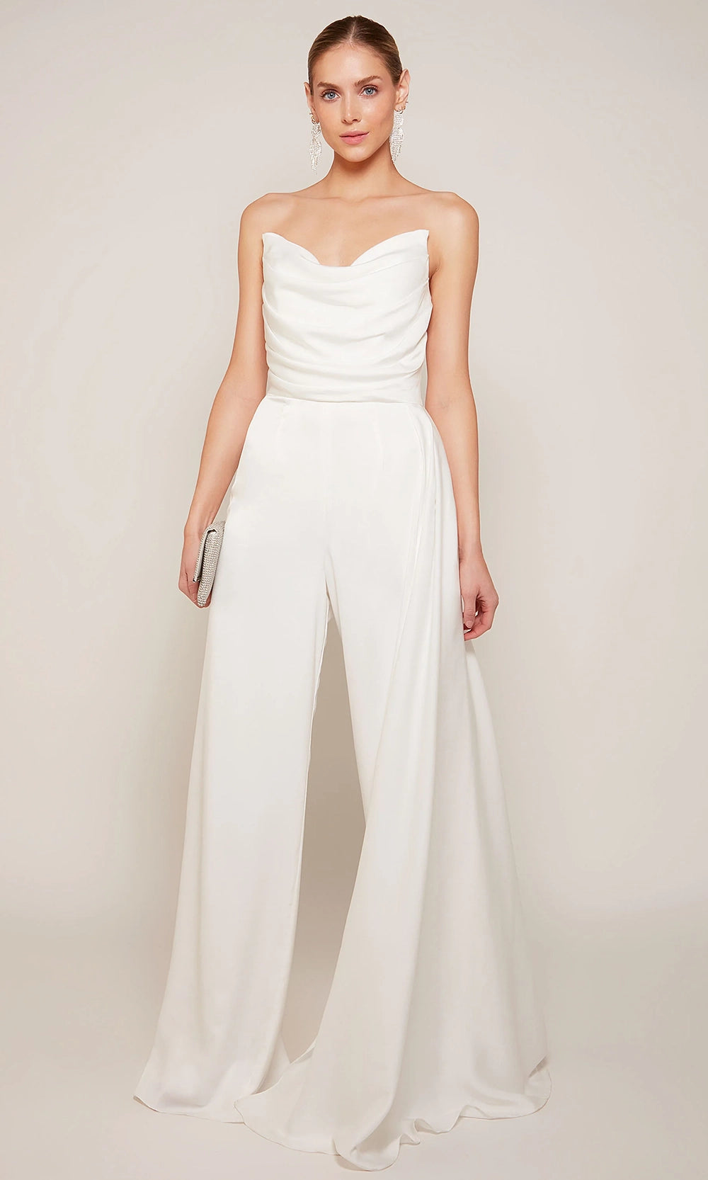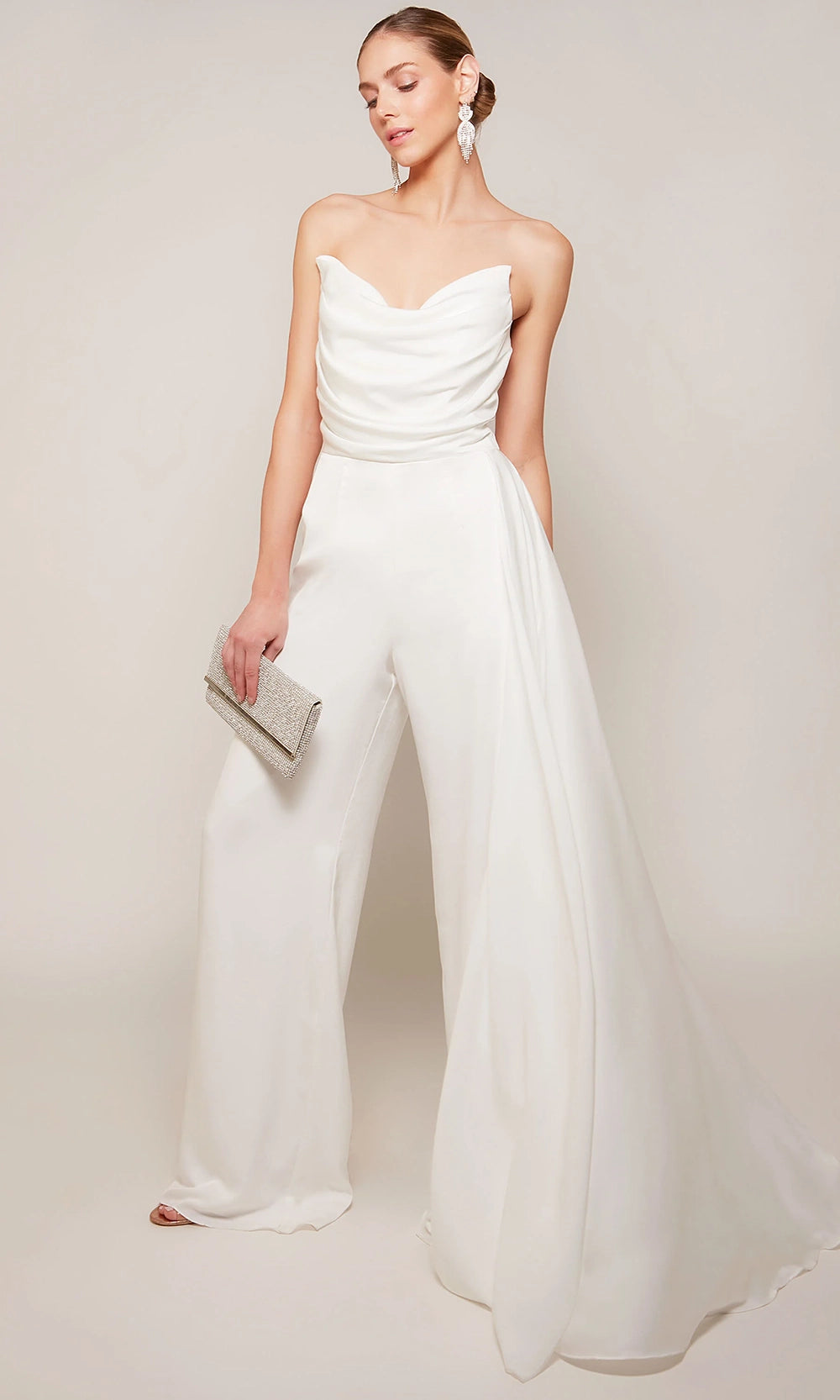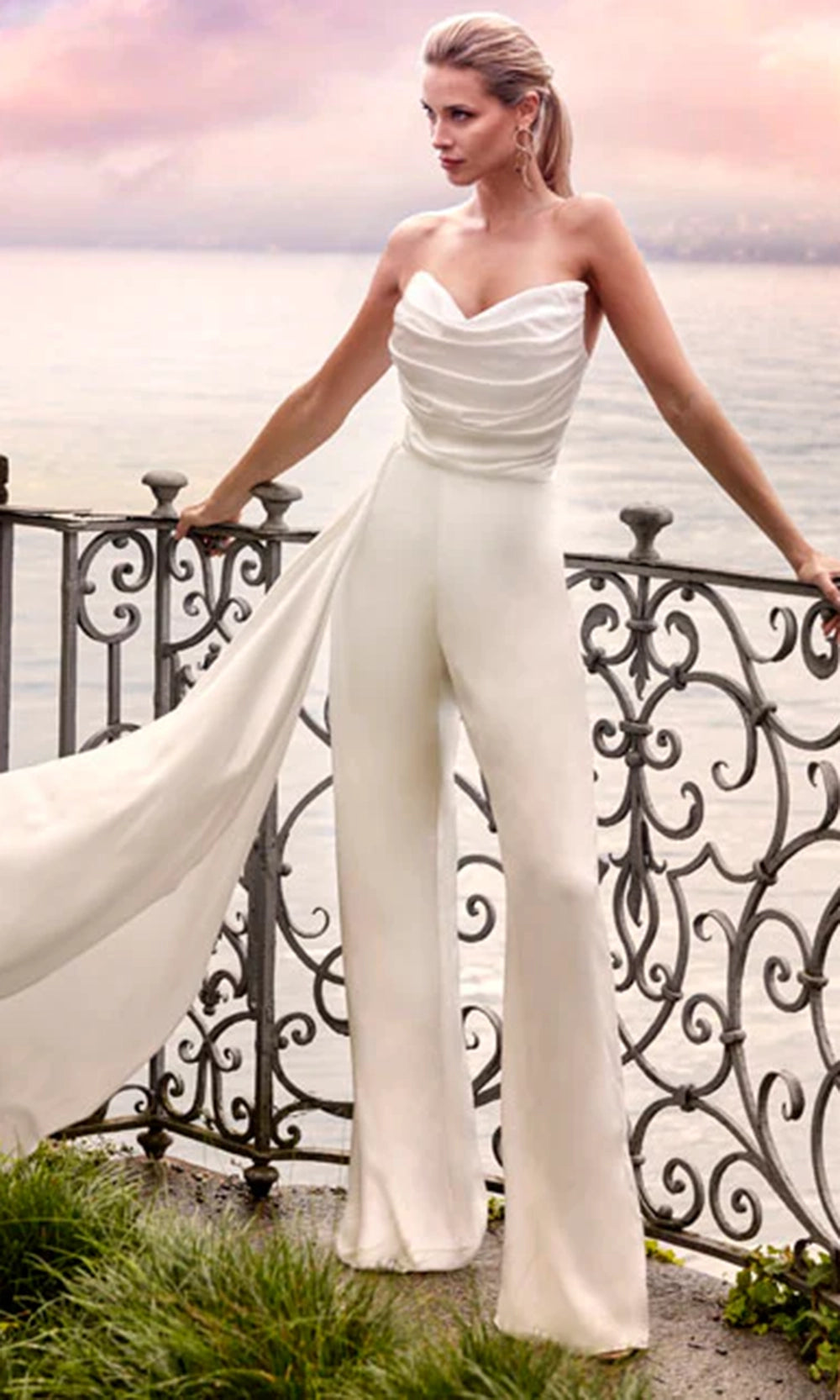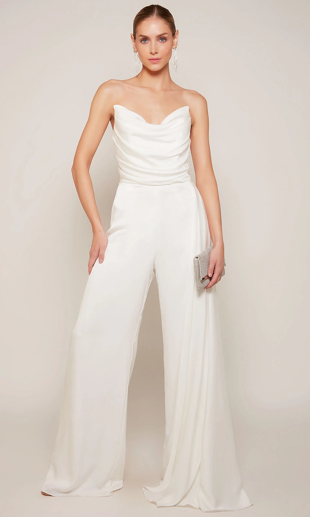 | Details: | Strapless, Ruched Bodice, Wide-Leg Pants, Mid-Open Back, Side Draped |