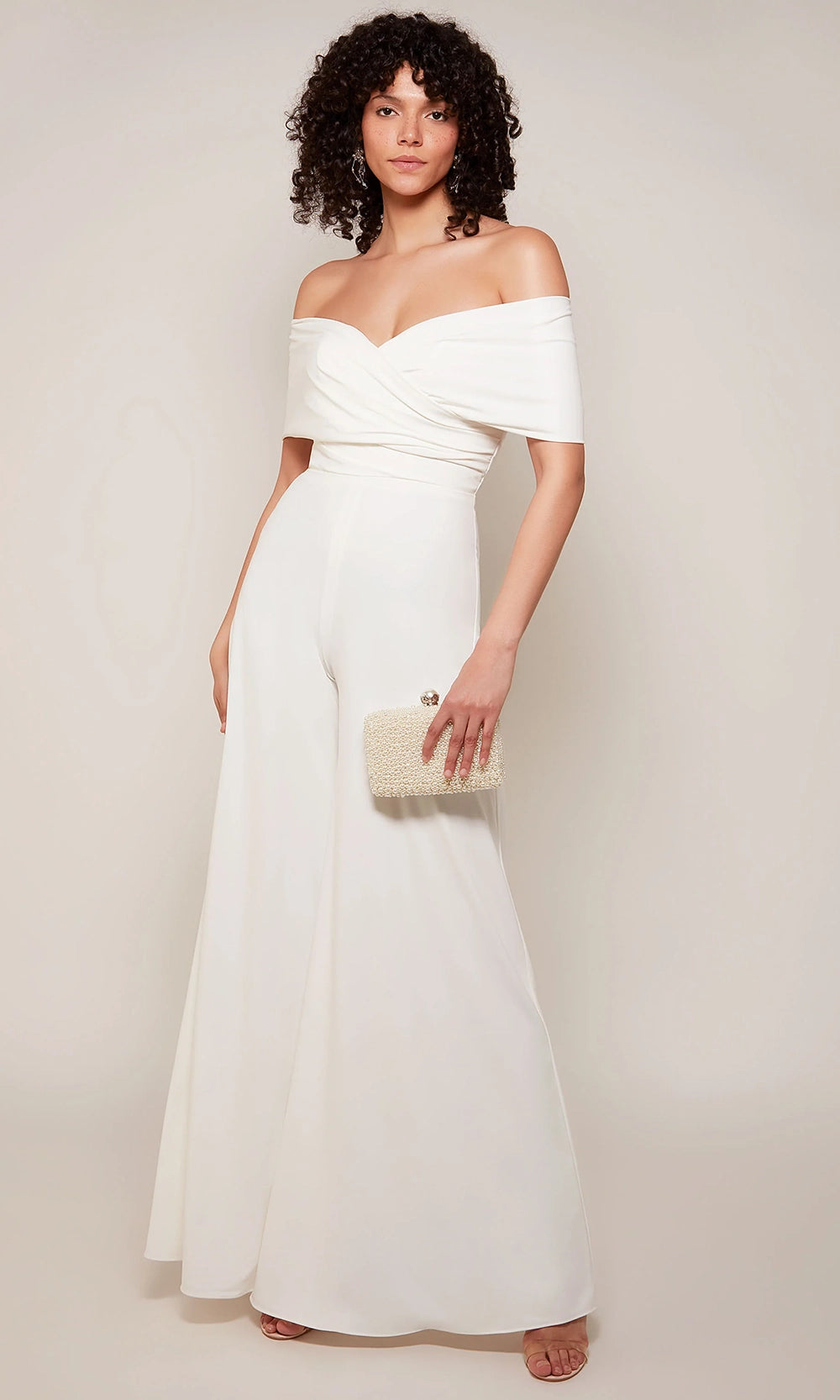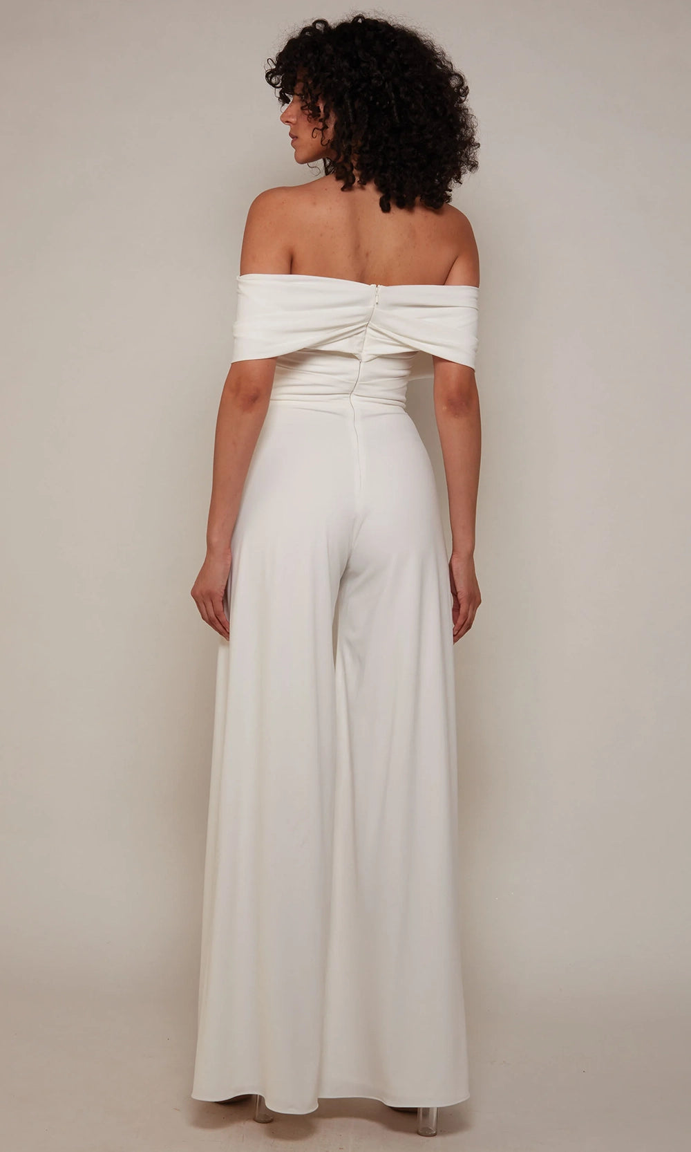 Poised for both sophistication and comfort, the Alyce Paris 70051 blends soft structure with contemporary flair in a jumpsuit made to flatter. The sweetheart off-shoulder neckline and short sleeves pairs with a sculpted bodice that gracefully transitions into flowing wide-leg pants. With its solid satin design and ruched surplice bodice, this piece embodies polished charm for the modern woman. Alyce Paris 70051 offers an elegant alternative to traditional gowns for fashion-forward events and upscale celebrations. Model is wearing Diamond White color.