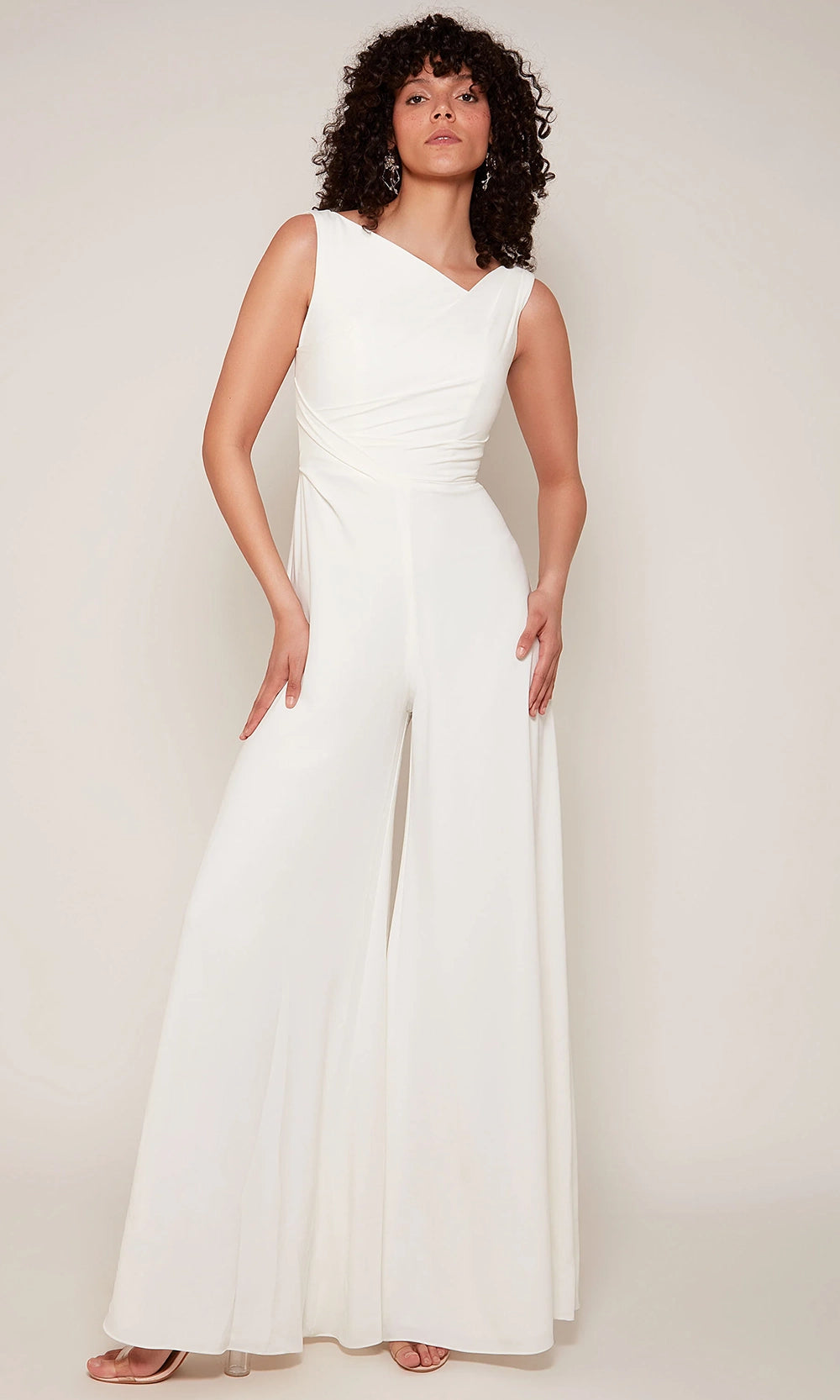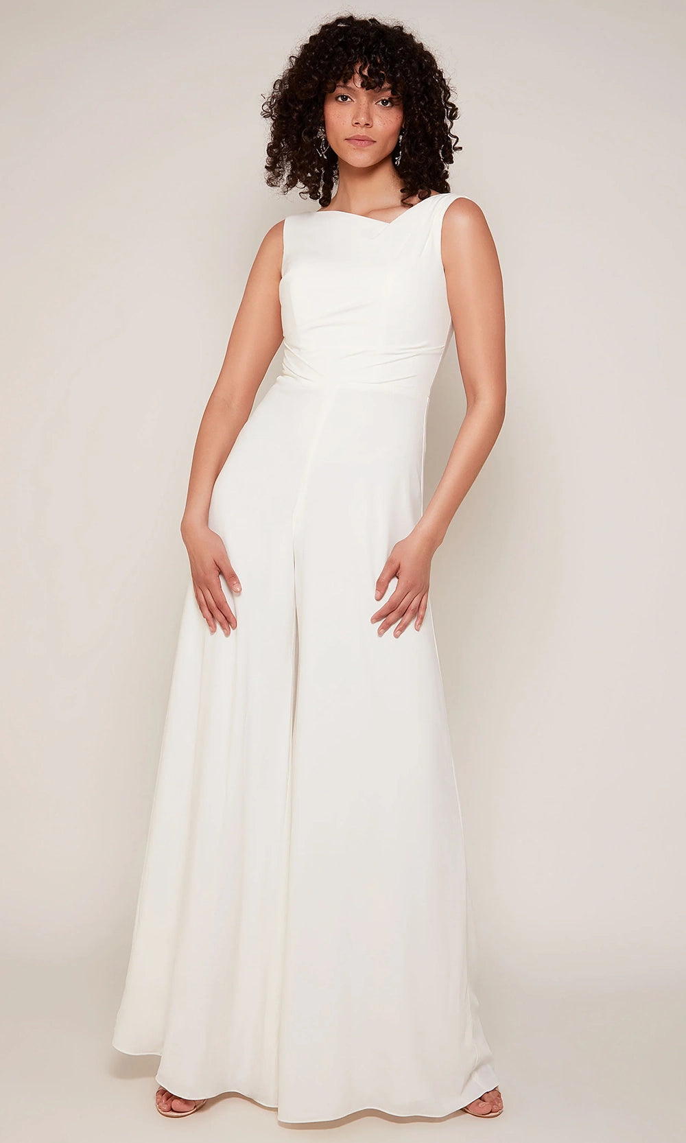 Modern elegance meets architectural structure in the Alyce Paris 70052, a sleeveless jumpsuit that redefines classic evening attire. The midrise V-shaped back and asymmetric neckline brings unexpected charm, complemented by a precisely ruched bodice that contours beautifully around the waist. Flowing wide-leg pants complete the look, offering movement and grace with every step. Alyce Paris 70052 is perfect for those who seek standout sophistication in a versatile and confident ensemble. Model is wearing Diamond White color.