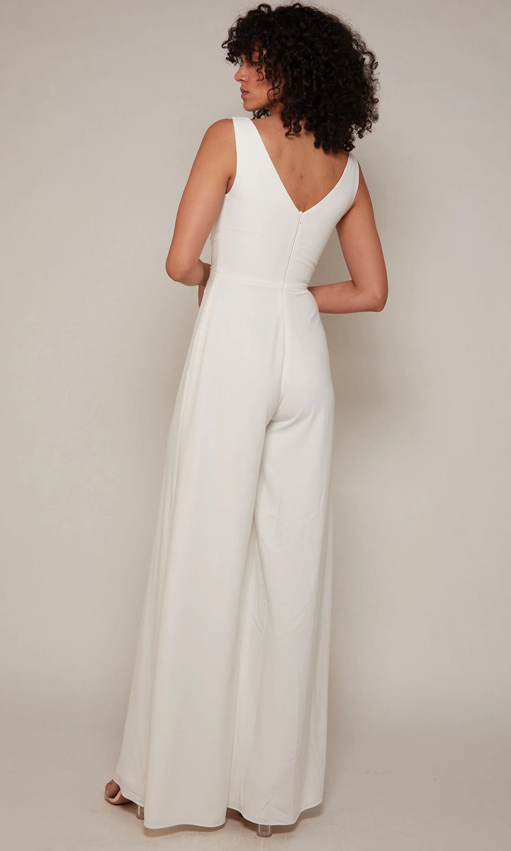 | Details: | Sleeveless, Ruched Bodice, V-Open Back, Zipper Closure, Wide-Leg Pants |