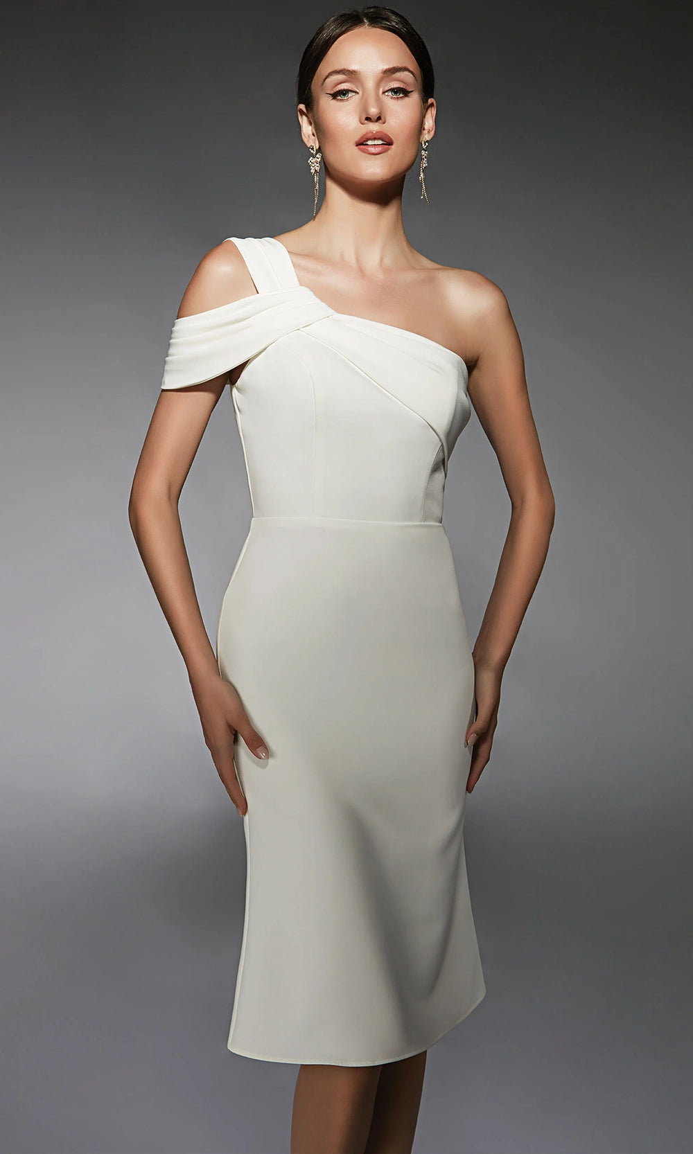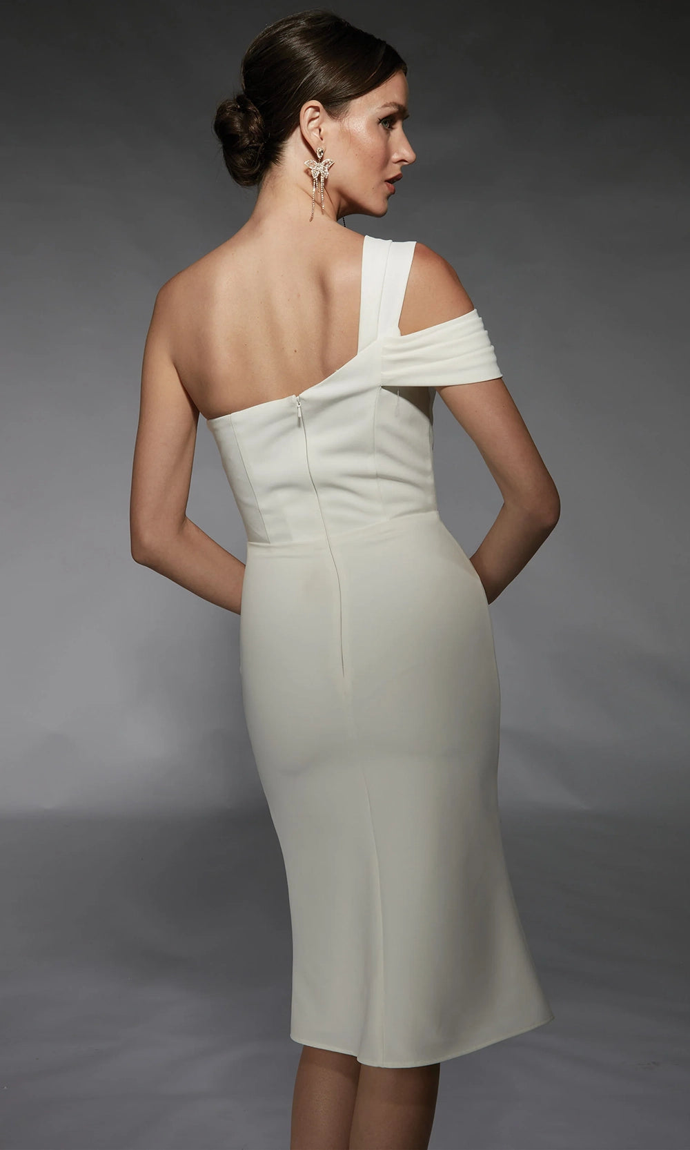 Prepare to charm every eye in the Alyce Paris 70054, a fitted style that redefines cocktail elegance with its asymmetric neckline and cold shoulder sleeve. An expertly pleated bodice wraps the torso in a flattering embrace, while the knee-length sheath silhouette offers a timeless, tailored appeal. Seam placement enhances the body natural curves, and its minimalist design ensures lasting style. The graceful structure and thoughtful craftsmanship of Alyce Paris 70054 dress make it a standout staple in any formal wardrobe. Models are wearing Ivory, and Royal colors.