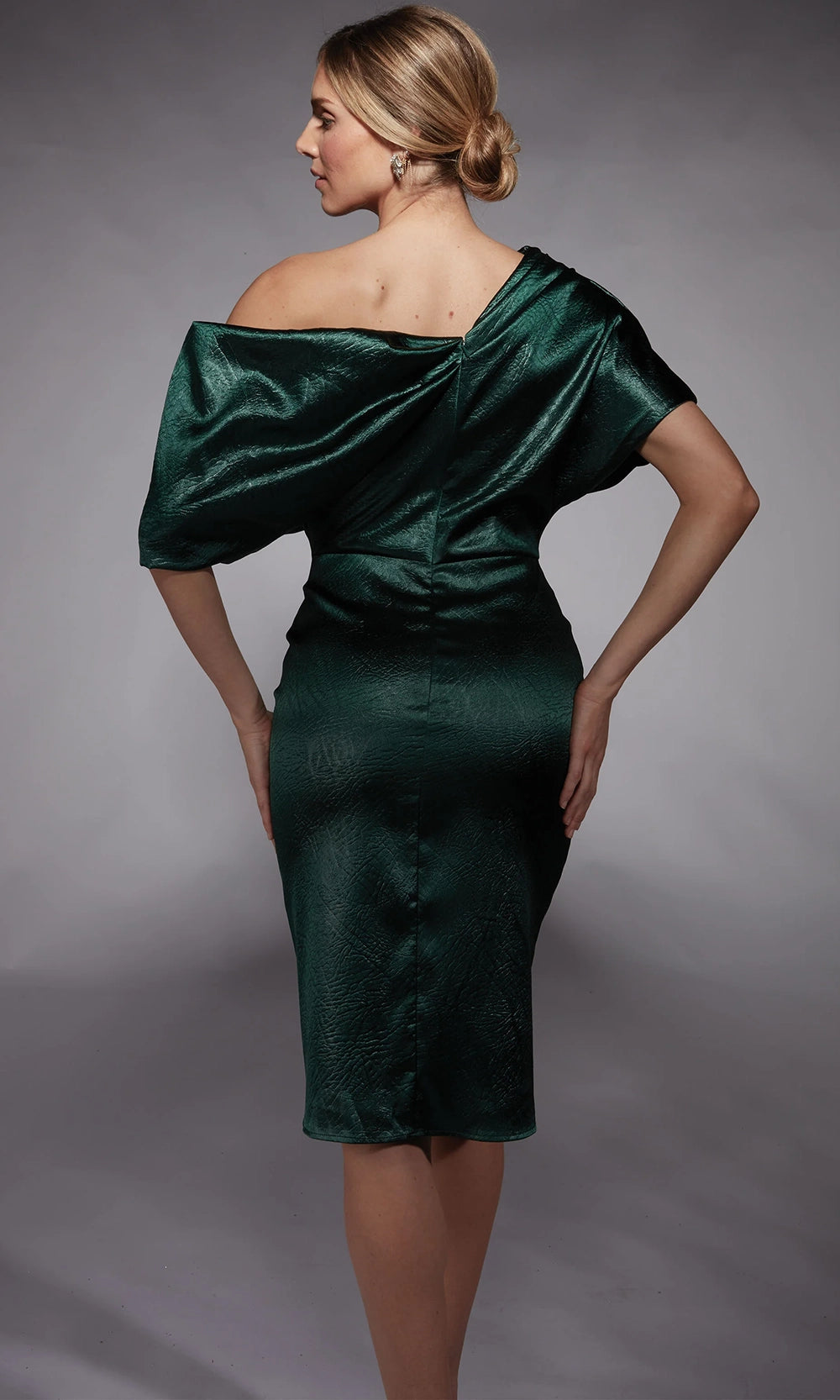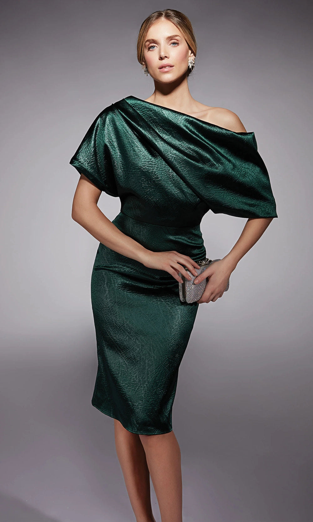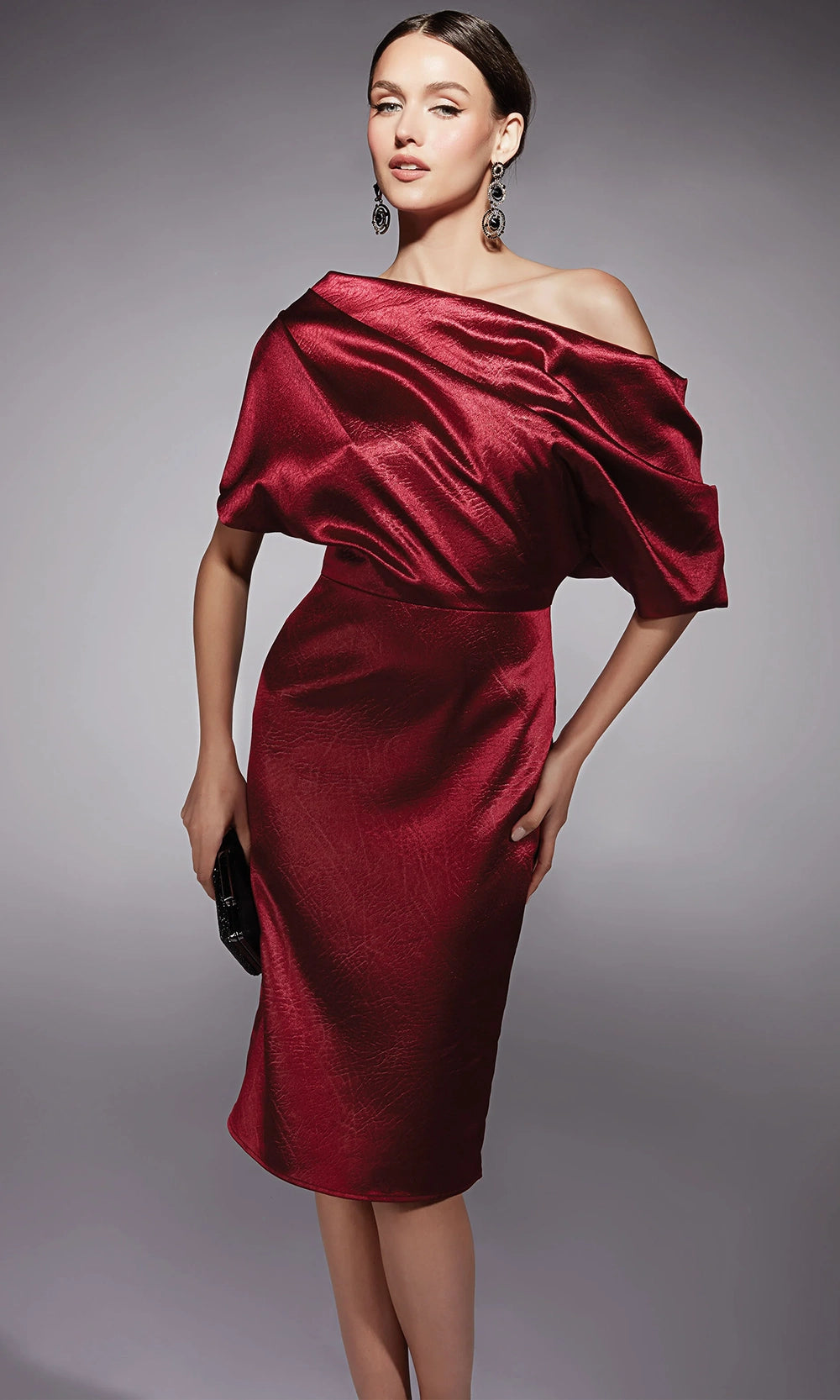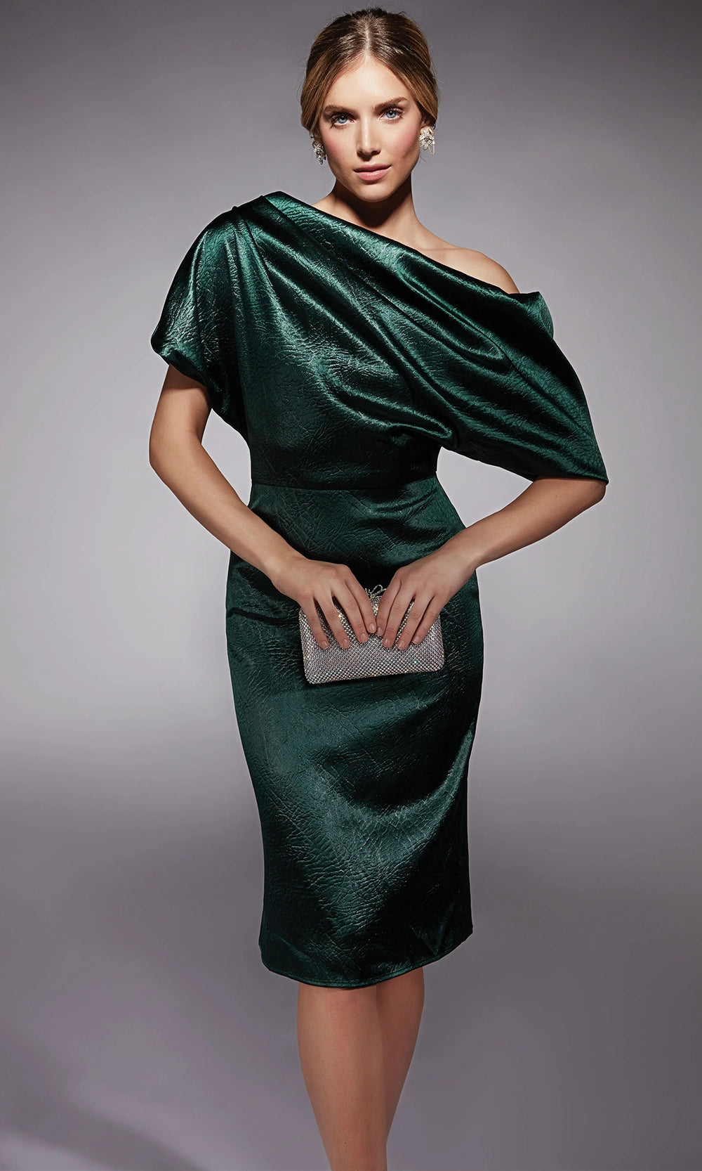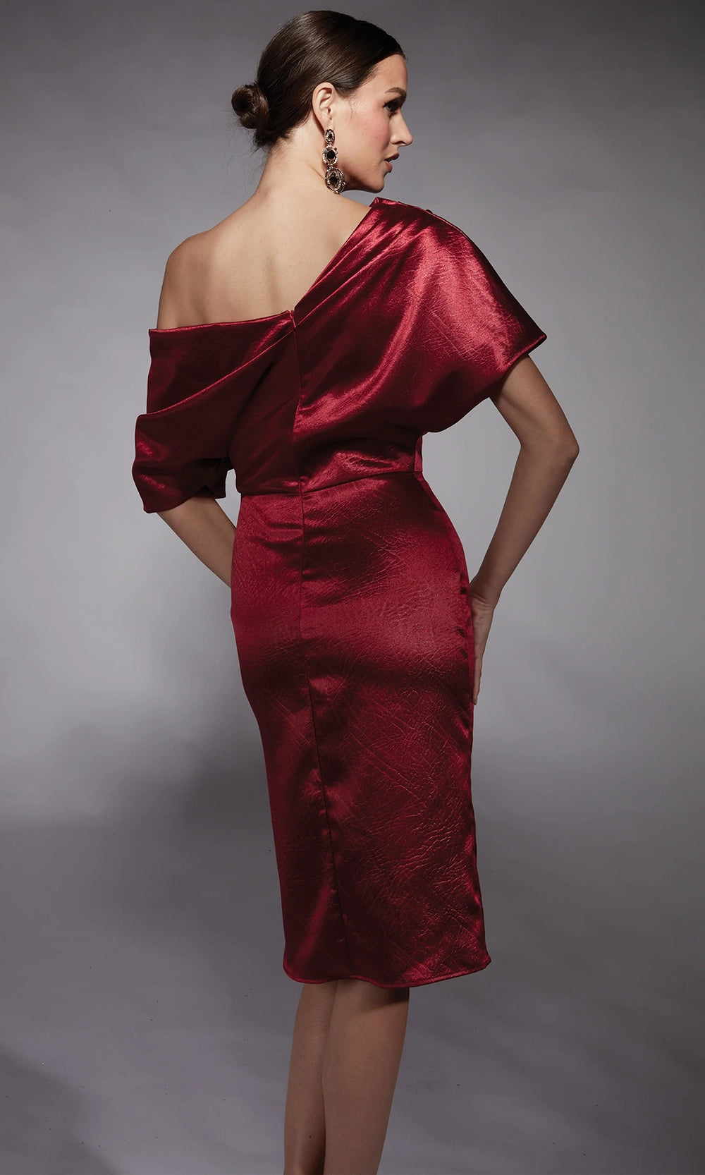 Bold draping and shimmering texture define the statement look of Alyce Paris 70060, a cocktail-length piece with sophisticated edge. The asymmetric neckline and sculpted dolman short sleeves create a dramatic silhouette, while the fitted body highlights the natural waist and hips. Crafted in textured charmeuse with rich depth and dimension, this sheath design balances artistry and structure. Alyce Paris 70060 knee-length dress brings forward-thinking fashion into the spotlight, perfect for women who favor elevated styling with effortless poise. Models are wearing Forest Green, and Wine colors.