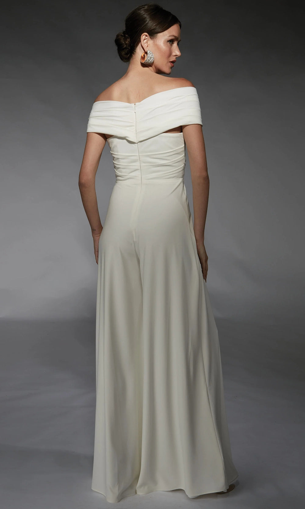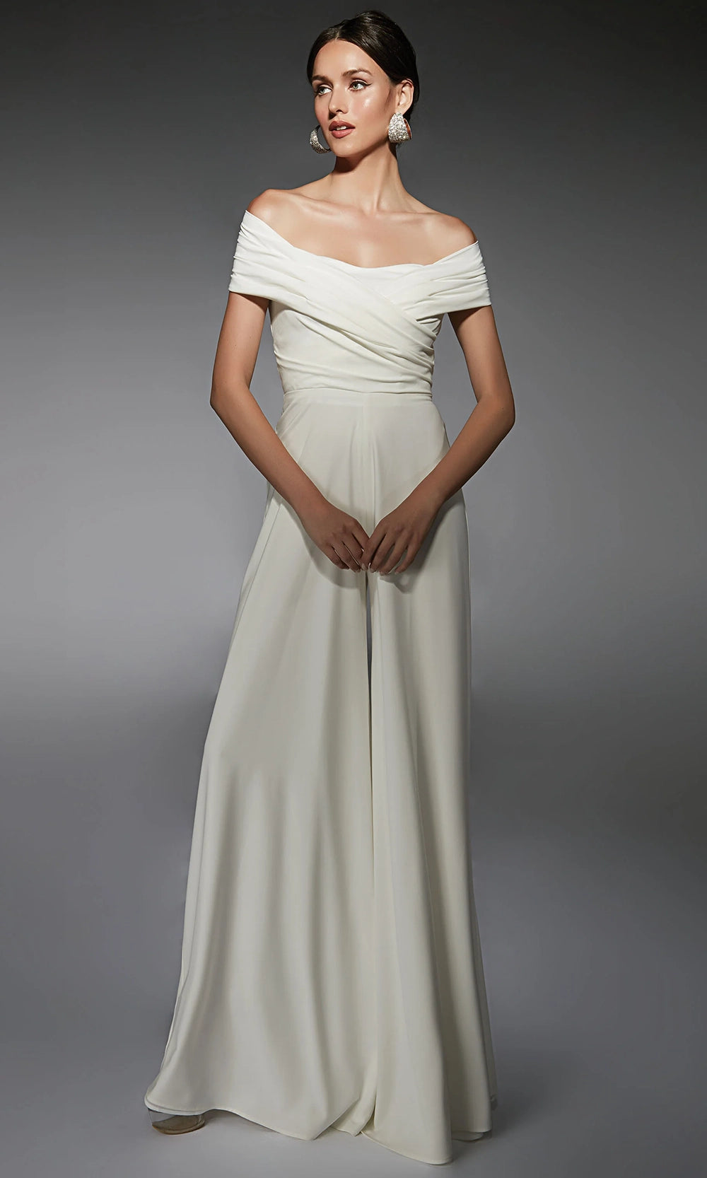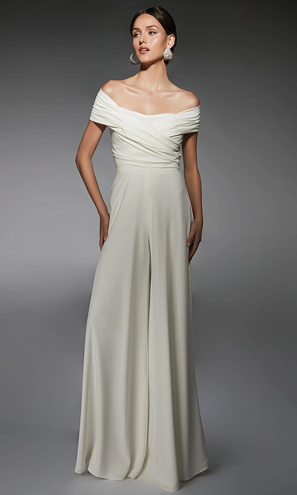Striking in silhouette and smooth in execution, Alyce Paris 70067 offers an elevated take on the modern jumpsuit. The off-shoulder neckline introduces graceful allure, paired with a softly ruched bodice that contours and complements. Crafted in stretch georgette , the fabric stretches comfortably while maintaining shape through wide-leg pants that drape to the floor. It is a perfect fusion of ease and elegance, designed for elevated occasions where movement and form must coexist. Ideal for evenings or contemporary weddings, Alyce Paris 70067 delivers standout appeal without unnecessary excess. Models are wearing Eggplant, and Ivory colors.