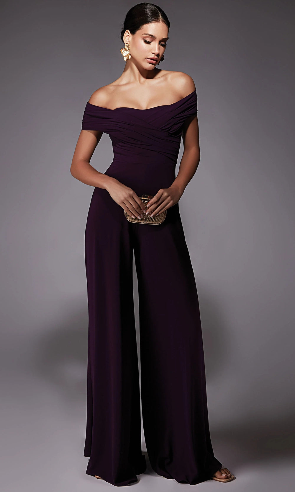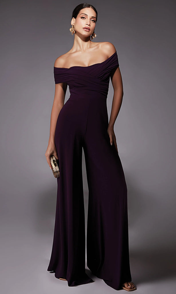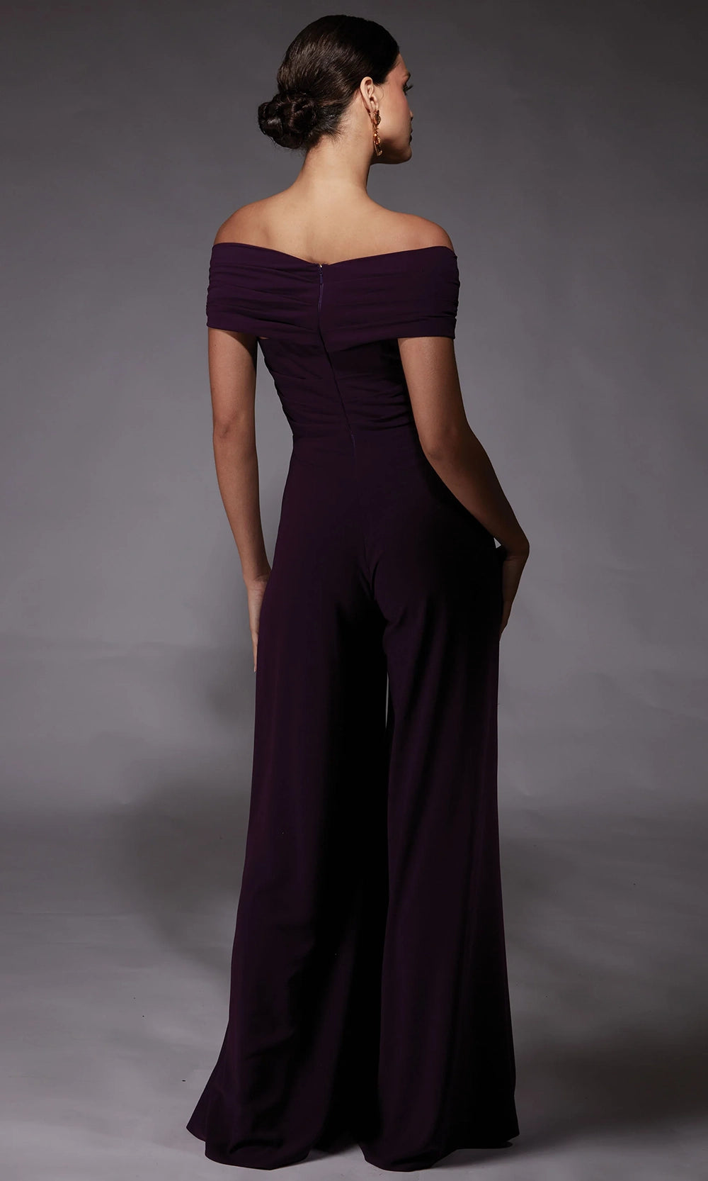 Striking in silhouette and smooth in execution, Alyce Paris 70067 offers an elevated take on the modern jumpsuit. The off-shoulder neckline introduces graceful allure, paired with a softly ruched bodice that contours and complements. Crafted in stretch georgette , the fabric stretches comfortably while maintaining shape through wide-leg pants that drape to the floor. It is a perfect fusion of ease and elegance, designed for elevated occasions where movement and form must coexist. Ideal for evenings or contemporary weddings, Alyce Paris 70067 delivers standout appeal without unnecessary excess. Models are wearing Eggplant, and Ivory colors.