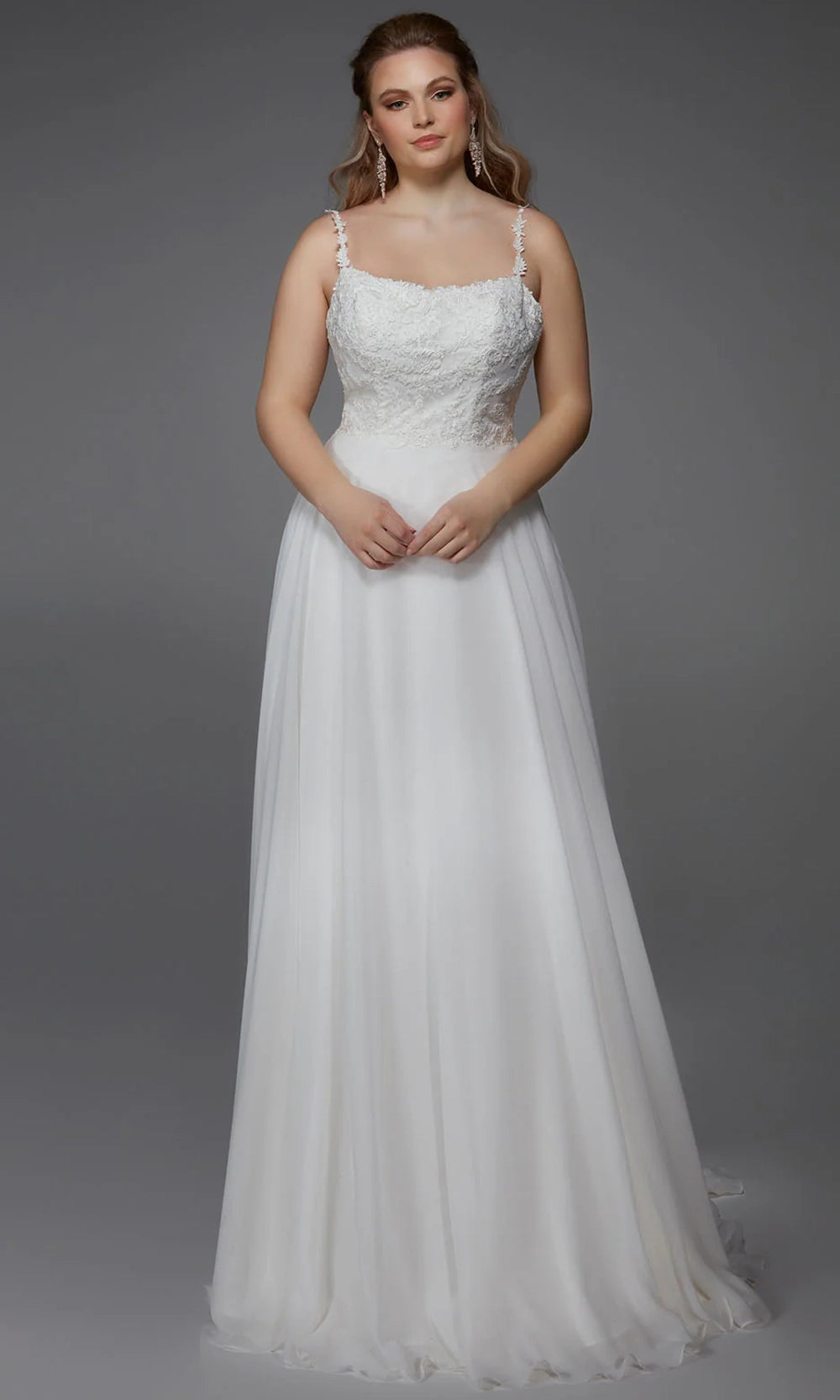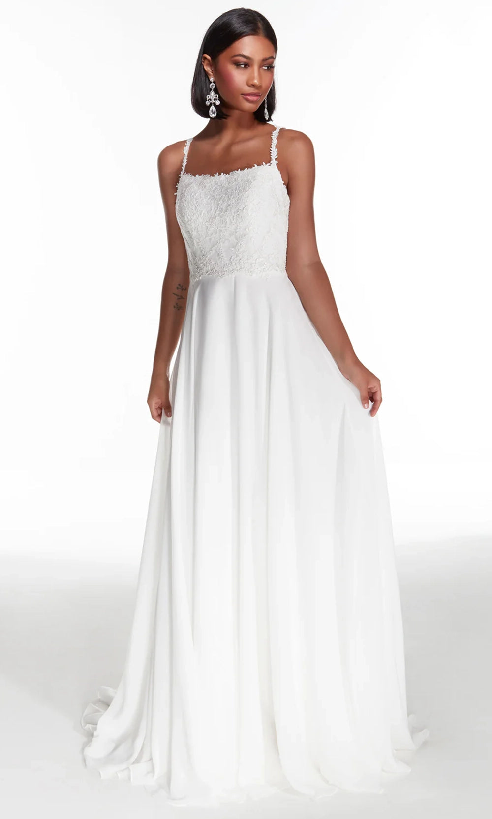 Every bride dreams of this Alyce Paris 7018 lovely gown. It features a charming scoop neckline, lace-up back and appliqued spaghetti straps that gracefully complement the lace-embellished bodice. Crafted in soft lace and tulle, the gown flows into an ethereal A-line skirt ideal for romantic celebrations. With its natural waistline and fluid movement, this ensemble beautifully flatters the figure while creating a dreamy silhouette. Perfect for fairytale weddings or elegant evening affairs, Alyce Paris 7018 brings sophistication and softness to the bridal experience. Model is wearing Diamond White color.